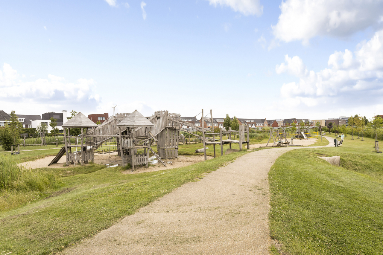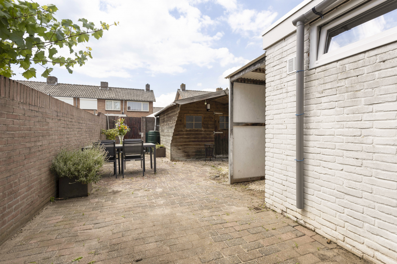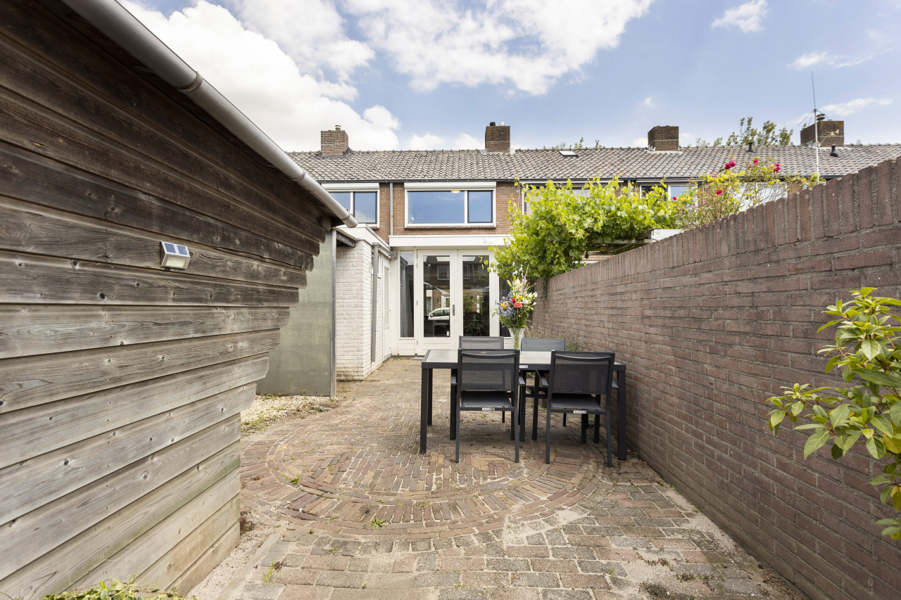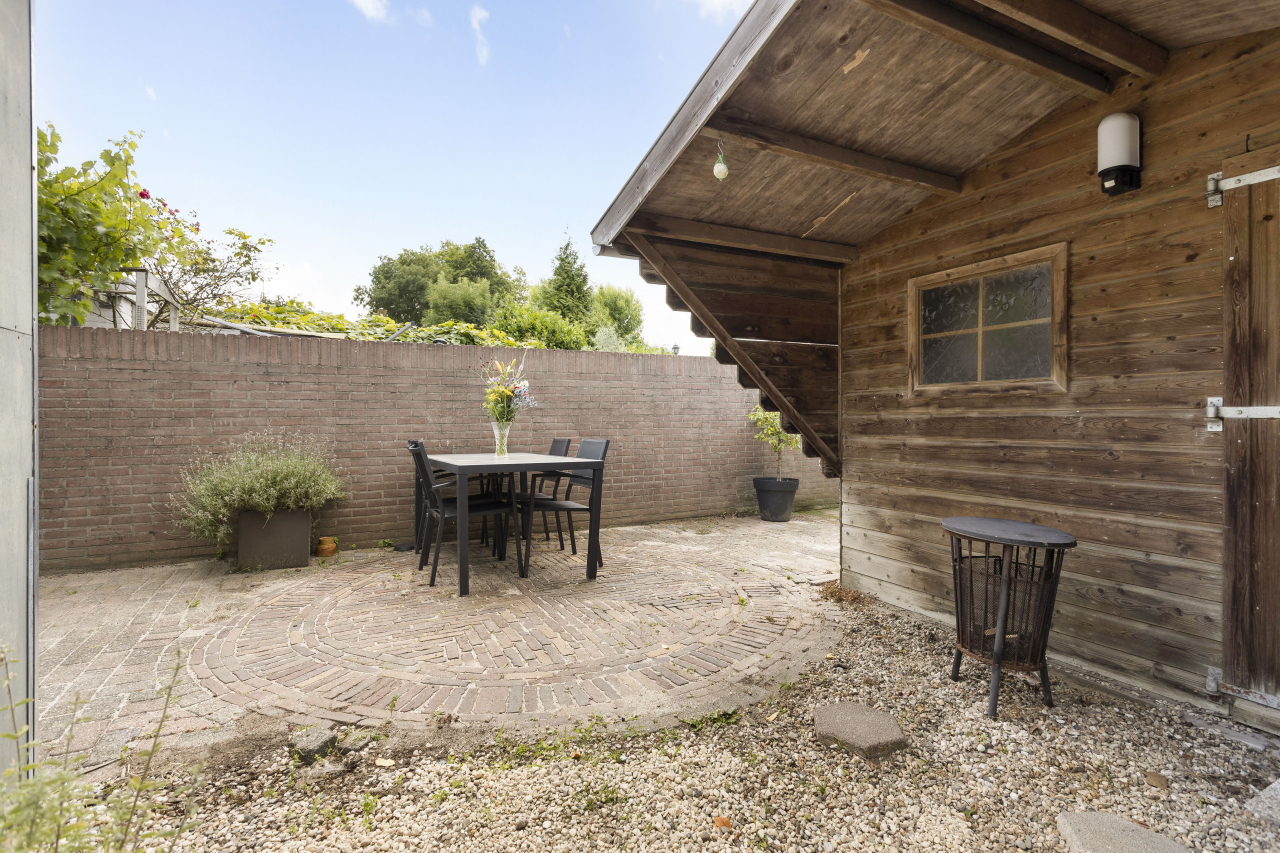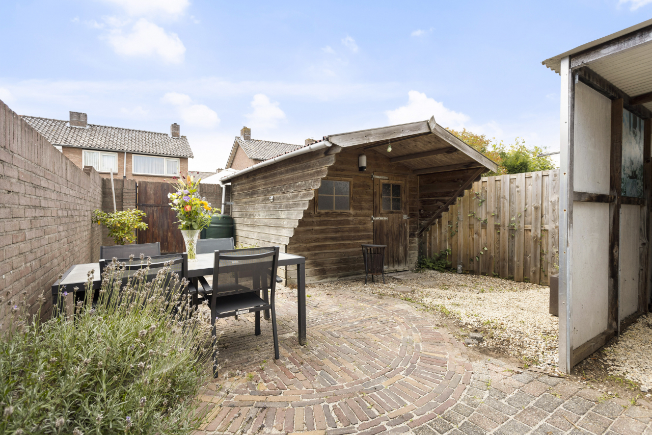 Achter de woning ligt een onderhoudsvriendelijke tuin op het Zuid –Westen met achterom en ruime houten berging.