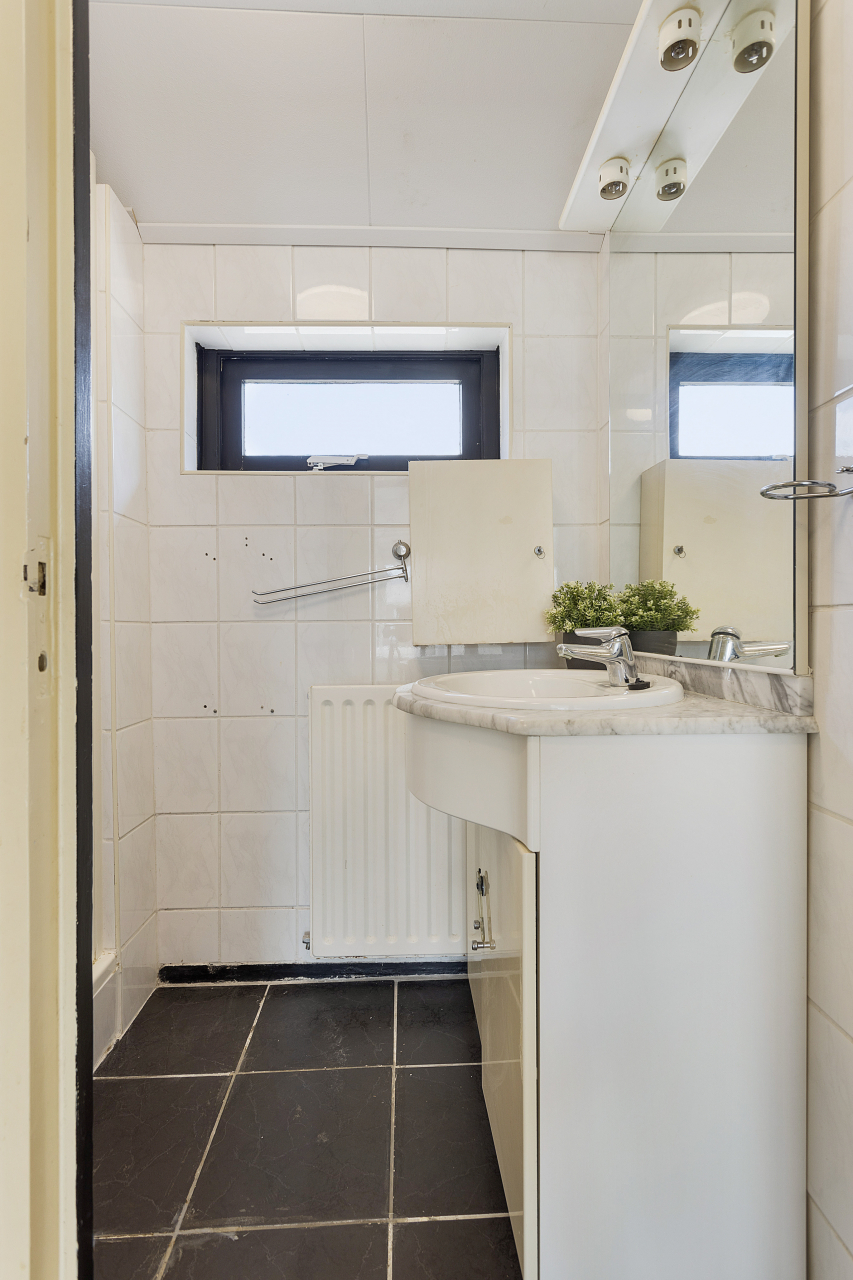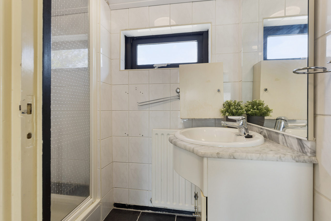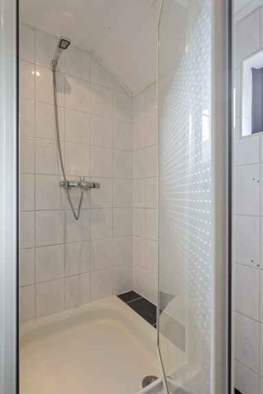 De lichte badkamer met grijze tegelvloer is volledig betegeld en ligt tevens aan de voorzijde. Deze is voorzien van een douche met douchedeur en een wastafelmeubel.