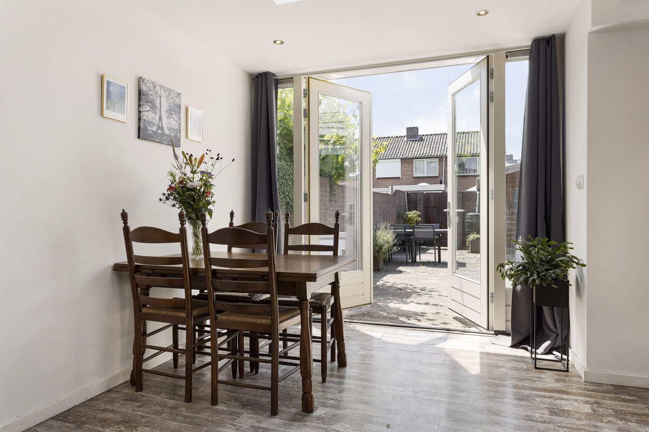 Aan de achterzijde, bij de eethoek zijn mooie openslaande deuren naar het terras en de tuin op het Zuid- Westen.