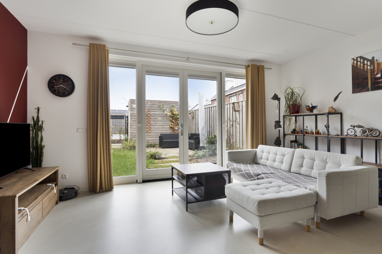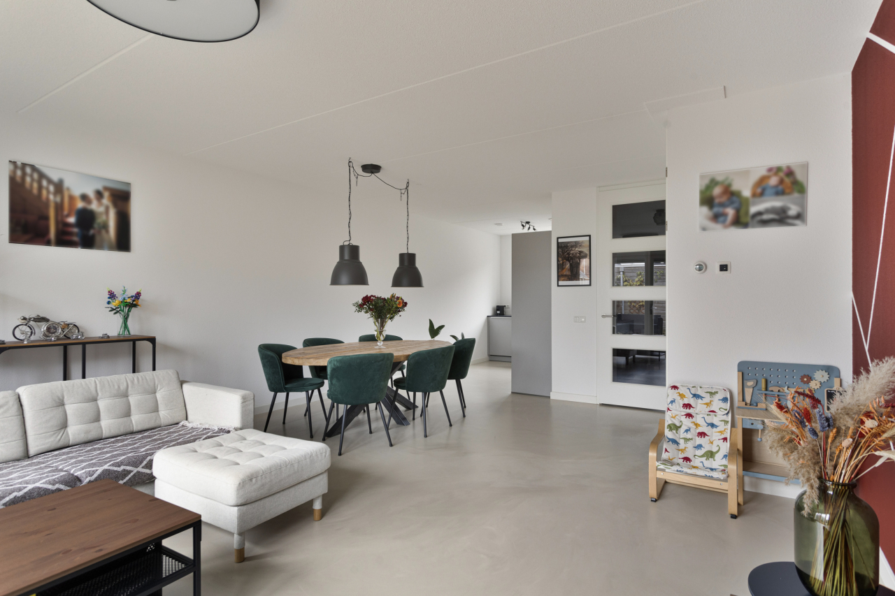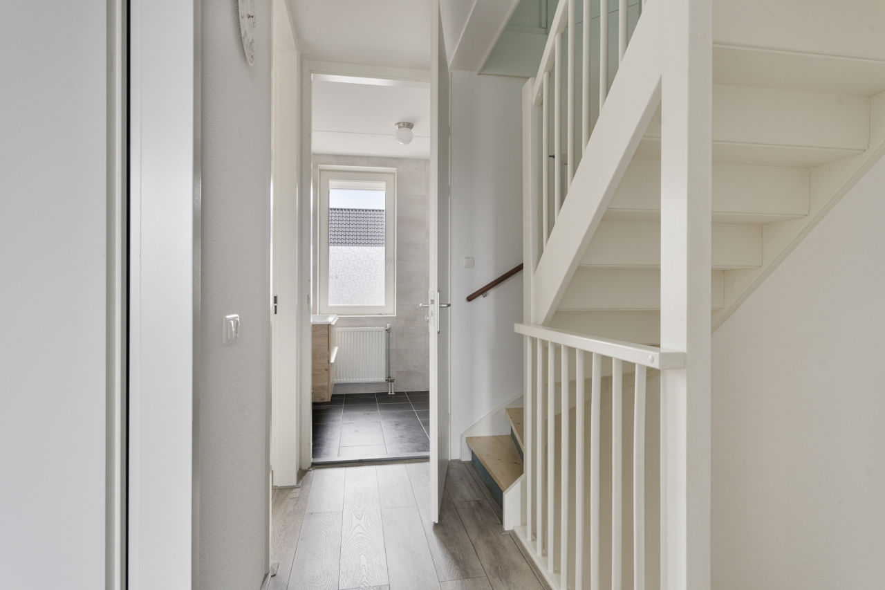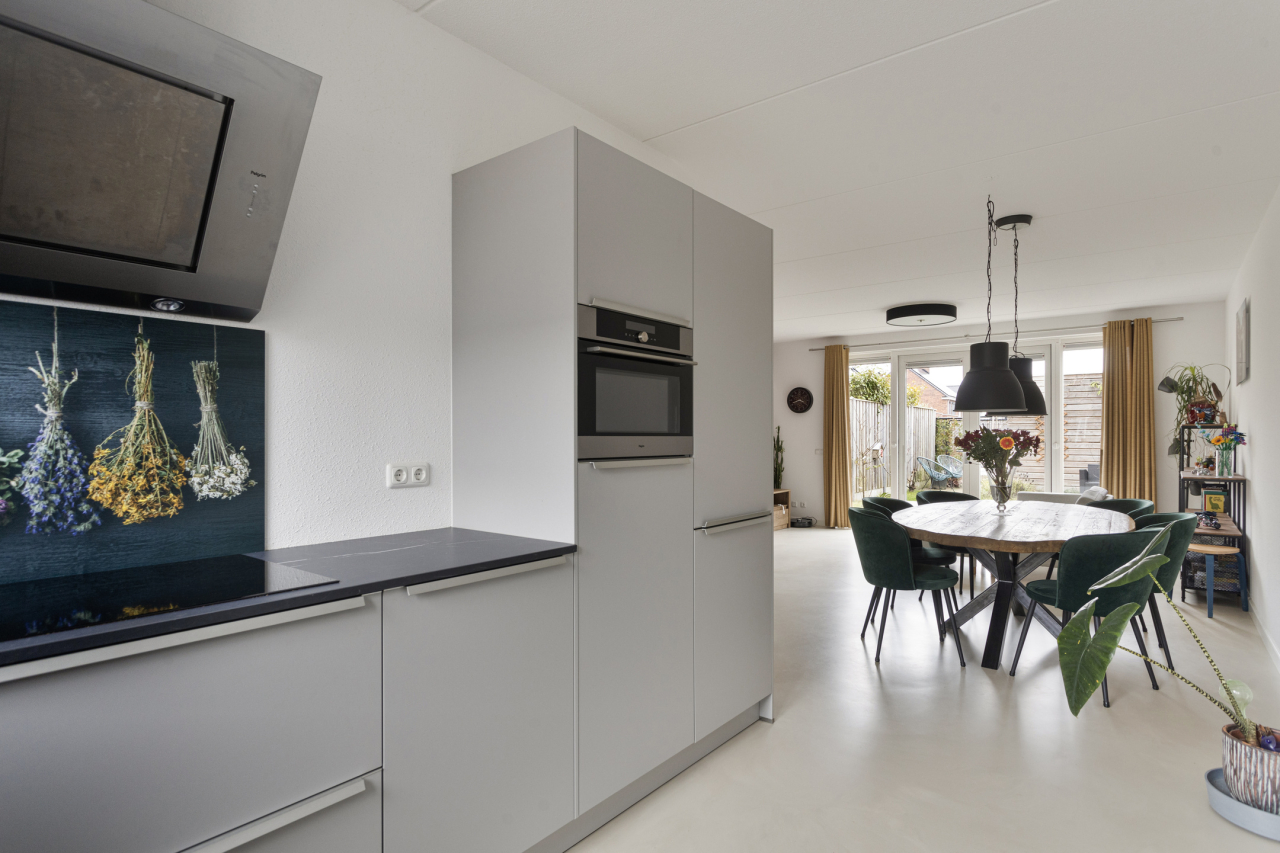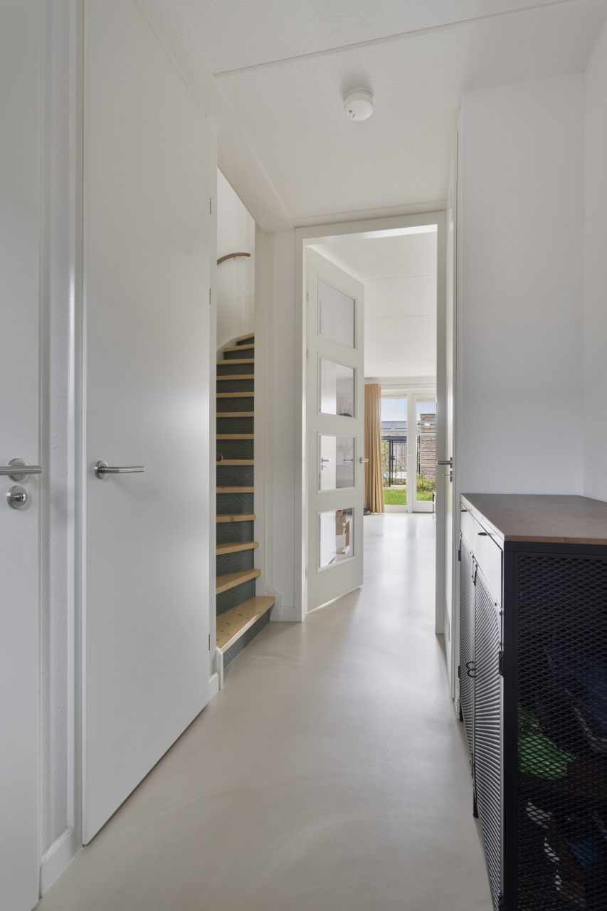 De entree van de woning is aan de voorzijde bij de onderhoudsvriendelijke voortuin. Vanuit de hal met lichte gietvloer, garderobe, trapopgang, kast met CV ketel, meterkast en moderne toilet met fonteintje, is de woonkamer bereikbaar. Let op de fraaie woonkamerdeur met glas voor meer lichtinval. De woonkamer is voorzien van een trapkast en een lichte gietvloer met vloerverwarming. Aan de achterzijde is de zithoek met zicht op de verzorgde tuin. Via de openslaande deuren is het terras en de tuin met houten berging bereikbaar. Aan de voorzijde ligt de eethoek bij de moderne open keuken. Deze strak vormgegeven keuken in L-vorm heeft een aanrechtblad met spoelbak met beweegbare kraan, elektrische screen aan de voorzijde en is voorzien van div. inbouwapparatuur.