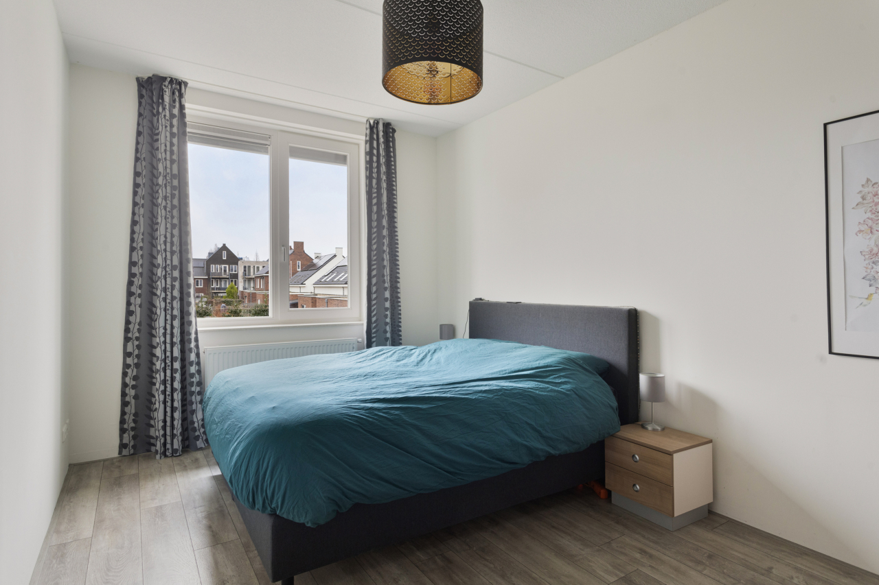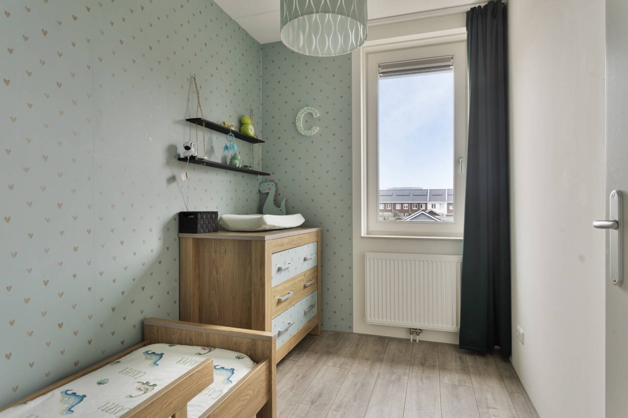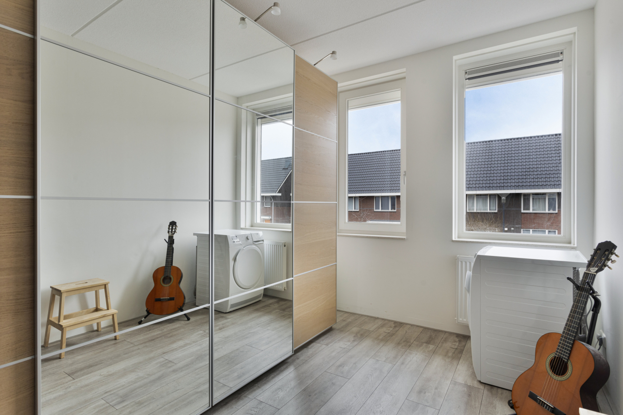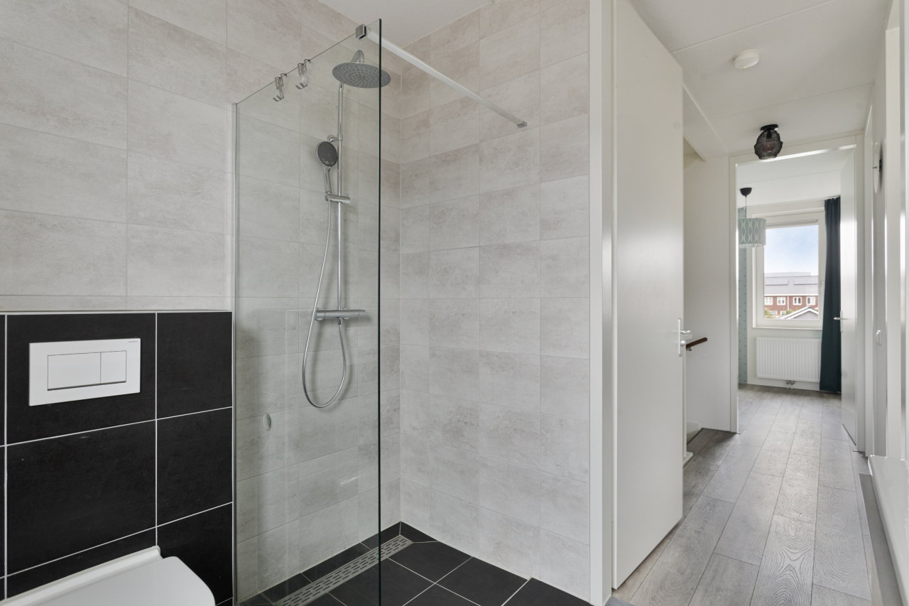 Aan de achterzijde liggen 2 slaapkamers: de ouderslaapkamer en een kinderkamer. Beiden voorzien van elektrische rolluiken. De slaapkamer aan de voorzijde, tevens met elektrisch rolluik, is in gebruik als kastenkamer. Op deze kamer staat tijdelijk de droger, deze kan ook op de zolderverdieping staan. De ruime, volledig betegelde badkamer ook met rolluik, is ingericht met een inloopdouche met regendouche en handdouche. Daarnaast is er een breed wastafelmeubel met grote spiegel en een 2e hangend toilet.