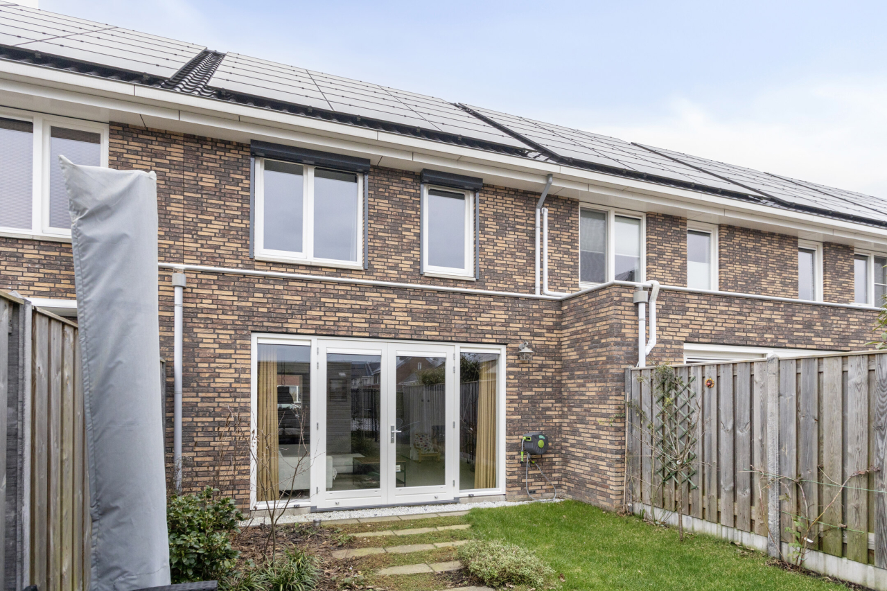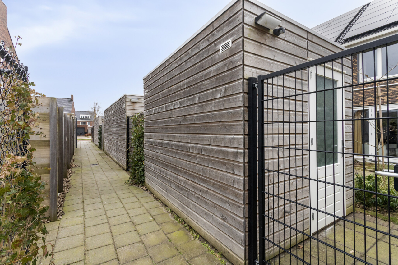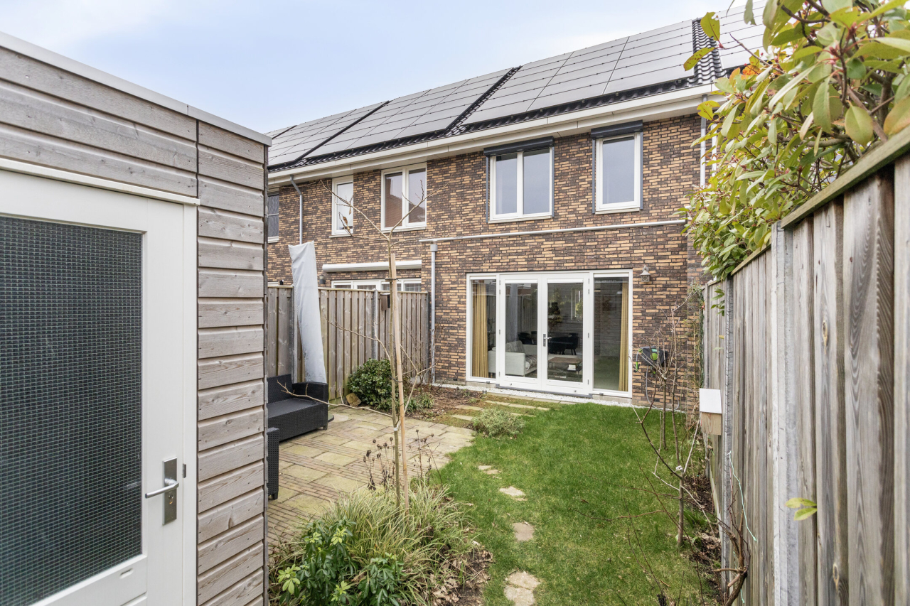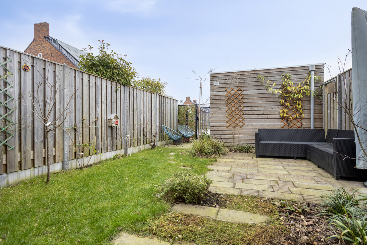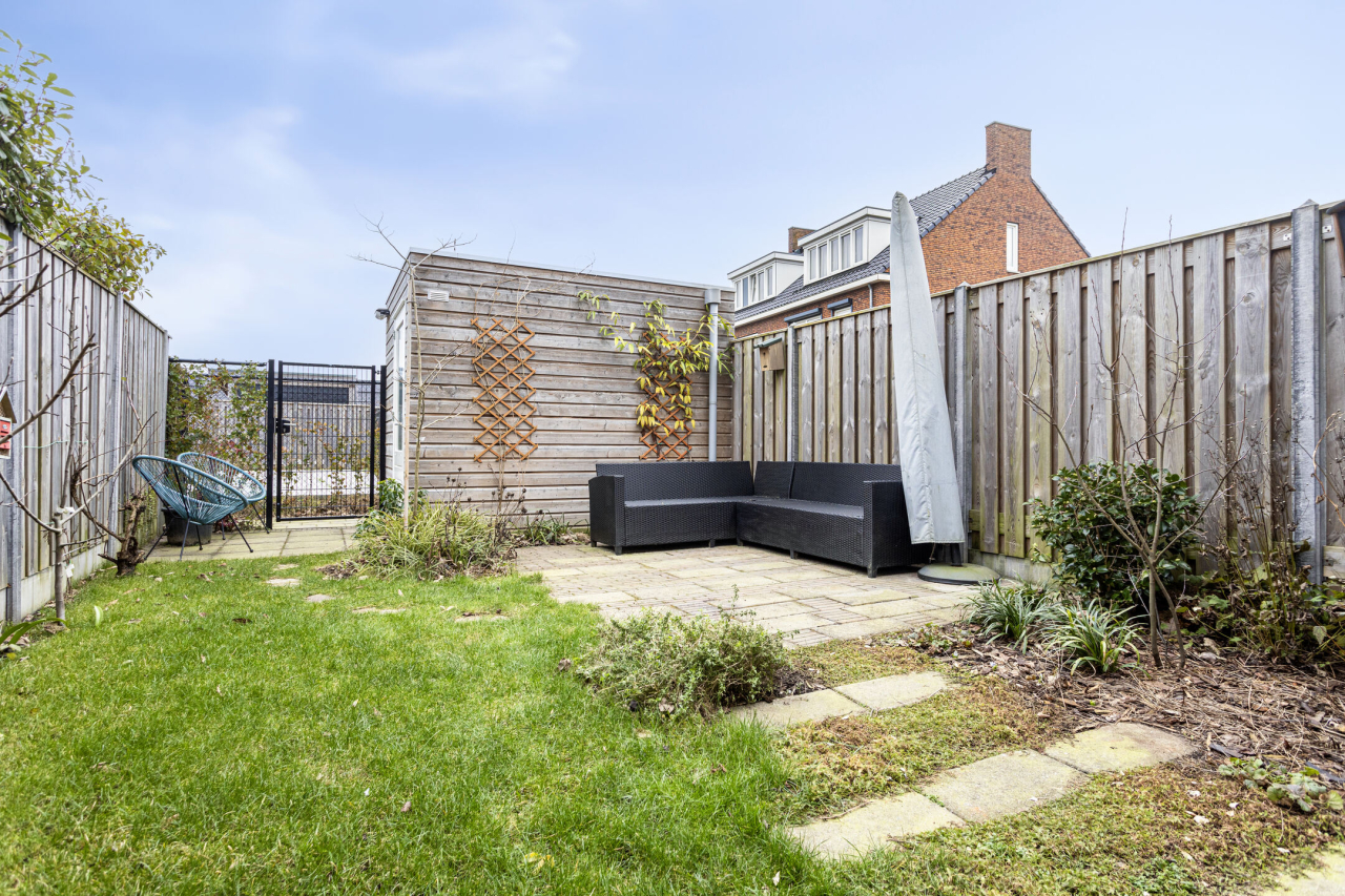 Achter de woning ligt een fraaie, groene tuin met sierbestrating, een gazon, borders met beplanting, struiken en een achterom middels ijzeren sierhekwerk met poort. Verder een zonnig terras voor de houten berging en een terras achterin de tuin.