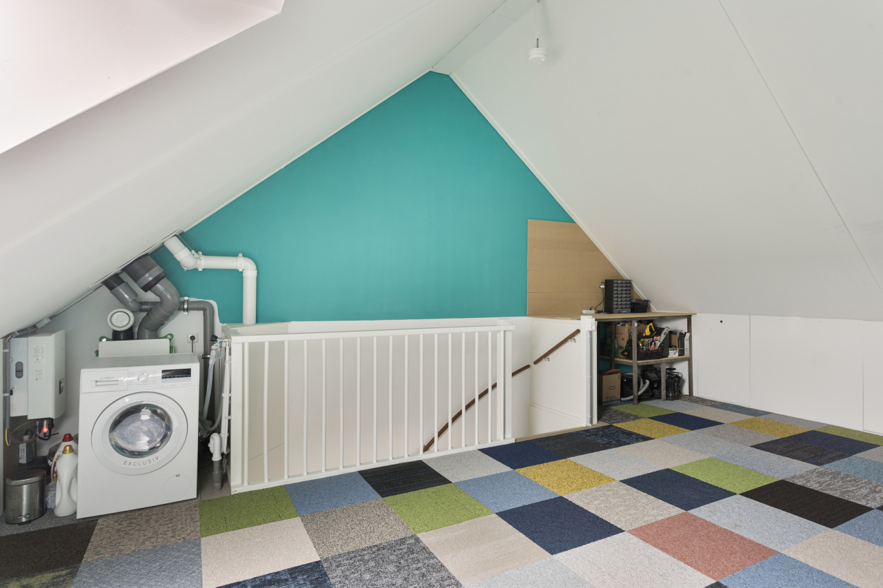 Via een vaste trap is de 2e verdieping bereikbaar met een grote open zolder met dakraam,de witgoedaansluitingen en de omvormer van de zonnepanelen. Tevens is er een mechanische ventilatie unit (Duco). De vloer is voorzien van fleurige tapijttegels.