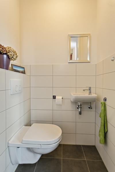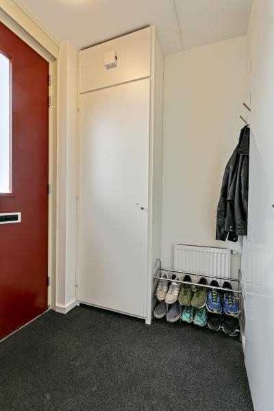Vanuit de lichte hal met de meterkast, garderobe en modern toilet met fonteintje zijn de keuken en woonkamer bereikbaar.