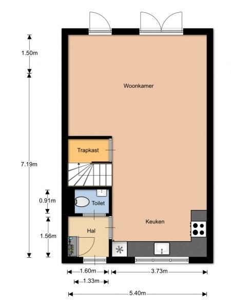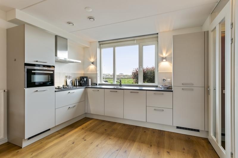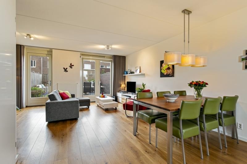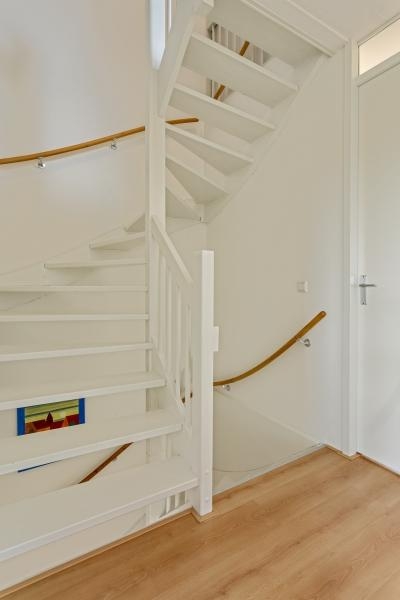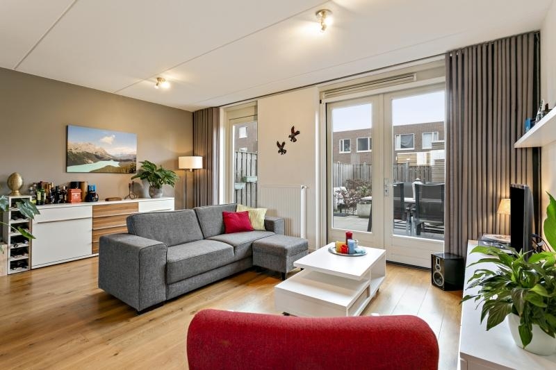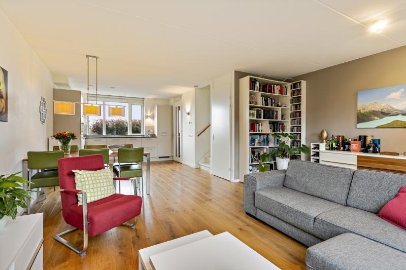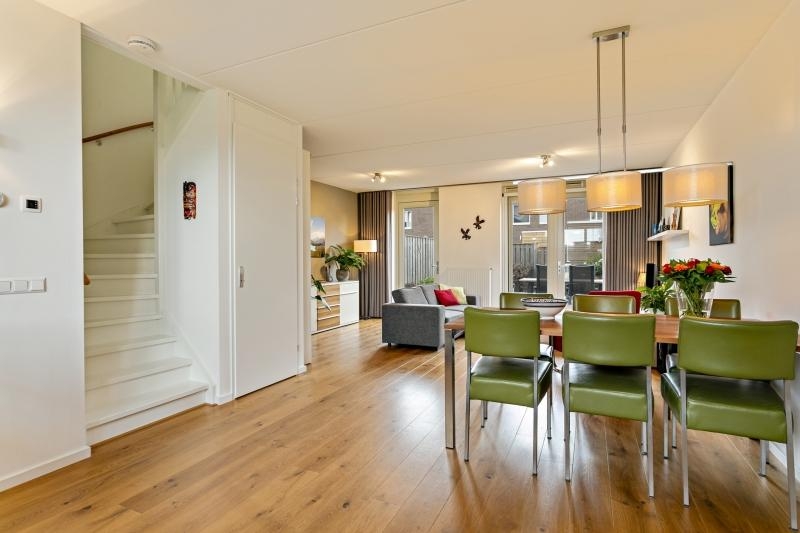 De 1,5 m uitgebouwde woonkamer heeft aan de achterzijde, bij de zithoek openslaande deuren eacute;n een tuindeur naar het terras en de zonnige tuin op het Zuid Westen. Er is tevens een praktische trapkast aanwezig.