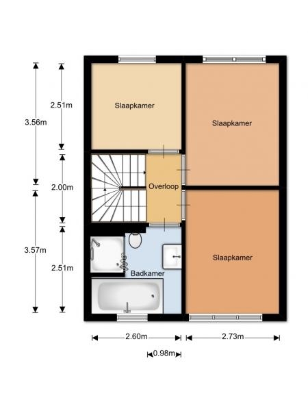 Op de 1e verdieping liggen aan de overloop 3 slaapkamers en de lichte badkamer. Aan de voorzijde een kinderkamer en de badkamer en aan de achterzijde 2 slaapkamers.