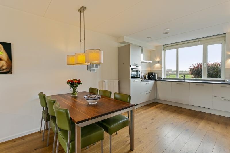 Aan de voorzijde ligt de eethoek en moderne, open keuken in L-vorm met diverse inbouwapparatuur zoals een 4 pits Siemens gastoestel en afzuigschouw, Siemens combi oven/magnetron, vaatwasser, koelkast en vriezer.