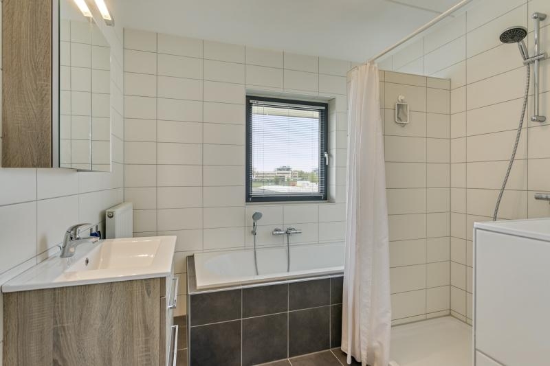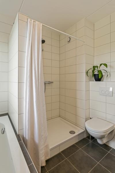 De volledig betegelde badkamer in grijs / wit tinten is ingericht met een ligbad, douche, wastafelmeubel, radiator en 2e hangend toilet.