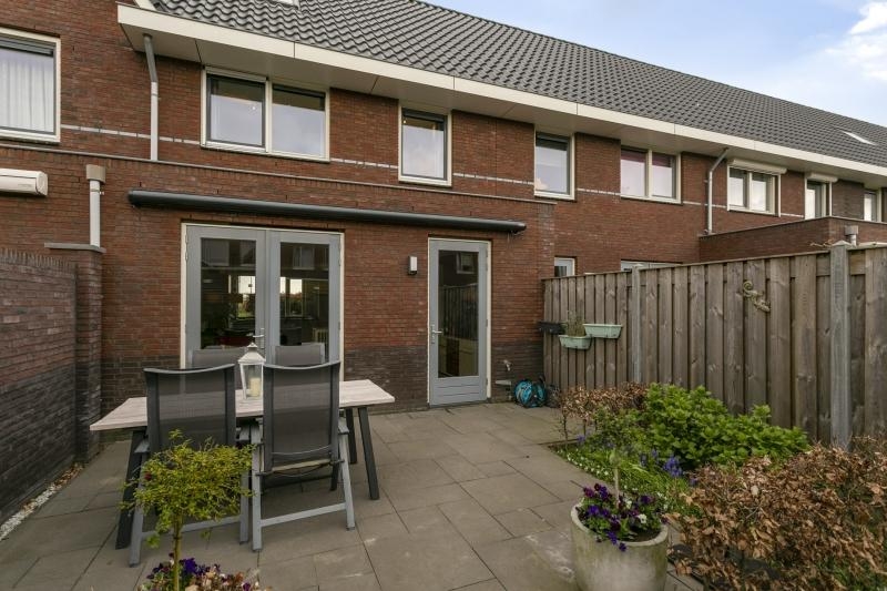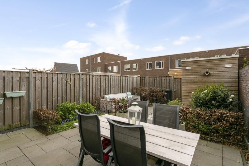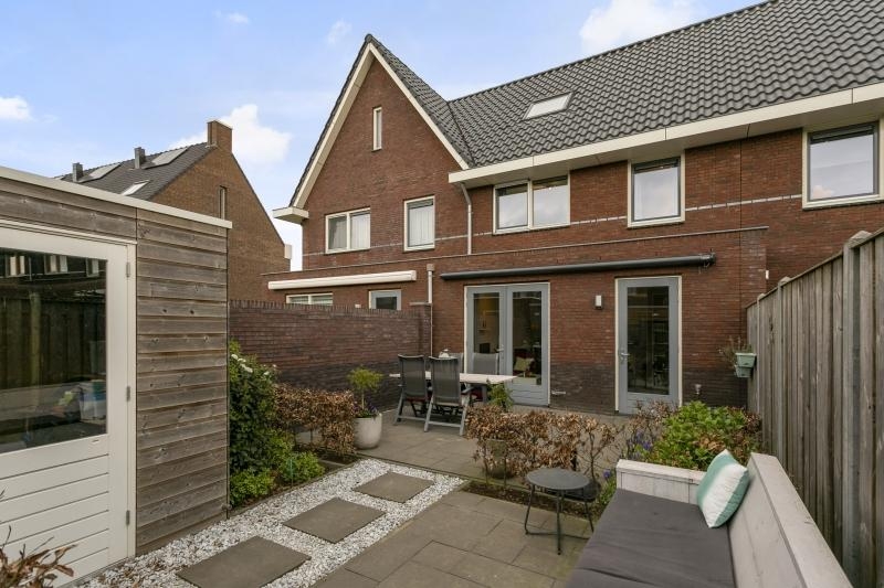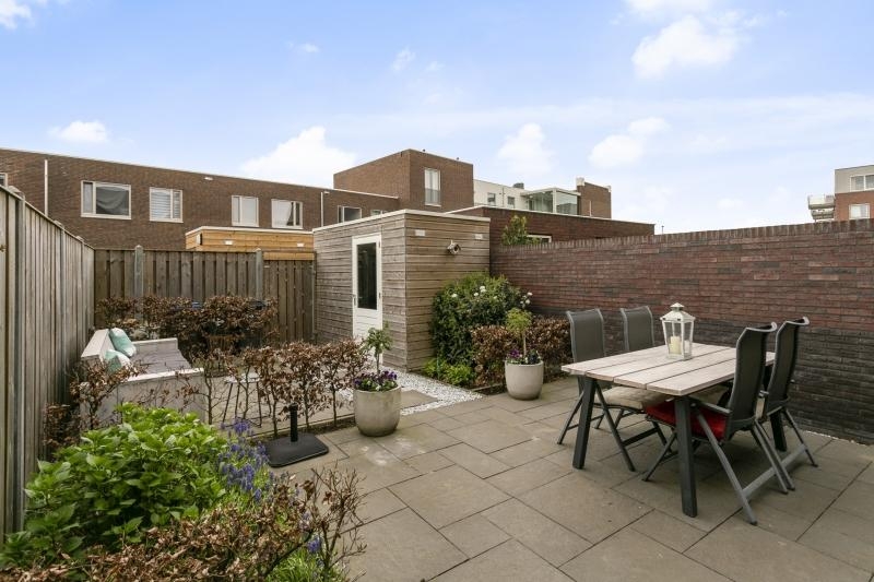 Achter de woning ligt een onderhoudsvriendelijke tuin met berging en achterom. Er is een terras direct achter de woning en achterin de tuin. Verder borders, sierbestrating en vrijstaande houten berging.