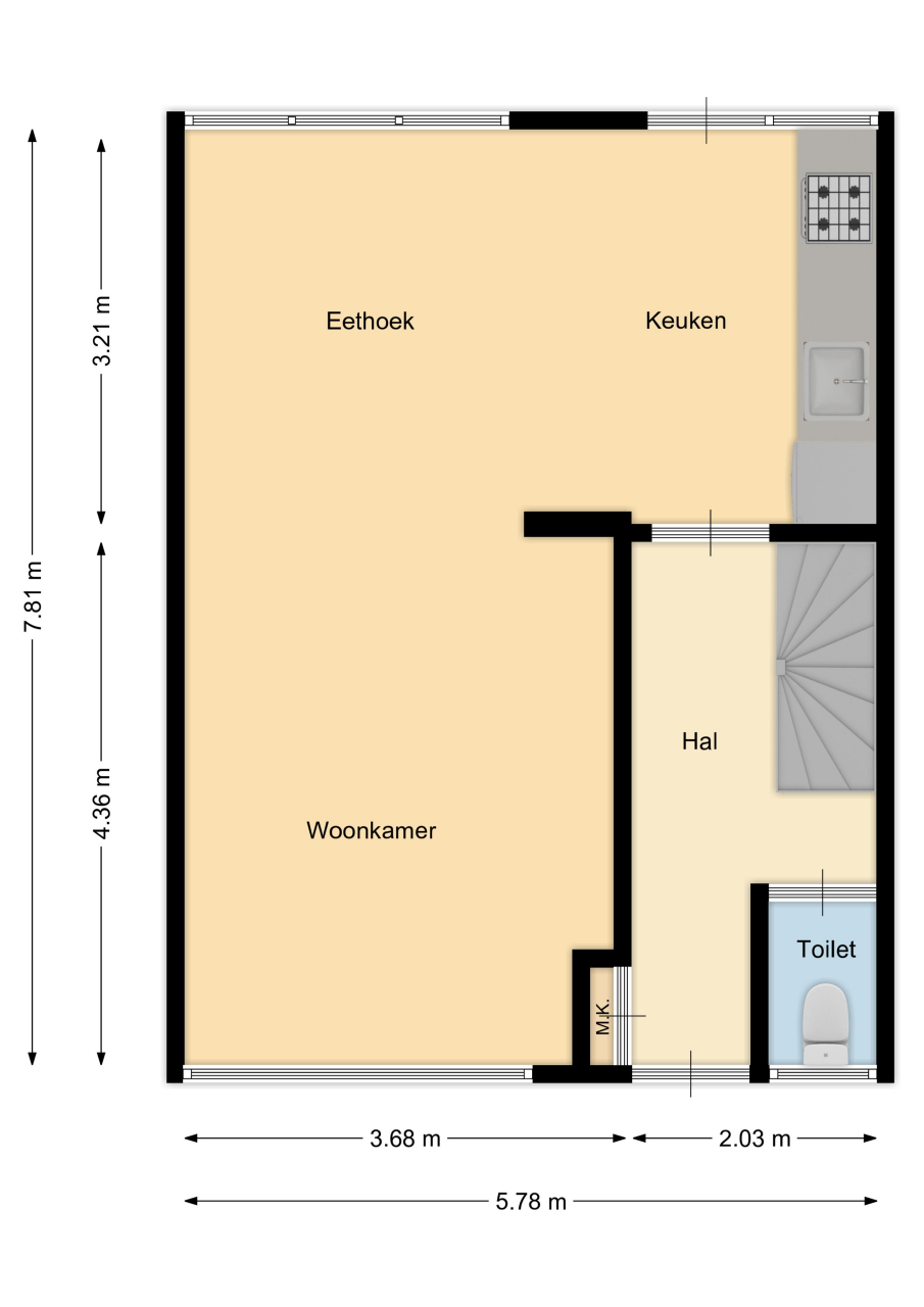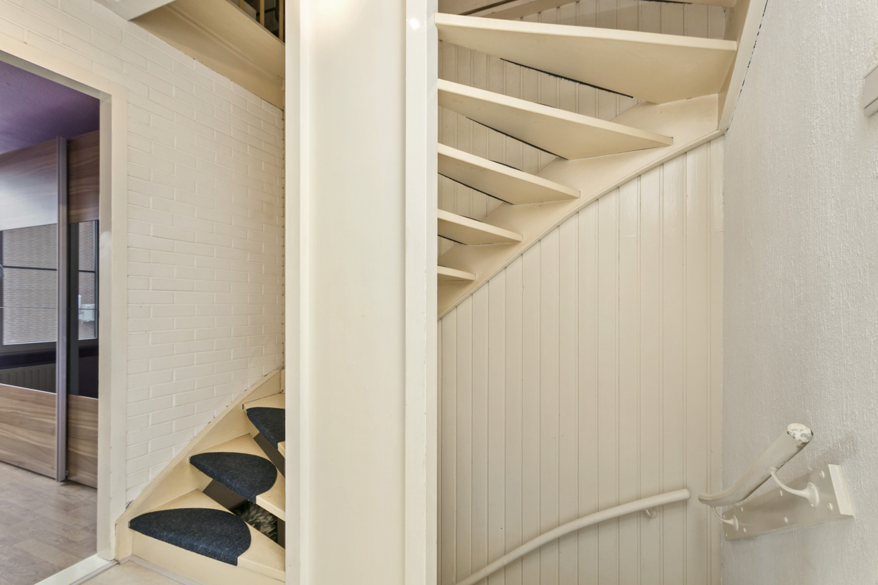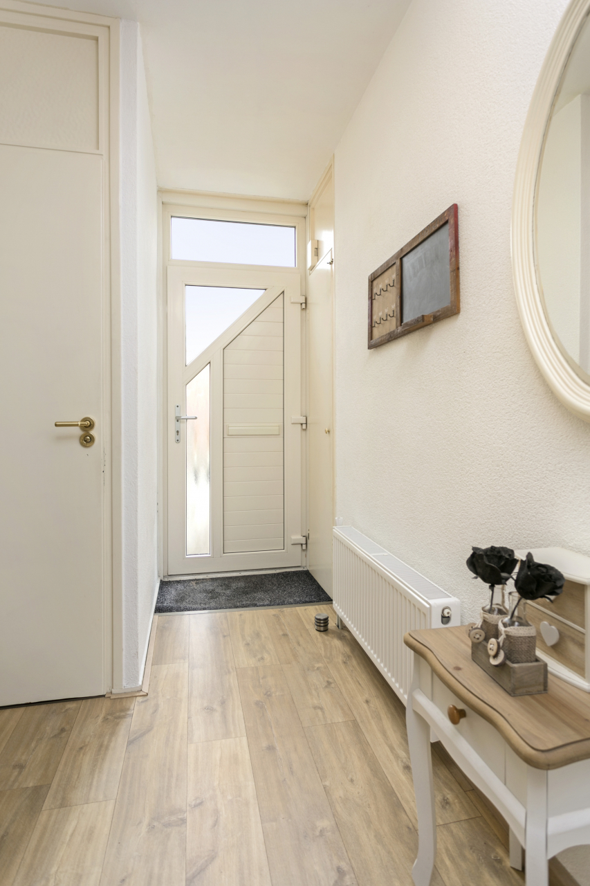 Vanuit de hal met lichte laminaatvloer, trapopgang, garderobe, meterkast en toilet zijn de keuken en woonkamer bereikbaar. De binnendeur met glas zorgt voor extra licht inval in de keuken en hal.