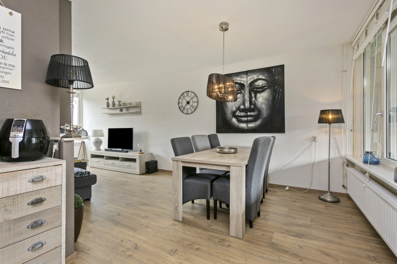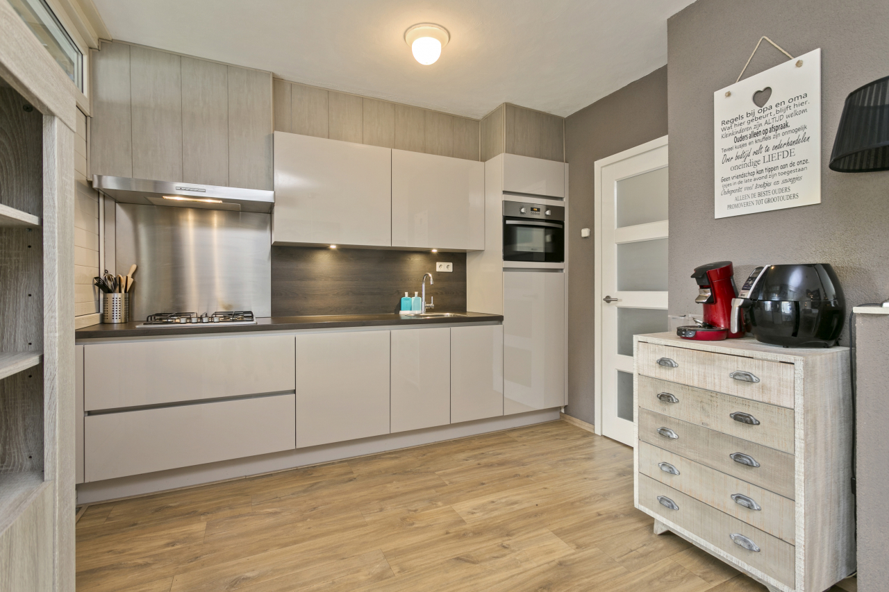 De ruime L-vormige woonkamer met laminaatvloer heeft aan de voor- en achterzijde grote ramen. Aan de voorzijde is de zithoek met zicht op de voortuin en groenstrook.Aan de achterzijde is de eethoek bij de open keuken. Deze moderne, lichte keuken (2018) is voorzien van een aanrechtblad met spoelbak, fraaie kraan, keukenkasten en inbouwapparatuur zoals een 4 pits gastoestel en RVS afzuigkap. Een combi oven/magnetron, vaatwasmachine, koelkast en close-in boiler. Er is tevens een deur naar de tuin en het terras met overkapping.