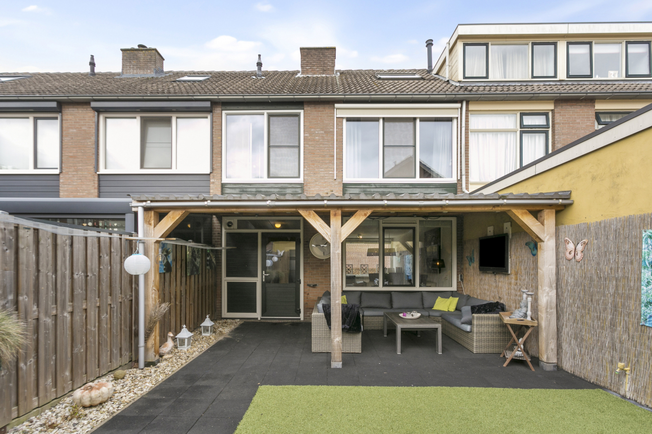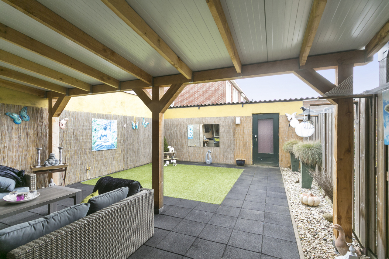 Achter de woning ligt een zonnige onderhoudsvriendelijke tuin op het Zuiden met groot terras met overkapping en achterom. Verder sierbestrating, siergrind en kunstgras. Achterin de tuin staat een grote stenen schuur met achterom, voor fietsen enz.