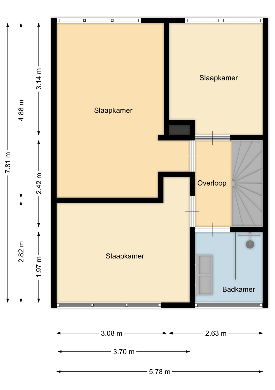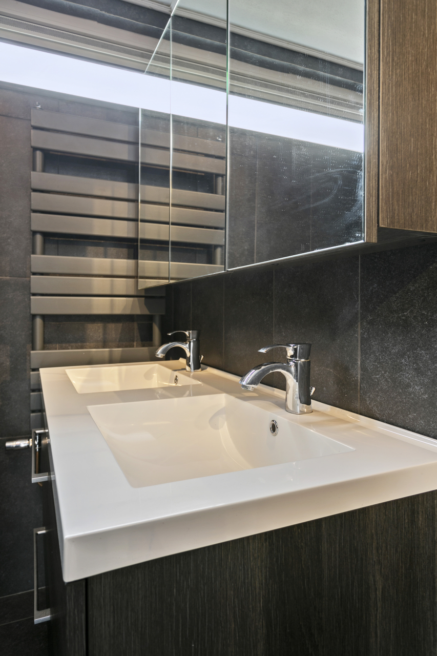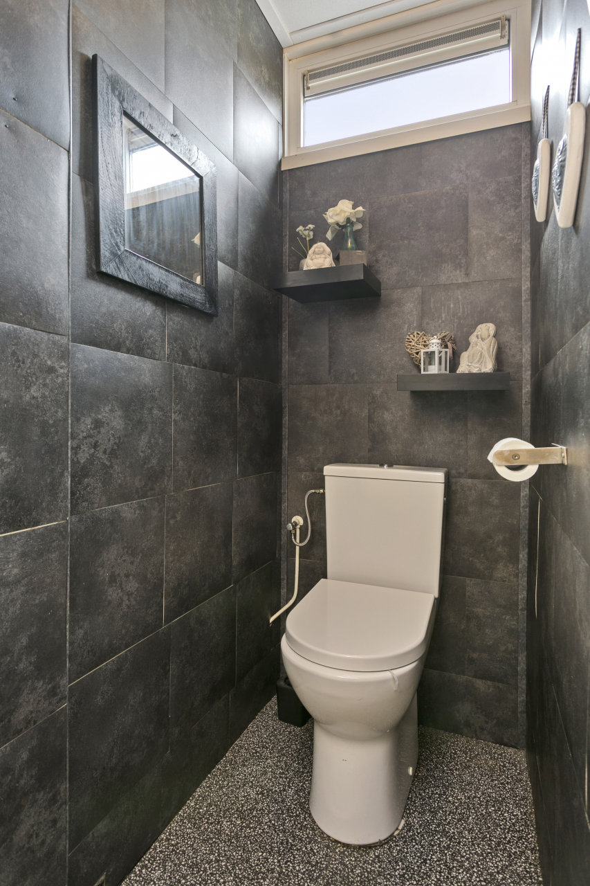 De slaapkamer aan de voorzijde ligt naast de badkamer en is ook voorzien van een laminaatvloer en grote (kunststof) ramen. De kleinste slaapkamer aan de achterzijde is op dit moment in gebruik als kastenkamer en is voorzien van een inbouwkast. De moderne, volledig betegelde badkamer aan de voorzijde is ingericht met een dubbel wastafelmeubel, een designradiator en een inloopdouche met regendouche en handdouche.