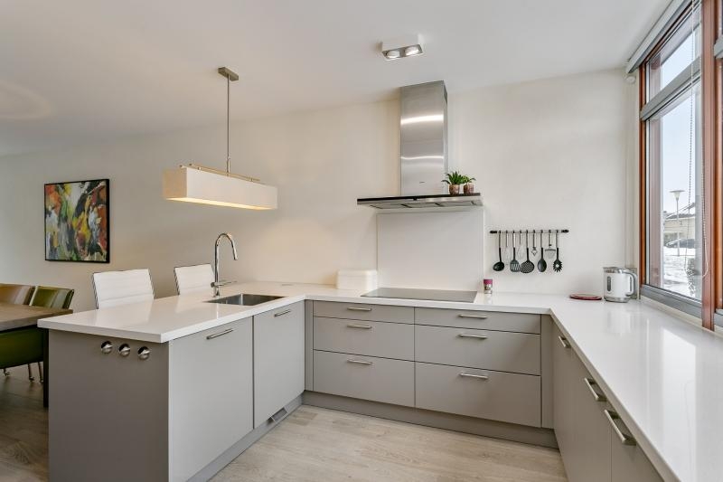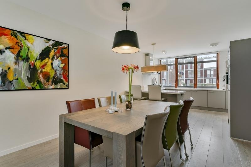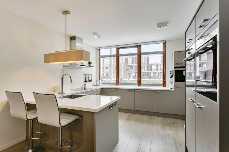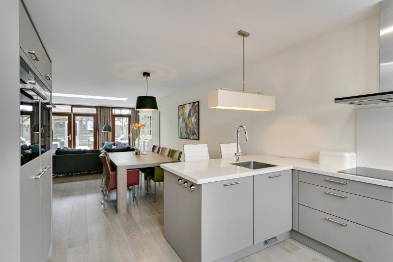 Aan de voorzijde is de moderne, luxe keuken met composiet aanrechtblad, spoeleiland en Siemens inbouwapparatuur zoals een 5-pits inductiekookplaat, -afzuigschouw, -vaatwasser, -koelkast en - vriezer, - oven, - combimagnetron en - koffiezetapparaat. Ook hier loopt de lichte laminaatvloer met vloerverwarming door.