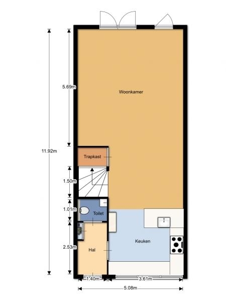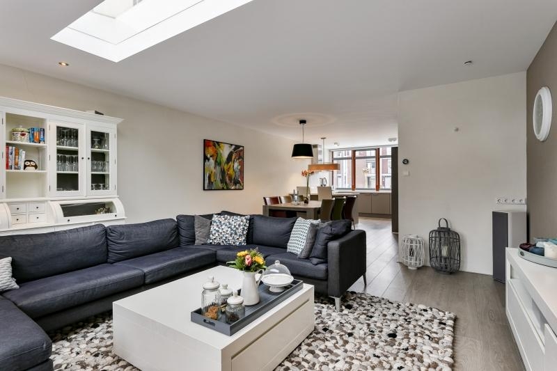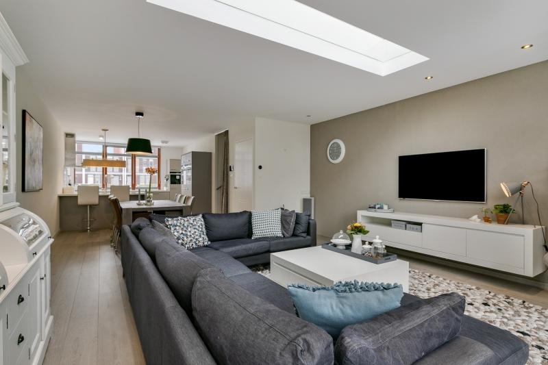 Aan de voorzijde van de woning is de moderne, luxe keuken en aan de achterzijde de 3,5 meter uitgebouwde woonkamer met laminaat met vloerverwarming. Aan de achterzijde is de zithoek gecreeerd met een tuindeur, openslaande deuren en zicht op de tuin. Er is tevens een trapkast aanwezig en trapopgang naar de 1e verdieping.
