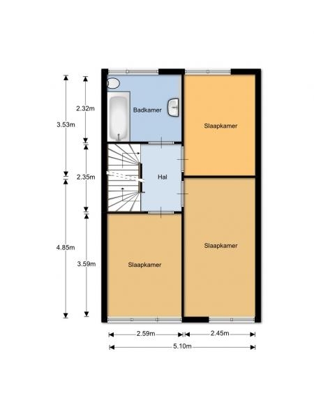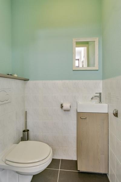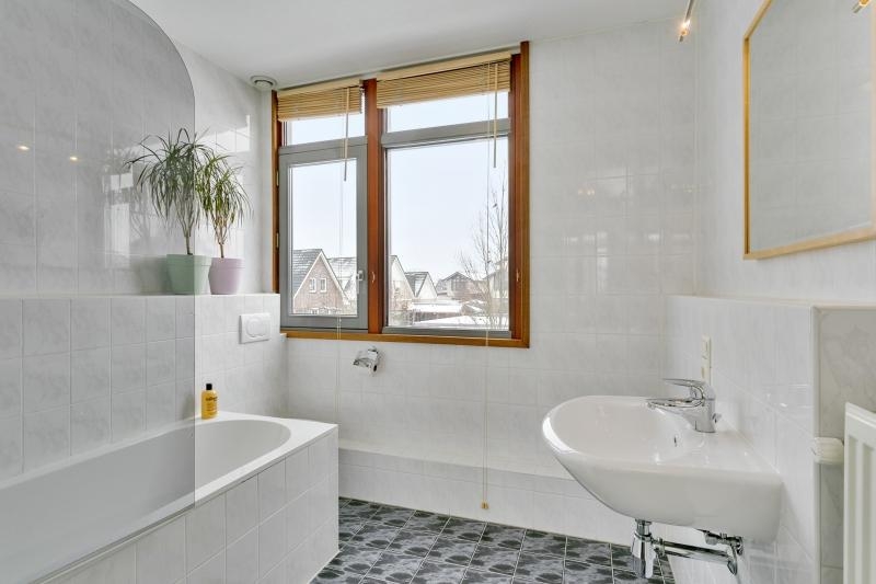 Aan de achterzijde ligt de 3e slaapkamer en de lichte badkamer. Deze volledig betegelde 1e badkamer is voorzien van een ligbad met douche, wastafel en 2e hangend toilet.