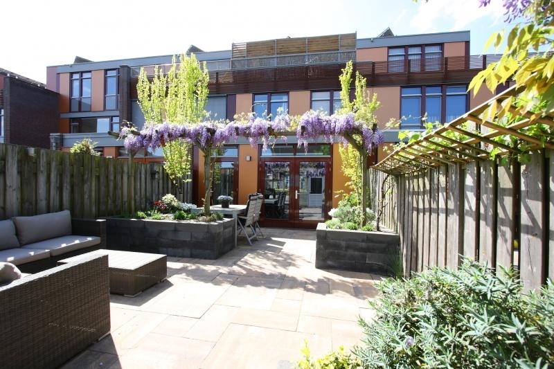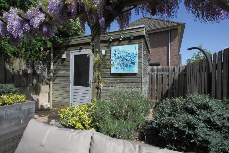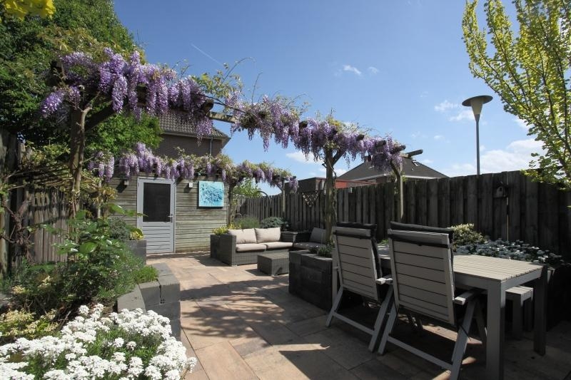 Achter de woning ligt een onderhoudsvriendelijke tuin op het oosten met sierbestrating en diverse planten bakken/borders. Er is tevens een vrijstaande houten berging en een achterom met extra brede poort.