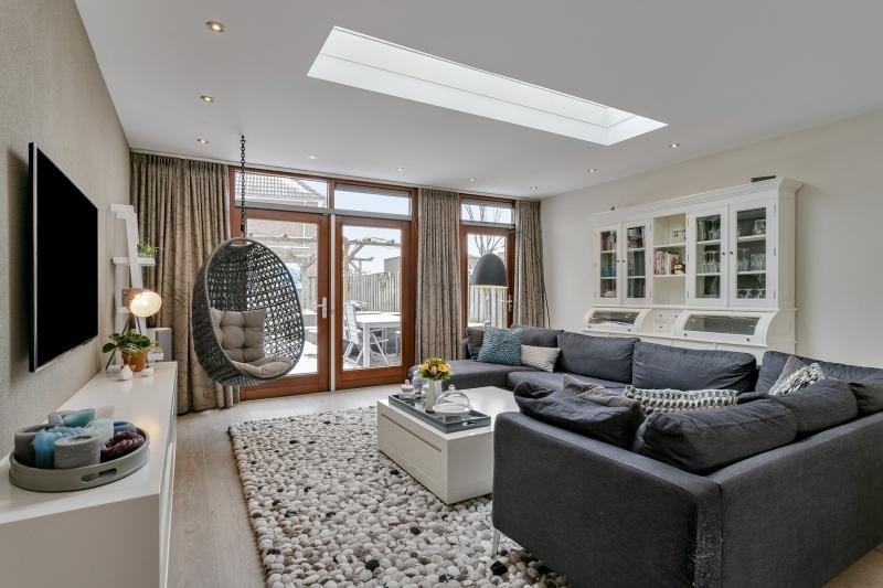 De lichtstraat in de woonkamer zorgt voor een mooie lichtinval. In de trapkast is extra bergruimte en zijn de CV HR ketel, zonneboiler en unit van de vloerverwarming (b.g. en badkamer 2e verdieping) aanwezig.