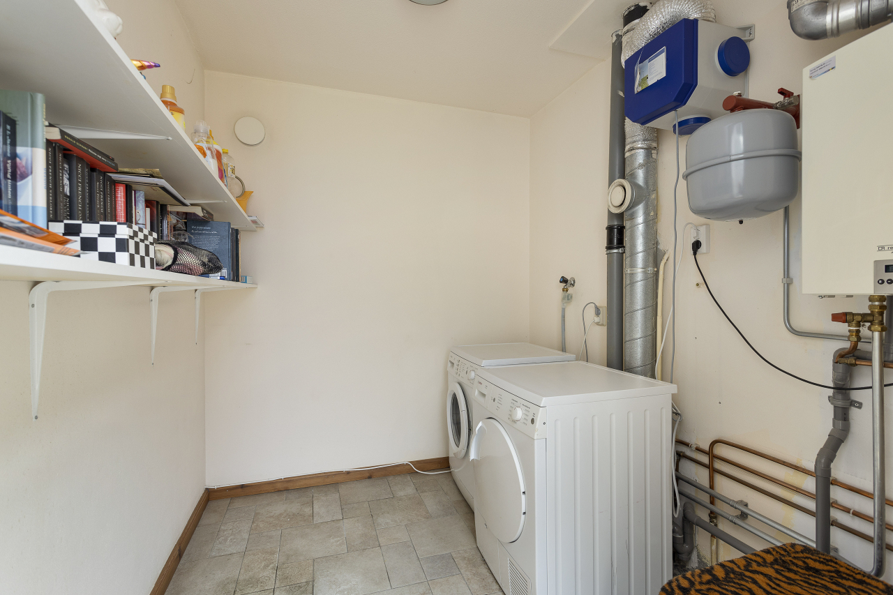 Via een vaste trap is de 2e verdieping bereikbaar met lichte overloop met glazen plafond en toegang tot de praktische waskamer met de Remeha CV HR ketel en de witgoedaansluitingen. Verder is er de grote 4e slaapkamer met massief houten vloer, balkon aan de voorzijde en airco aan de achterzijde.