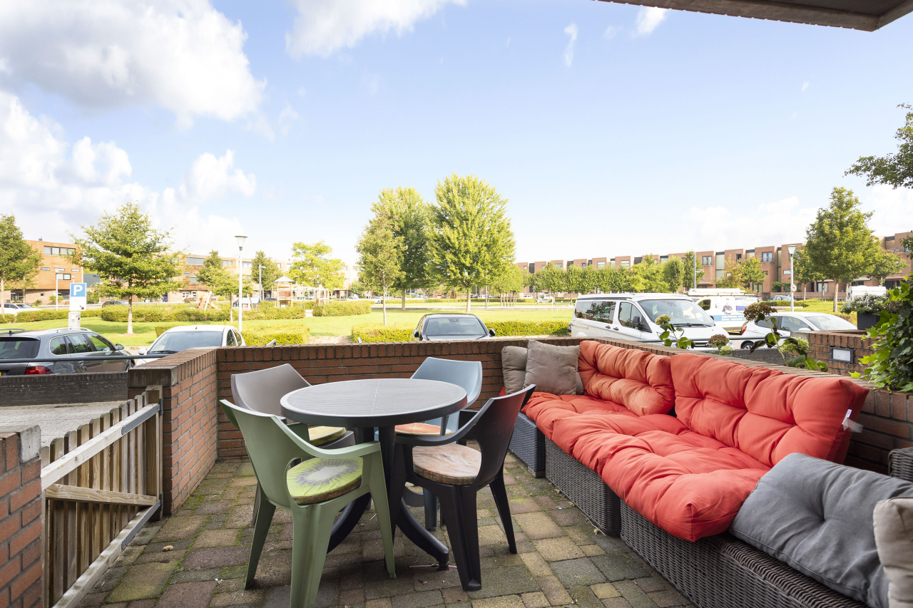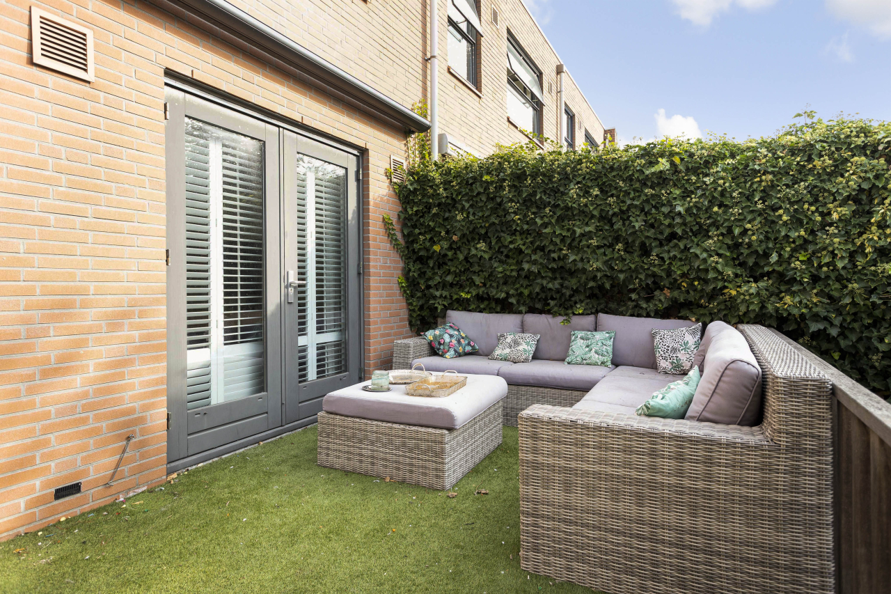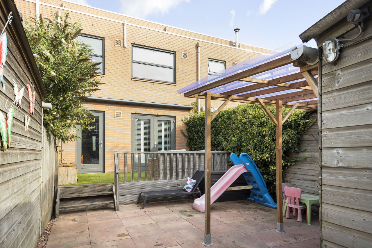 Achter de woning ligt een mooie, onderhoudsvriendelijke tuin op het Zuiden met achterom. Met een groot terras achter de woning en elektrisch zonnescherm. Enkele treden lager sierbestrating. Achterin de tuin staat de houten berging voor tuingereedschap en fietsen met een overkapping aan de voorzijde.