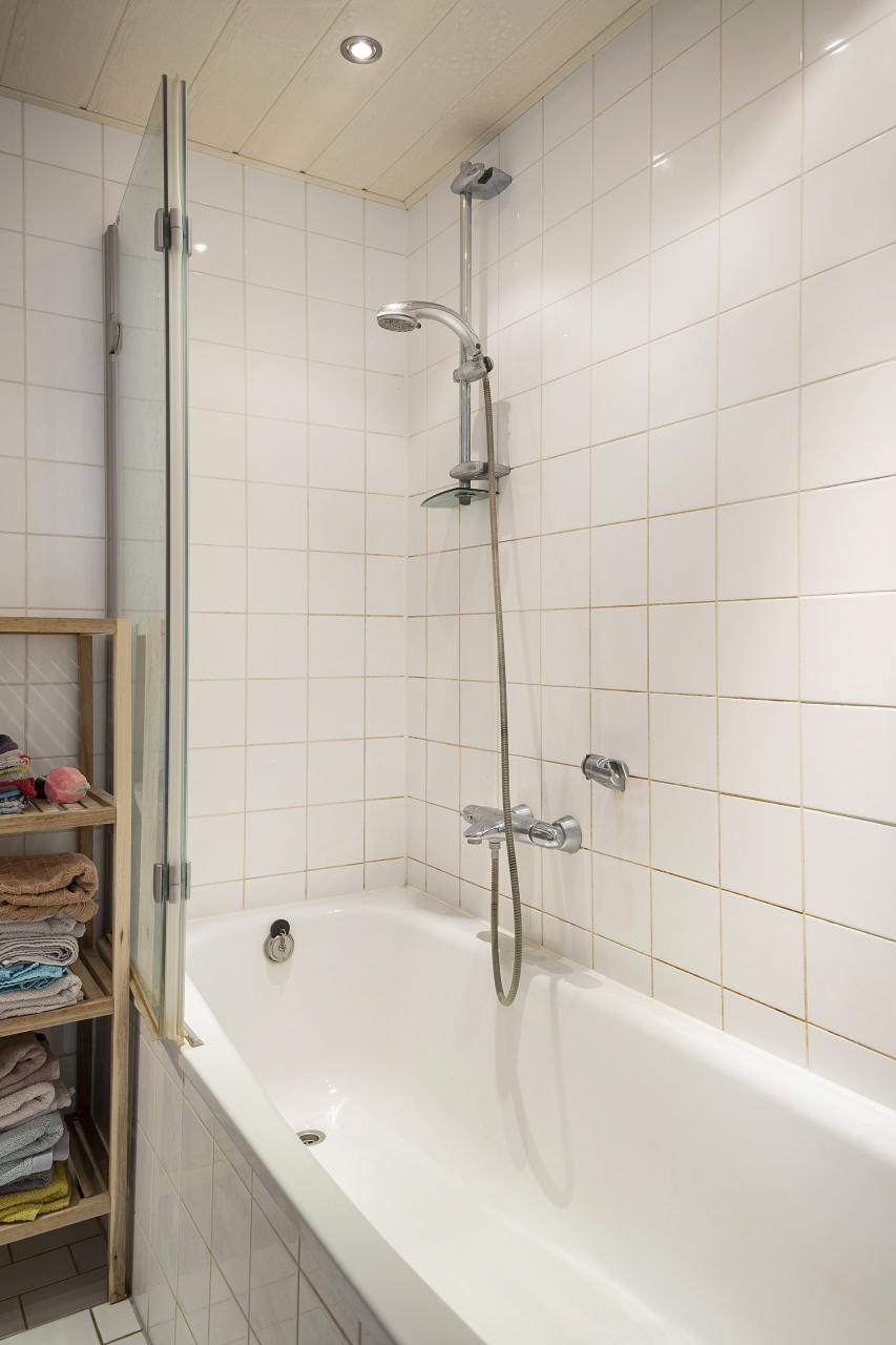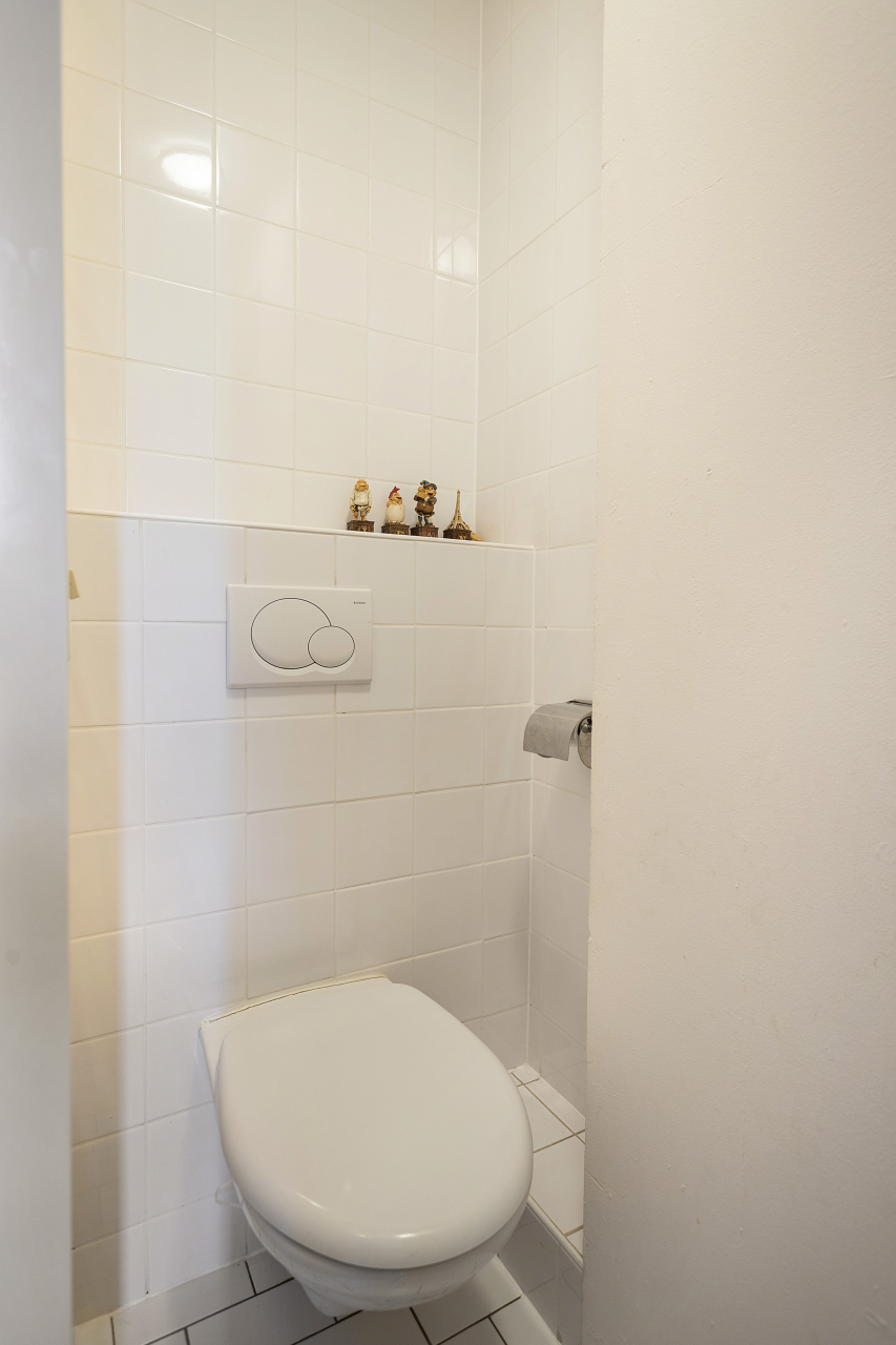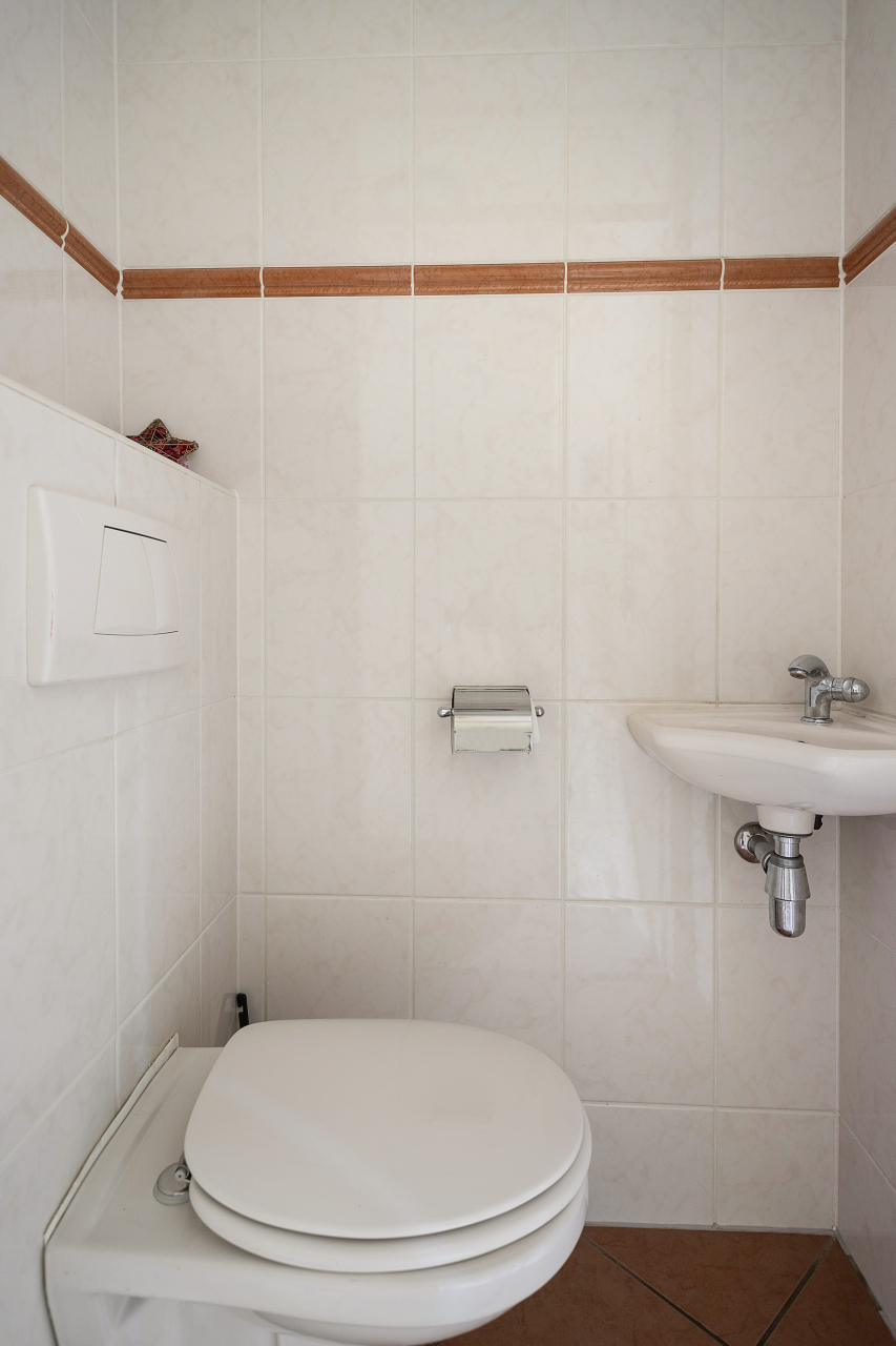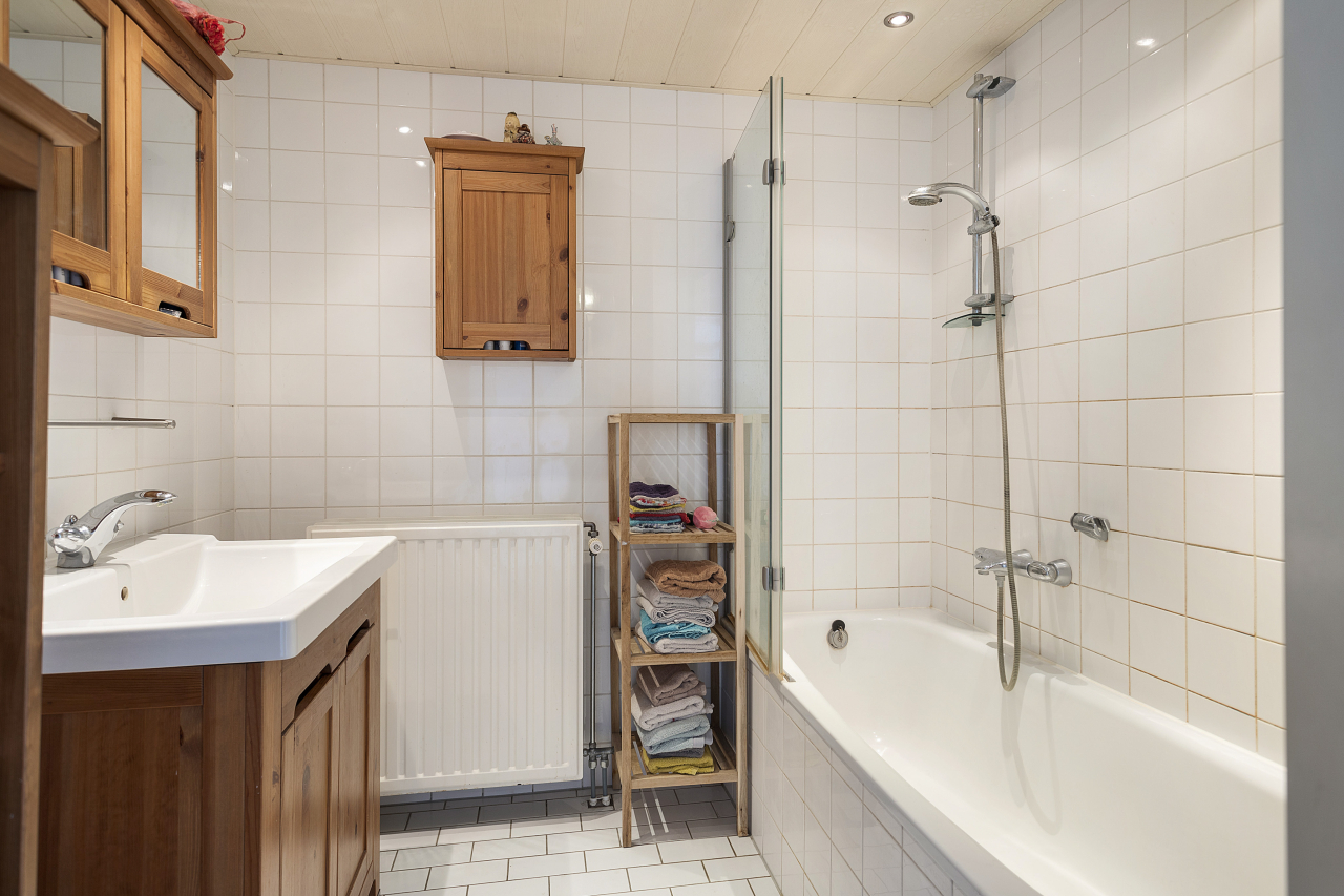 De ruime, volledig betegelde badkamer is ingericht met een ligbad met douche. Daarnaast is een breed wastafelmeubel. Tegenover de badkamer ligt aan de overloop de aparte toiletruimte met 2e hangend toilet en een inbouwkast.