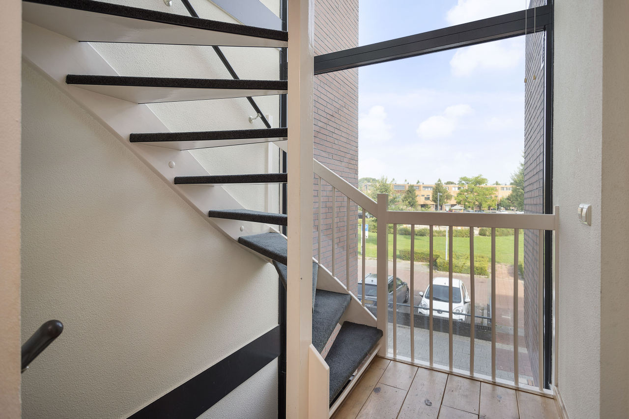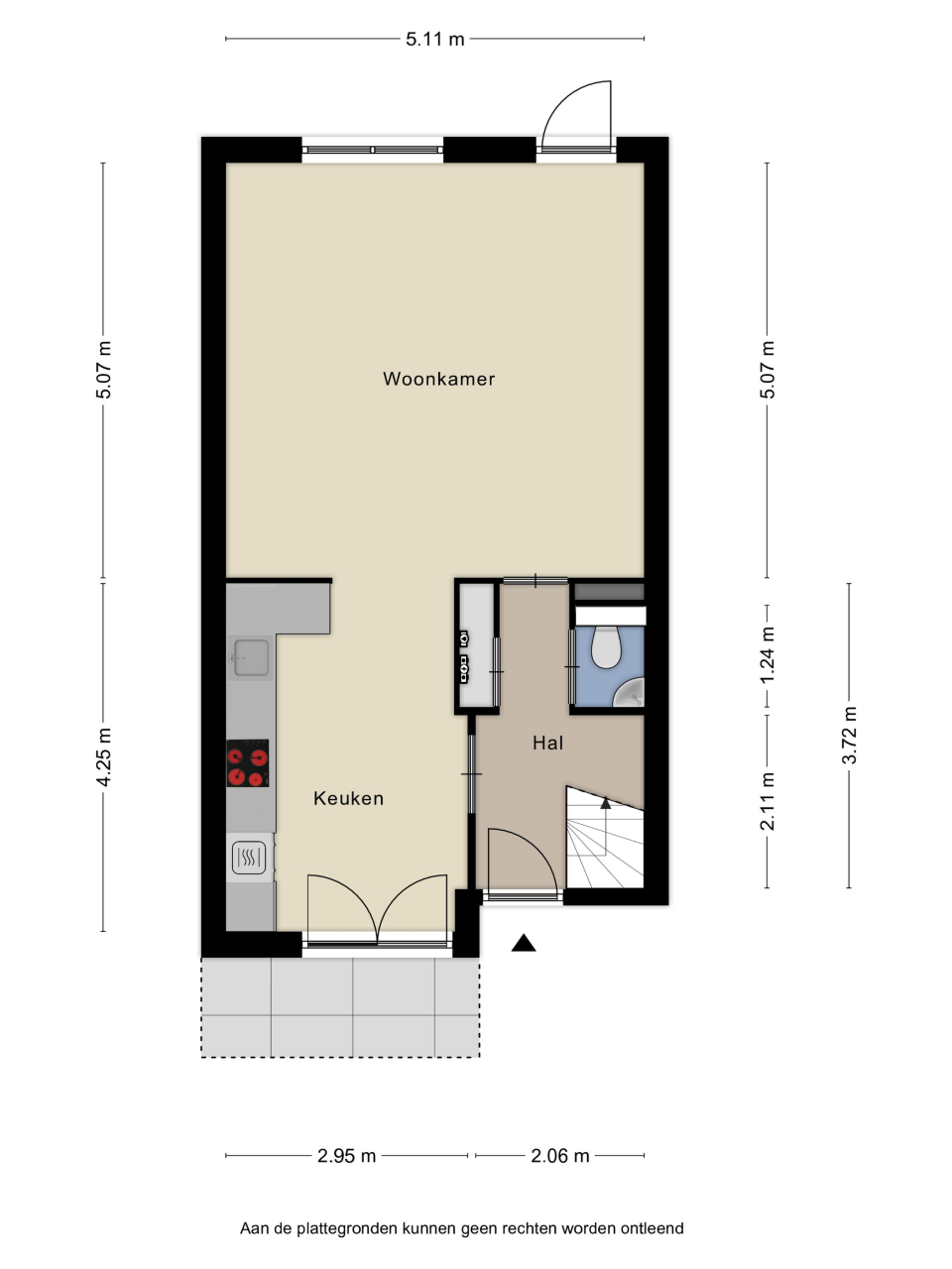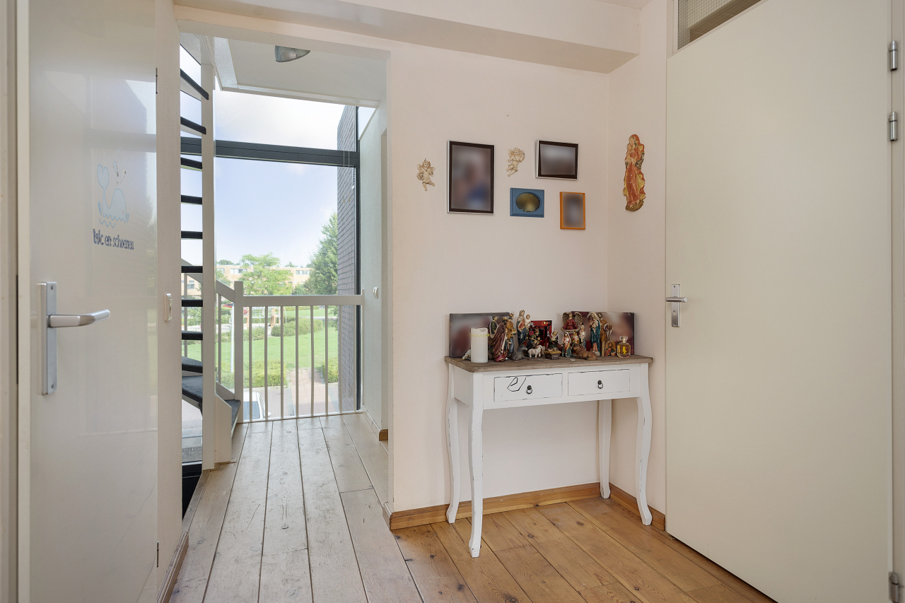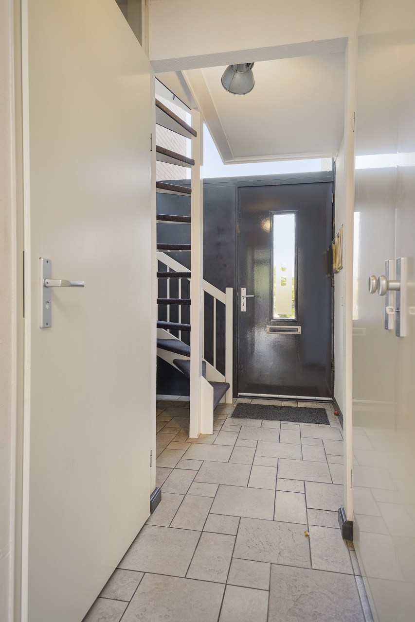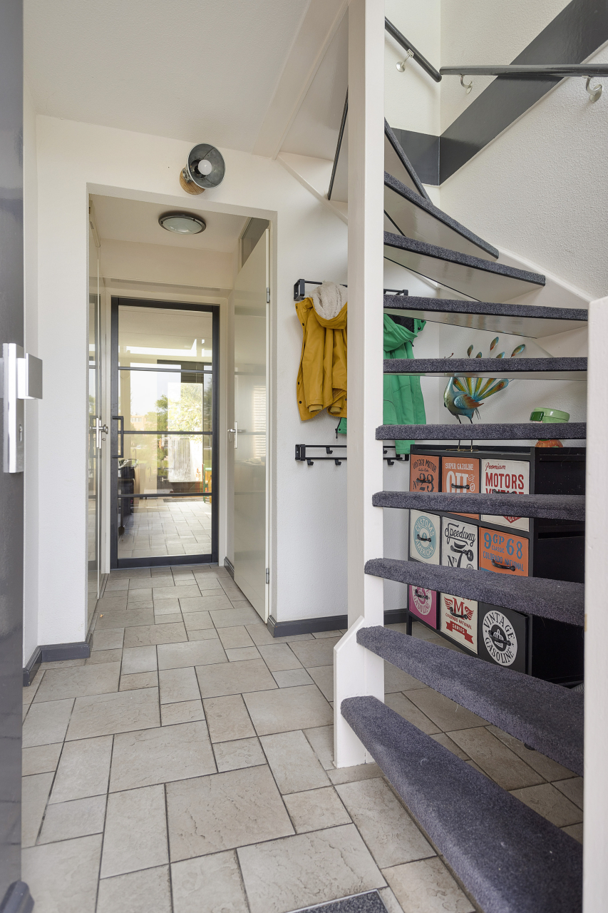 Aan de voorzijde in het verlengde van de keuken met openslaande deuren ligt een terras en is de entree van de woning. Vanuit de lichte hal met garderobe, trapopgang, meterkast en modern toilet met fonteintje is via een glazen/ stalen deur de woonkamer bereikbaar. Voorzien van een lichte tegelvloer met vloerverwarming.