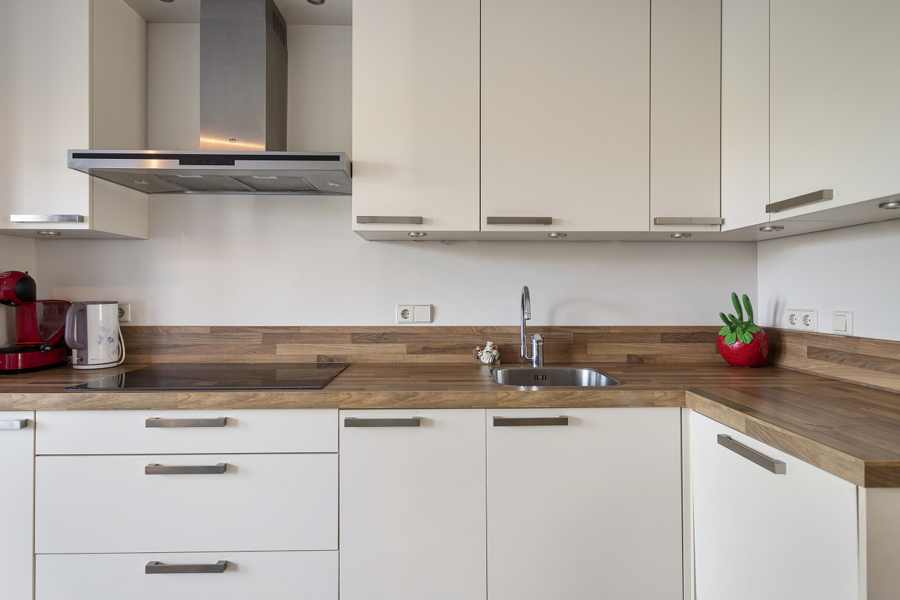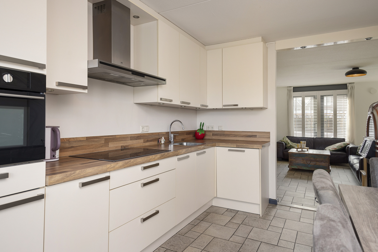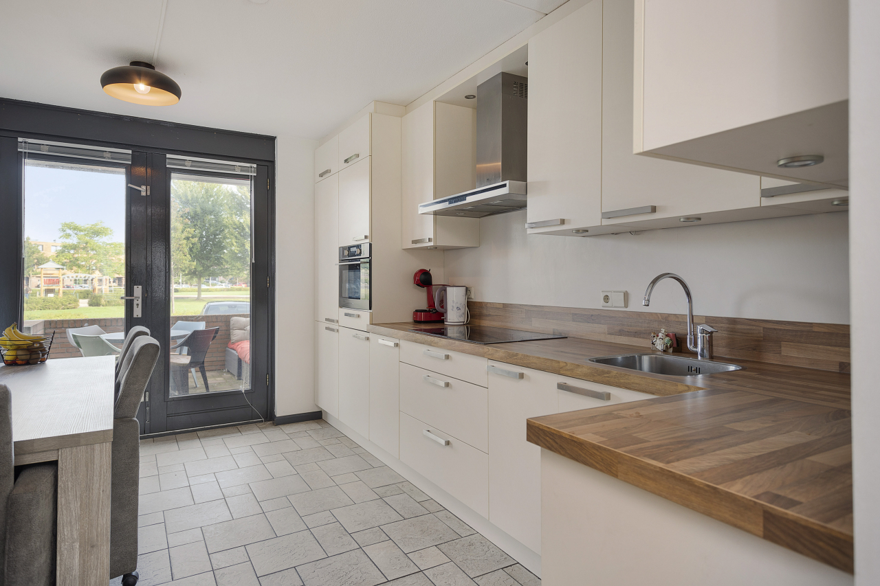 Aan de voorzijde ligt de grote, moderne open woonkeuken. met openslaande deuren. De keuken met aanrechtblad in L vorm is voorzien van diverse inbouwapparatuur zoals een AEG 4 pits inductie kookplaat met AEG afzuigschouw, Pelgrim combi oven magnetron, Bosch vaatwasser en Siemens koelvries- combinatie.