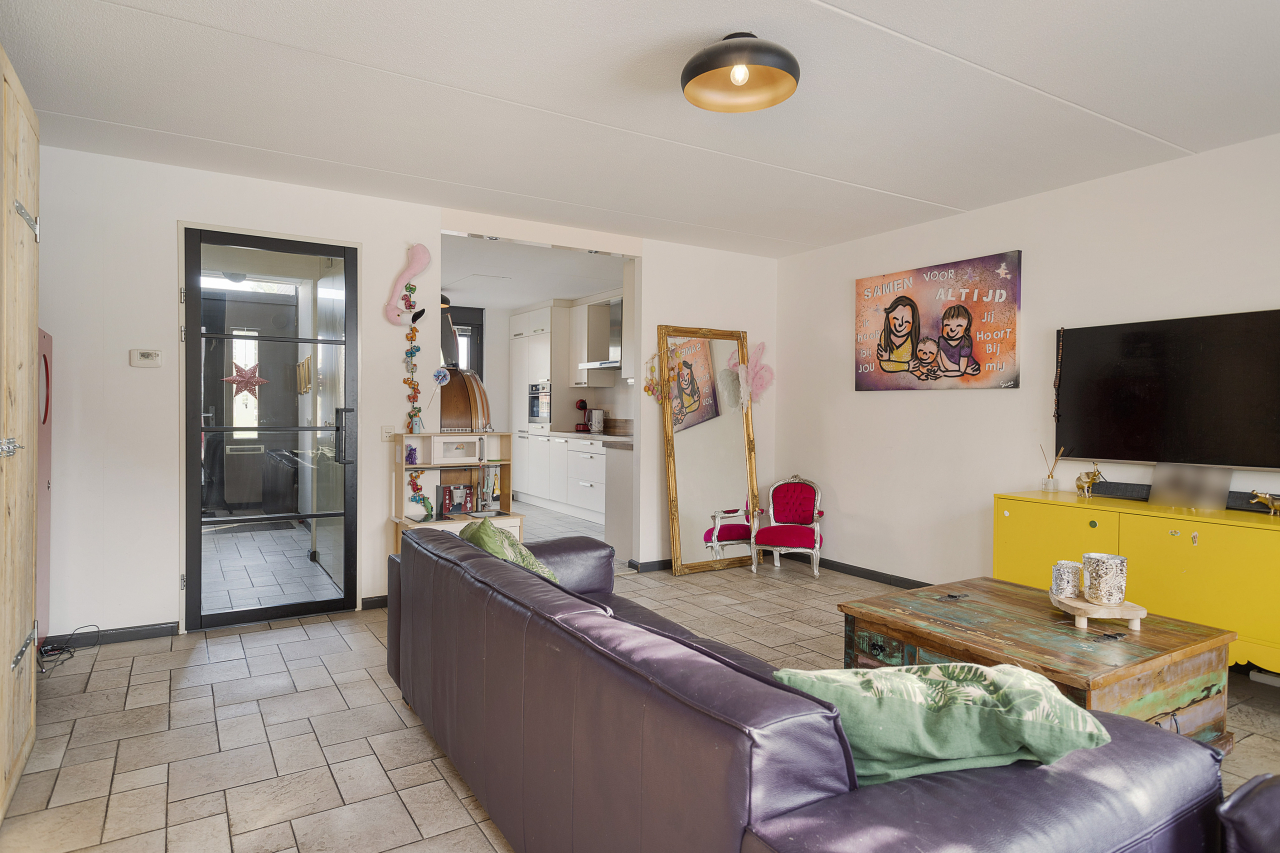 De woonkamer met zicht op de zonnige tuin en de woonkeuken zijn beiden voorzien van een lichte tegelvloer met vloerverwarming.