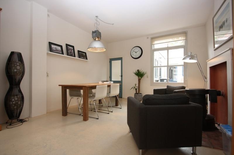 De lichte woonkamer met betonnen vloer heeft aan de voorzijde de zithoek met grote ramen met roedeverdeling. Aan de achterzijde is de eethoek bij de keuken en hierbij een zitje bij de sfeervolle gaskachel. Er is tevens een groot raam met roedeverdeling die uitkijkt op de patio. Via de open houten trap is de 1e verdieping bereikbaar.