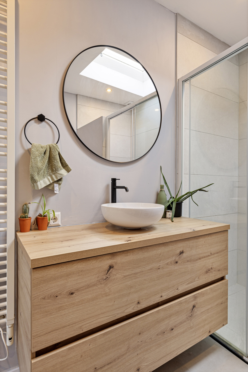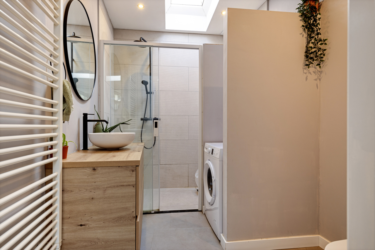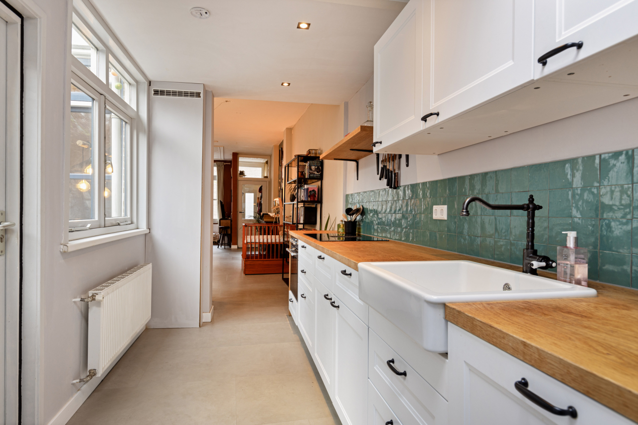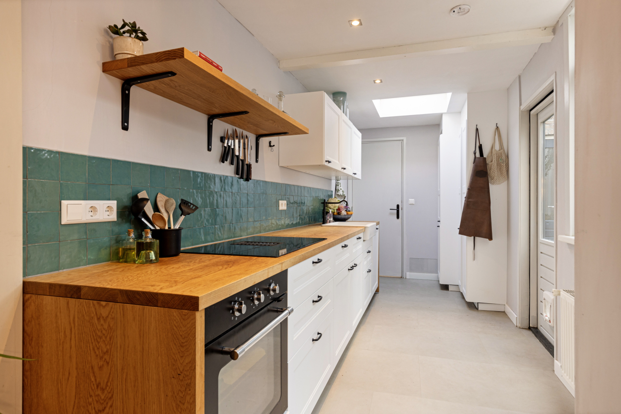 Achter de woonkamer ligt de lichte, nieuwe (2022) keuken met een recht aanrechtblad met gootsteen met zichtbaar front en fraaie keukenkraan. Recentelijk is een doorbraak gemaakt van de woonkamer naar de keuken. Verder is deze voorzien van een PVC vloer en diverse keukenkastjes en (inbouw)apparatuur. Er is een deur naar de tuin en aan de achterzijde een lichtkoepel en deur naar de badkamer. De nieuwe keuken is voorzien van de volgende inbouw-apparatuur: een inductiekookplaat met 4 zones en ingebouwde afzuigkap, een vaatwasser, een oven en een koelvries-combinatie. In een keukenkast naast de buitendeur bevindt zich de Nefit CV HR combiketel. De nieuwe (2022) complete badkamer (tevens met lichtkoepel) is voorzien van een royale inloopdouche met regendouche en handdouche, wastafelmeubel met fraaie waskom en mengkraan, hangend toilet en designradiator. Er is tevens ruimte voor de wasmachine en een droger.