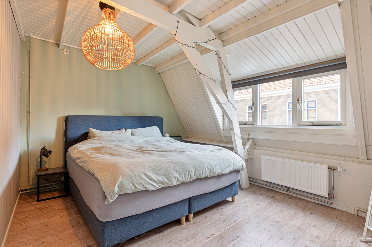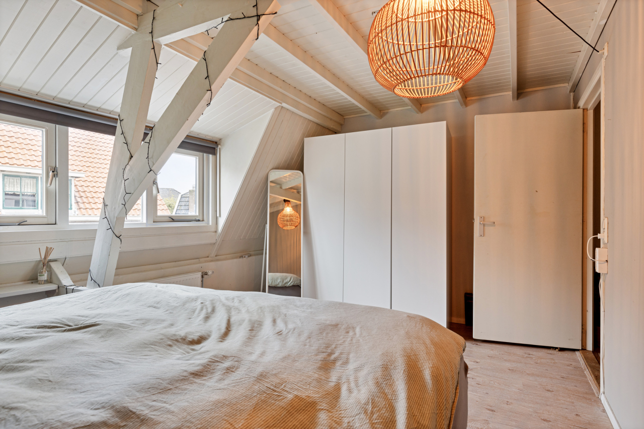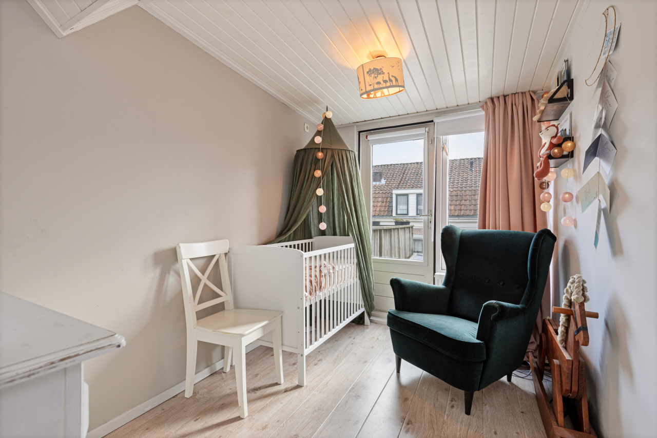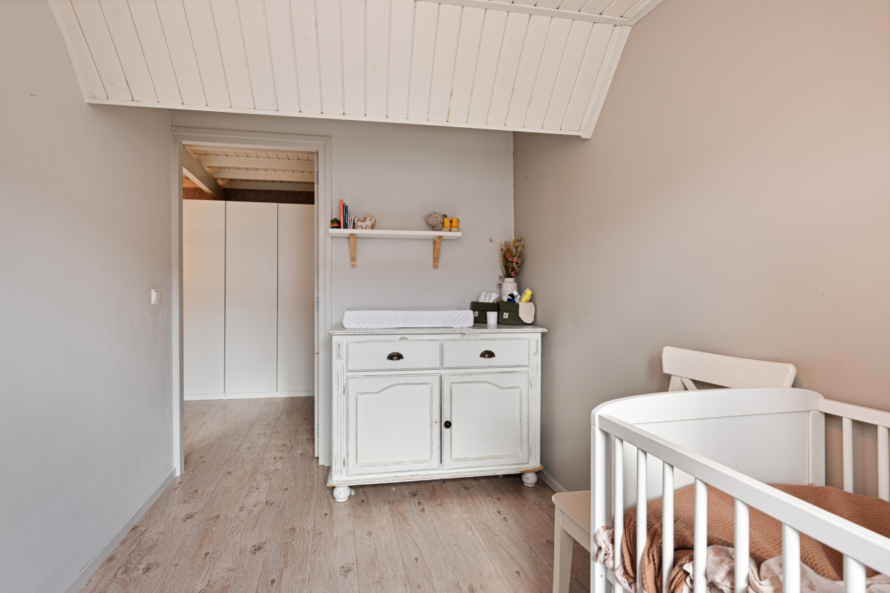 Op de 1e verdieping is recentelijk een nieuwe indeling gemaakt met 3 slaapkamers, 2 aan de achterzijde en 1 grote aan de voorzijde. De ouderslaapkamer aan de voorzijde is voorzien van een balkenplafond, laminaatvloer en dakkapel. De slaapkamers aan de achterzijde zijn ook voorzien van een laminaatvloer. Beide met grote ramen en 1 met een loopdeur naar het platte dak.