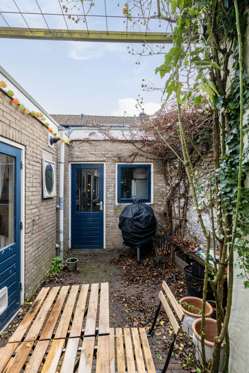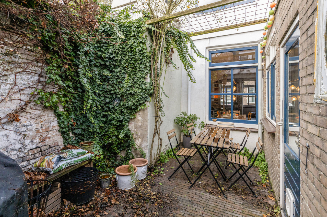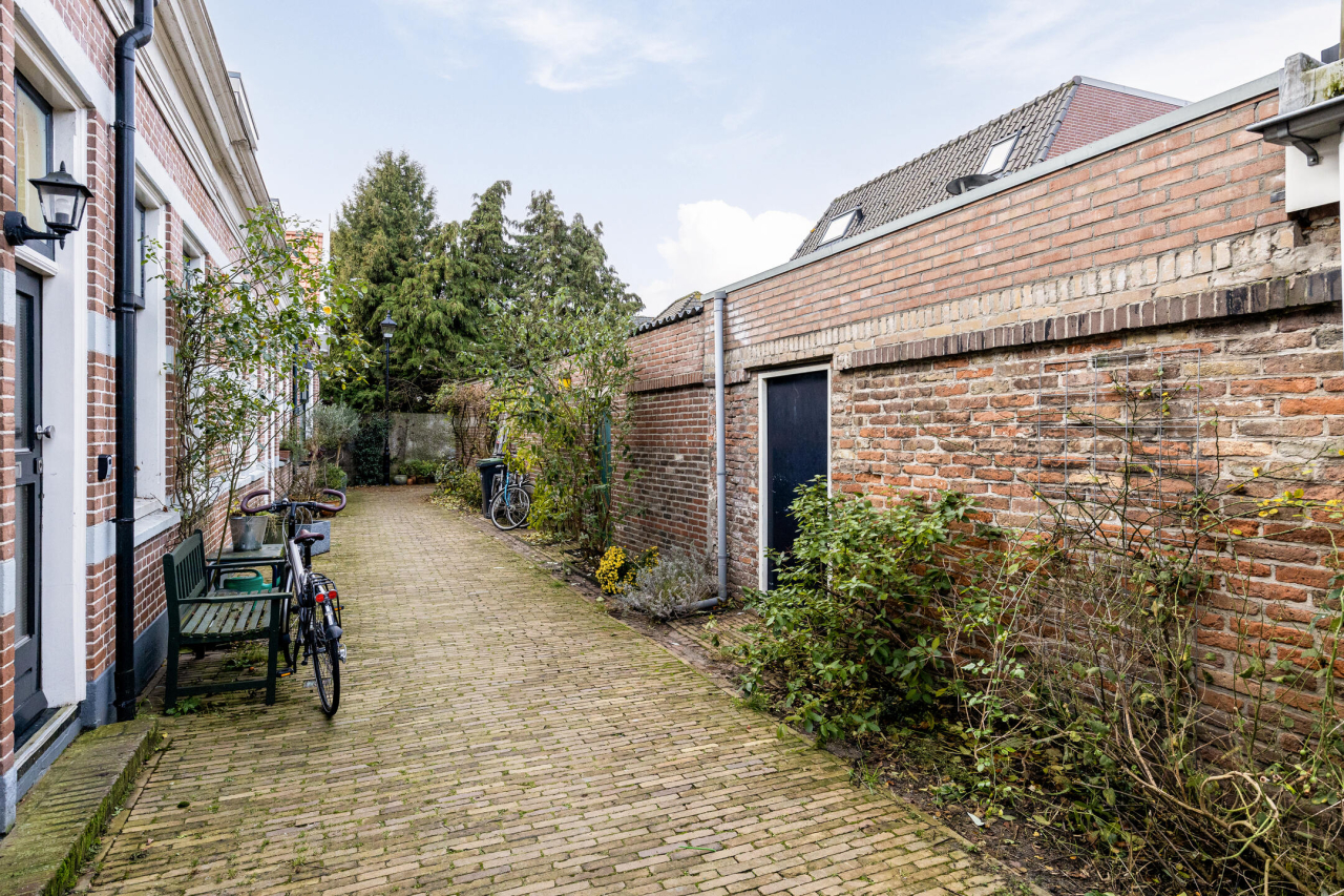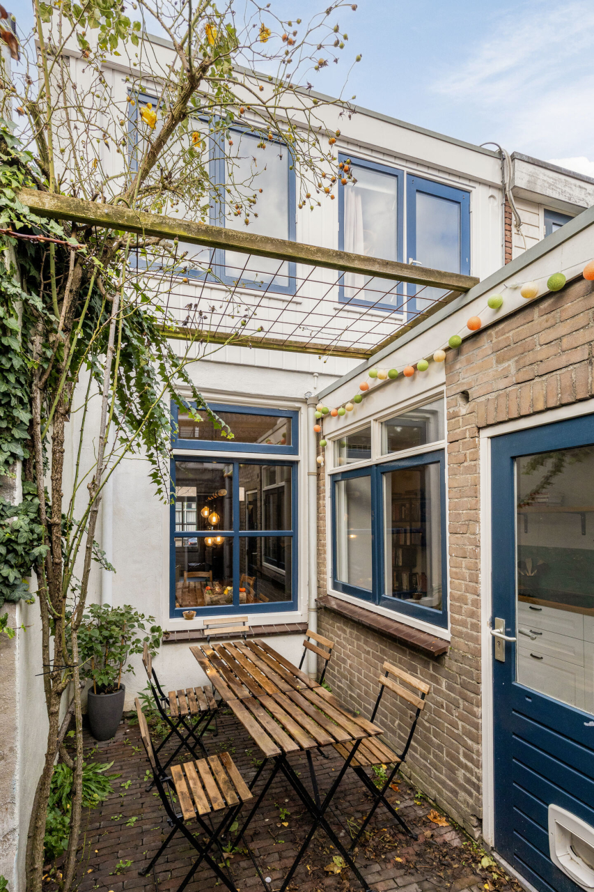De zonnige patio achter de woning op het Zuidoosten is onderhoudsvriendelijk en bereikbaar via de keuken deur. De berging met loopdeur en raam is bijzonder praktisch als bergruimte voor o.a de fietsen. De achterdeur van de berging is de achterom naar de karakteristieke Sophiastraat.