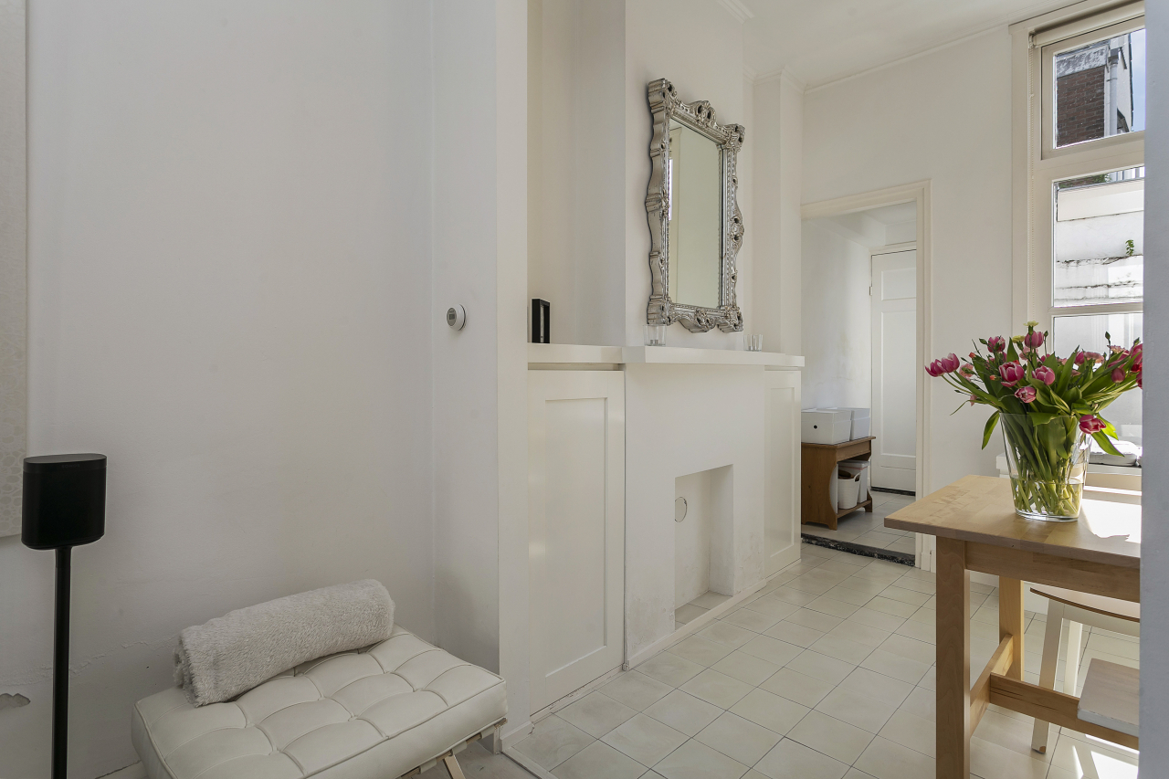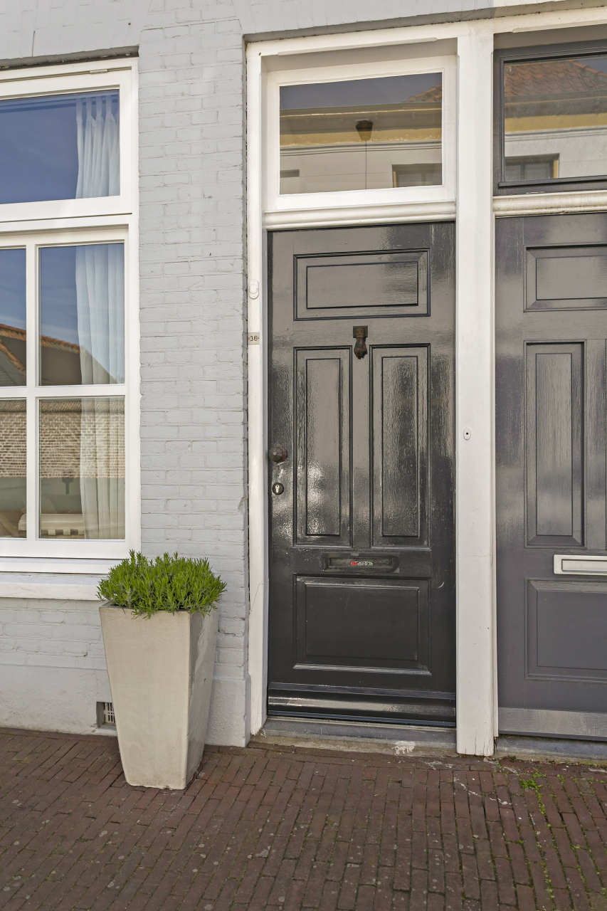 De entree van deze stadswoning, met beschermd stadsgezicht, is aan de voorzijde bij de ramen van de woonkamer met roede verdeling.