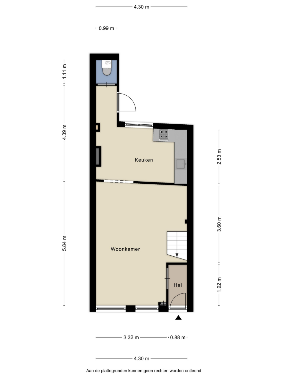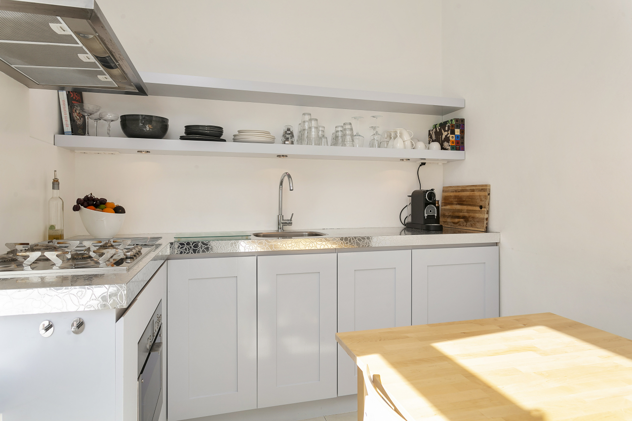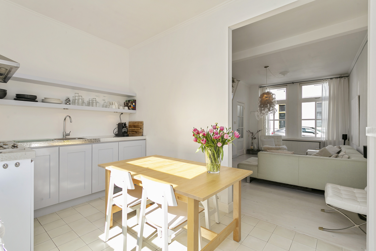 Aansluitend aan de woonkamer ligt de woonkeuken met schouw en zicht op de patio en Sint-Maartenstoren. Aan de achterzijde van de keuken is een halletje met deur naar de patio en het toilet.