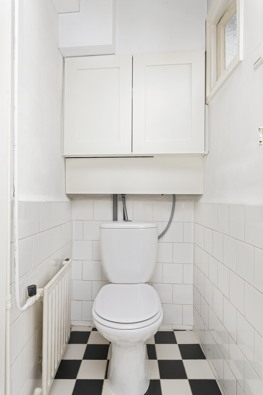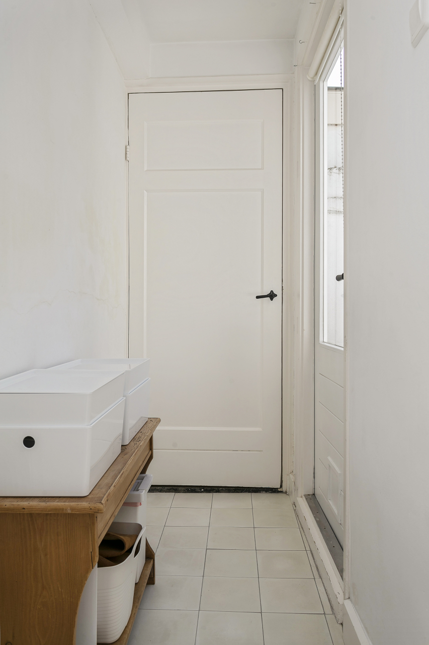 Achter de keuken ligt een halletje met lichte tegelvloer naar het toilet met radiator en kast met de Remeha Avanta CV ketel. Hier is tevens de deur naar de patio.