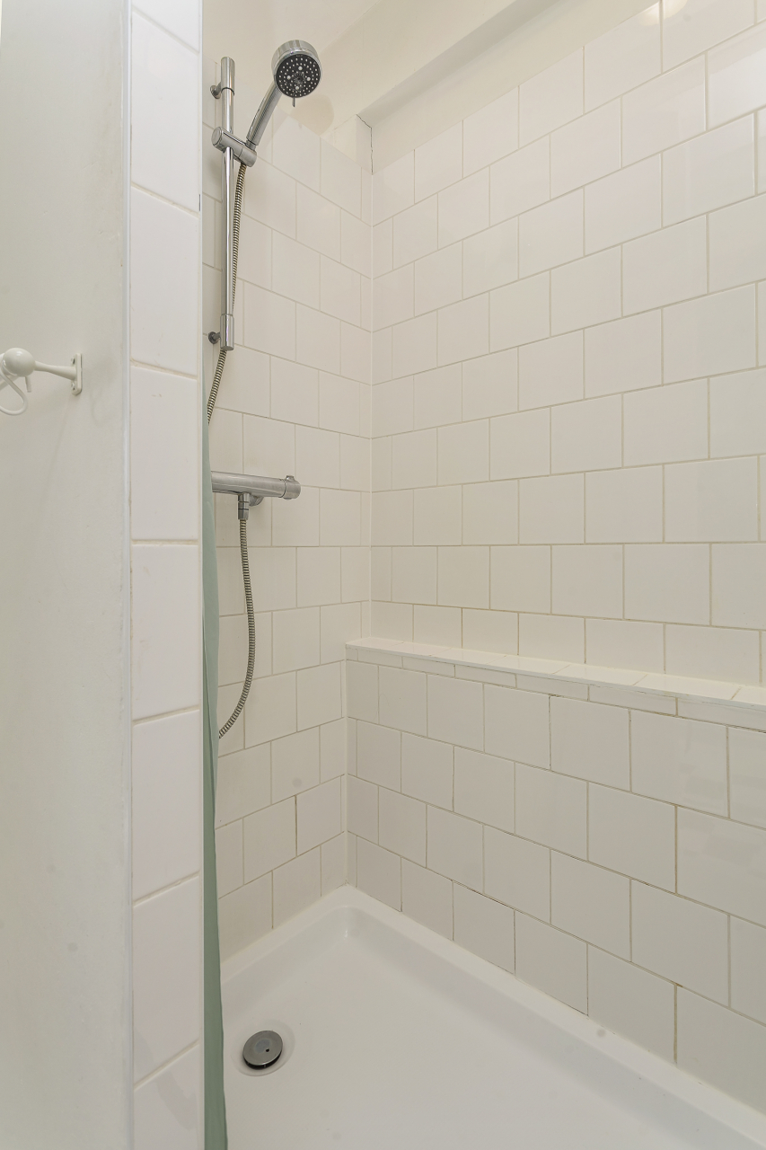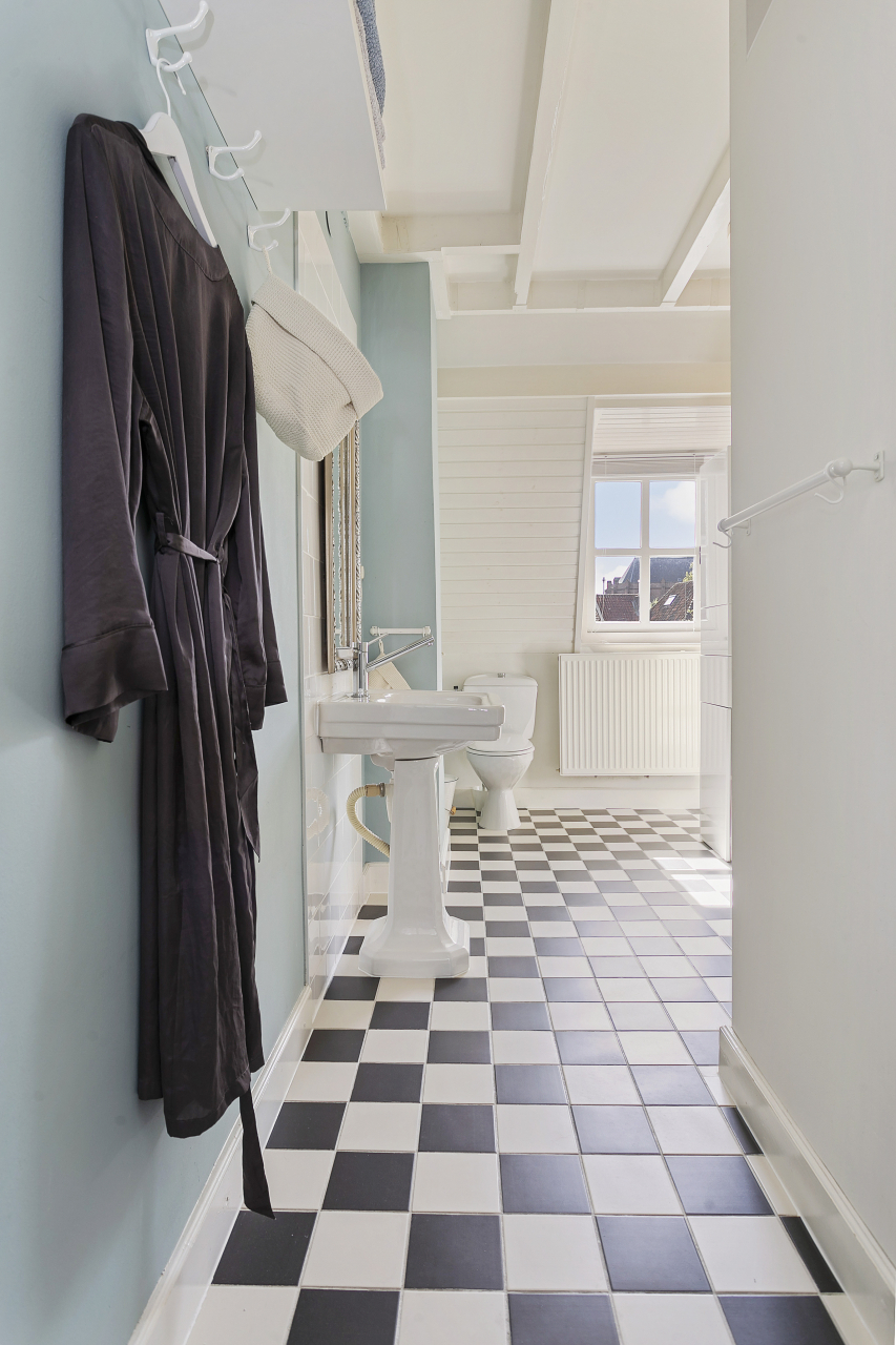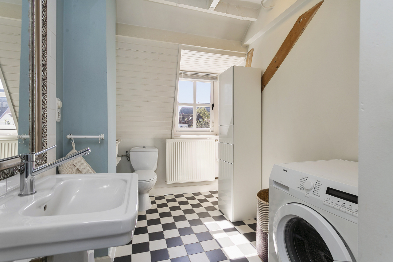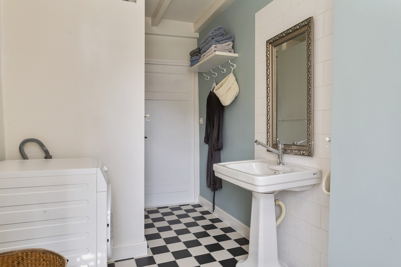 Aan de overloop ligt tevens aan de achterzijde de badkamer met balkenplafond en zwart- witte tegelvloer. Deze badkamer is voorzien van een douche met thermostaatkraan, wastafel, 2e toilet en de witgoedaansluiting. Aan de achterzijde is een dakkapel met raam met roedeverdeling.