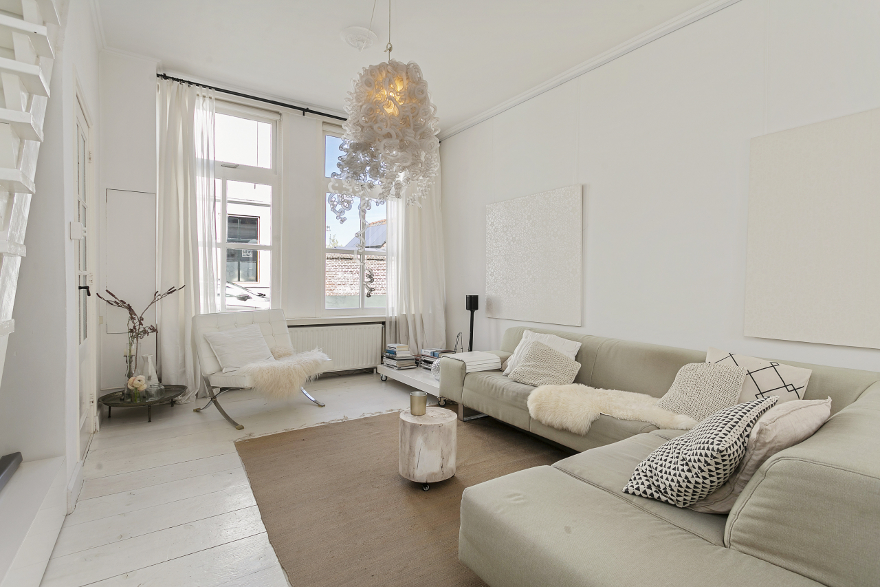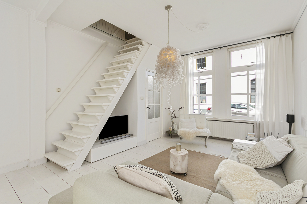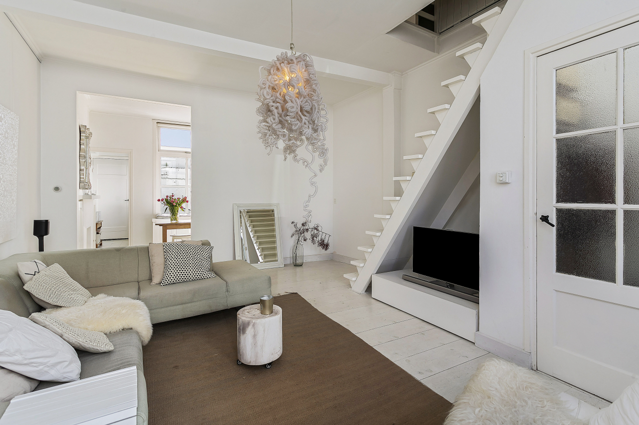 Via de deur met raam met roedeverdeling in de hal is de woonkamer bereikbaar. De lichte woonkamer met trapopgang is voorzien van een wit gelakte houten vloer en heeft een zithoek en grote ramen aan de voorzijde. In de hoek bij de hal is de meterkast.