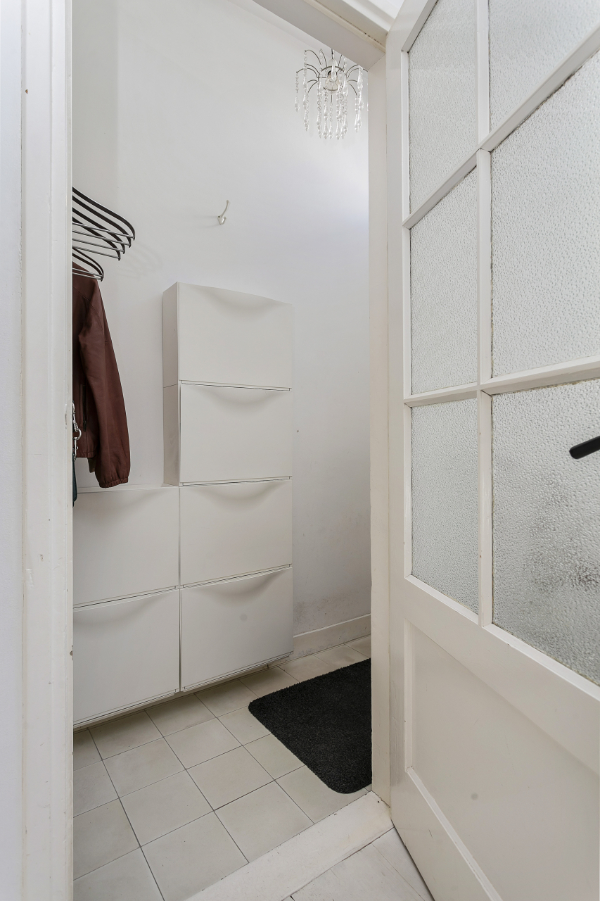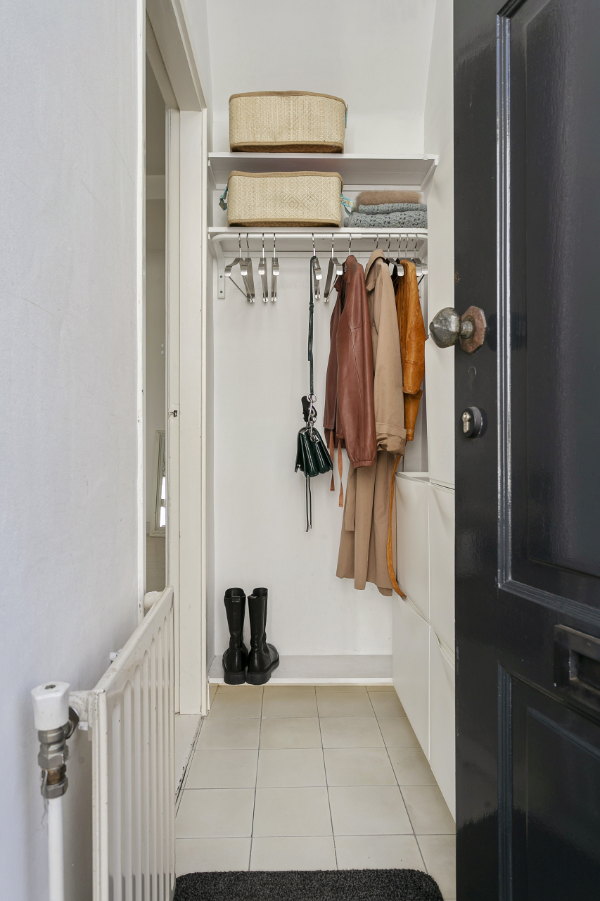 De paneel voordeur is voorzien van een bovenlicht waardoor er extra lichtinval is in de hal. De voordeur geeft toegang tot een halletje met garderobe, radiator en lichte tegelvloer.