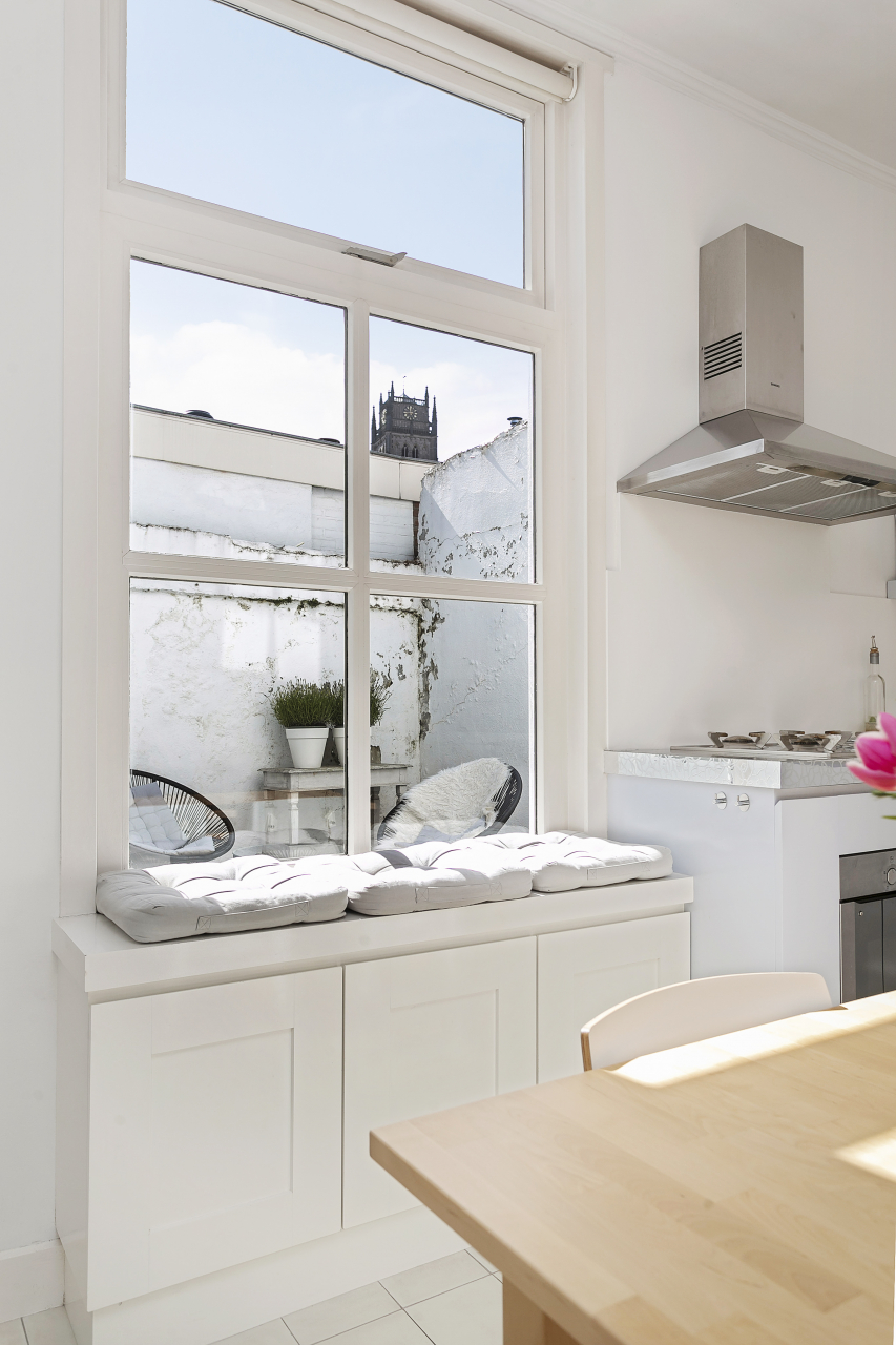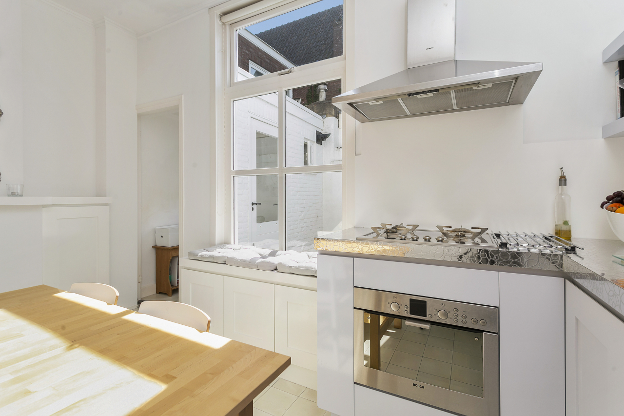 De (woon) keuken met tegelvloer is licht door het grote achterraam en heeft een echte vensterbank en ruimte voor een eettafel. Deze keuken in L opstelling is voorzien van een aanrechtblad met spoelbak, keukenkasten en keukenapparatuur zoals een Smeg 4-pits gastoestel met Siemens afzuigschouw, smalle vaatwasser, Bosch koelkast en - combi ovenmagnetron.