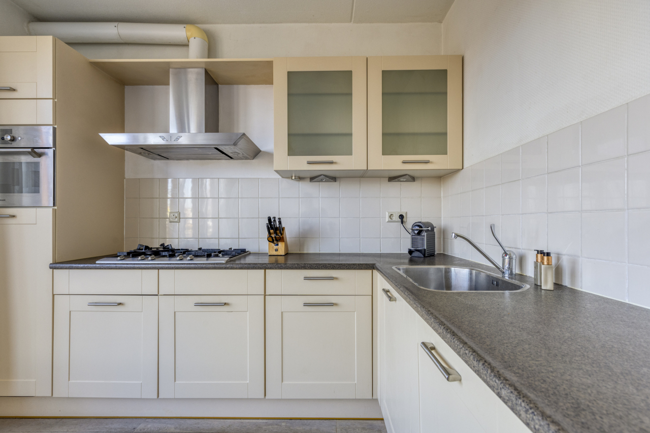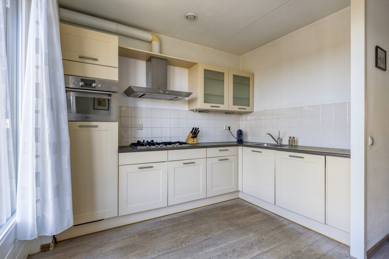 De complete keuken aan de voorzijde met hoge ramen heeft een aanrechtblad in L vorm en brede spoelbak. Er is inbouwapparatuur zoals: een ATAG 5 pits gastoestel met wok brander, een AEG afzuigschouw en -vaatwasser, Bosch koelkast en Bauknecht combimagnetron. Vanuit de keuken is prachtig zicht over Parkeiland met wandelgebied en speeltuin.