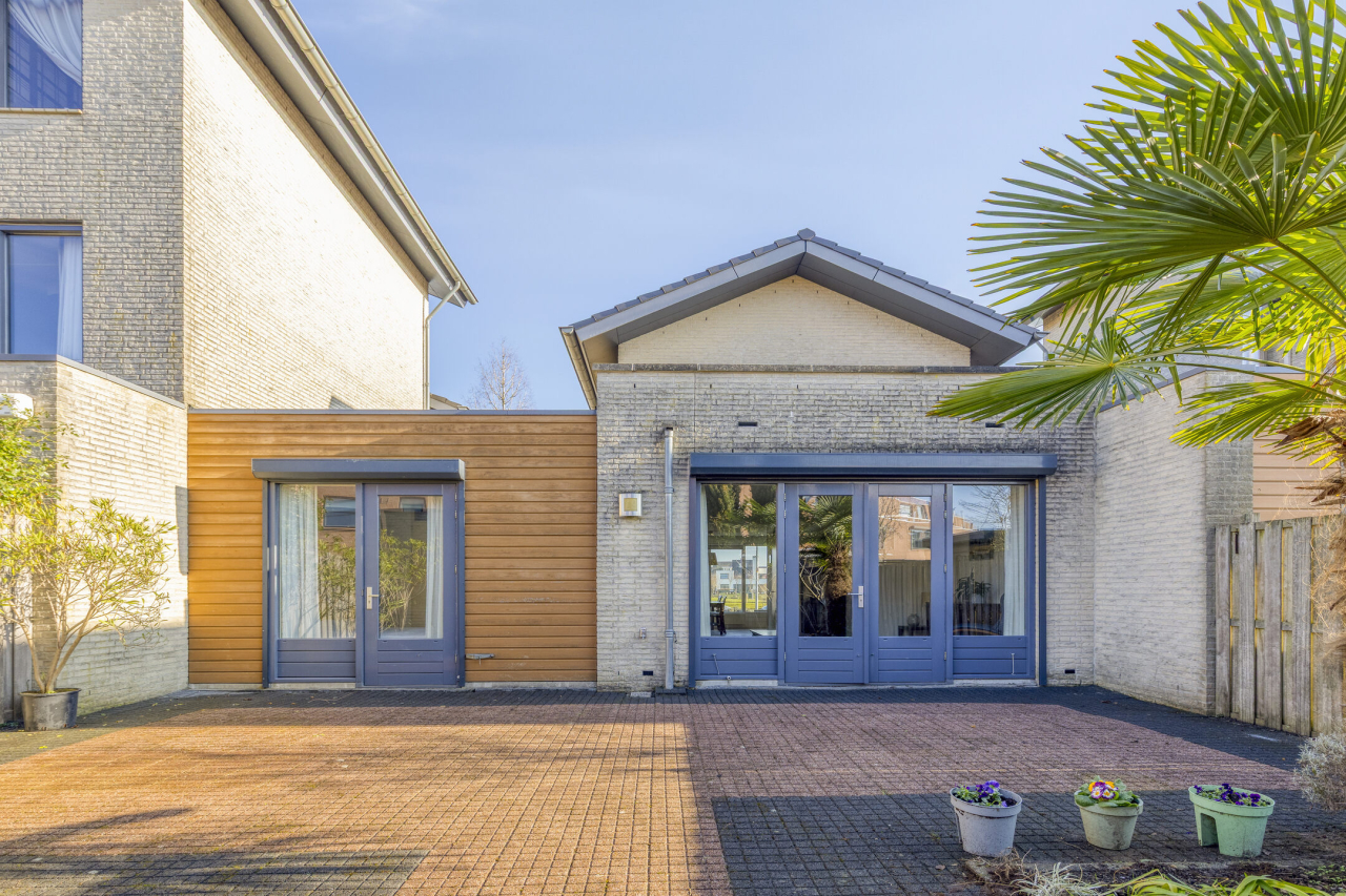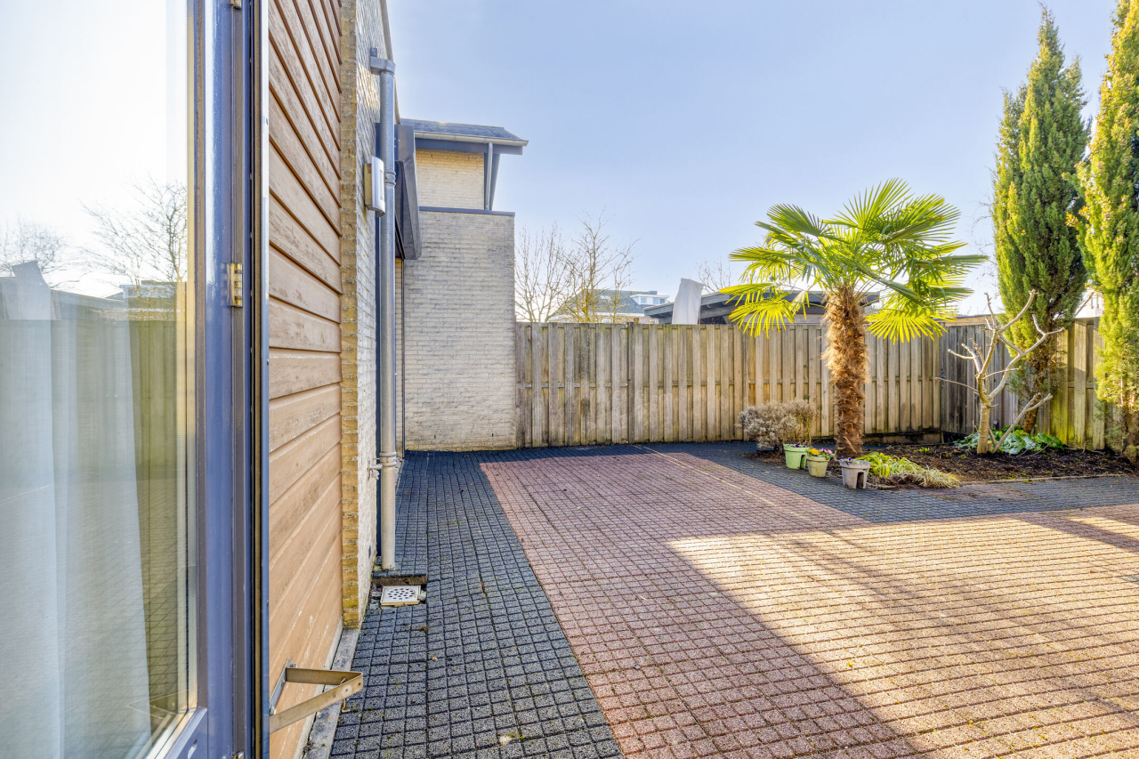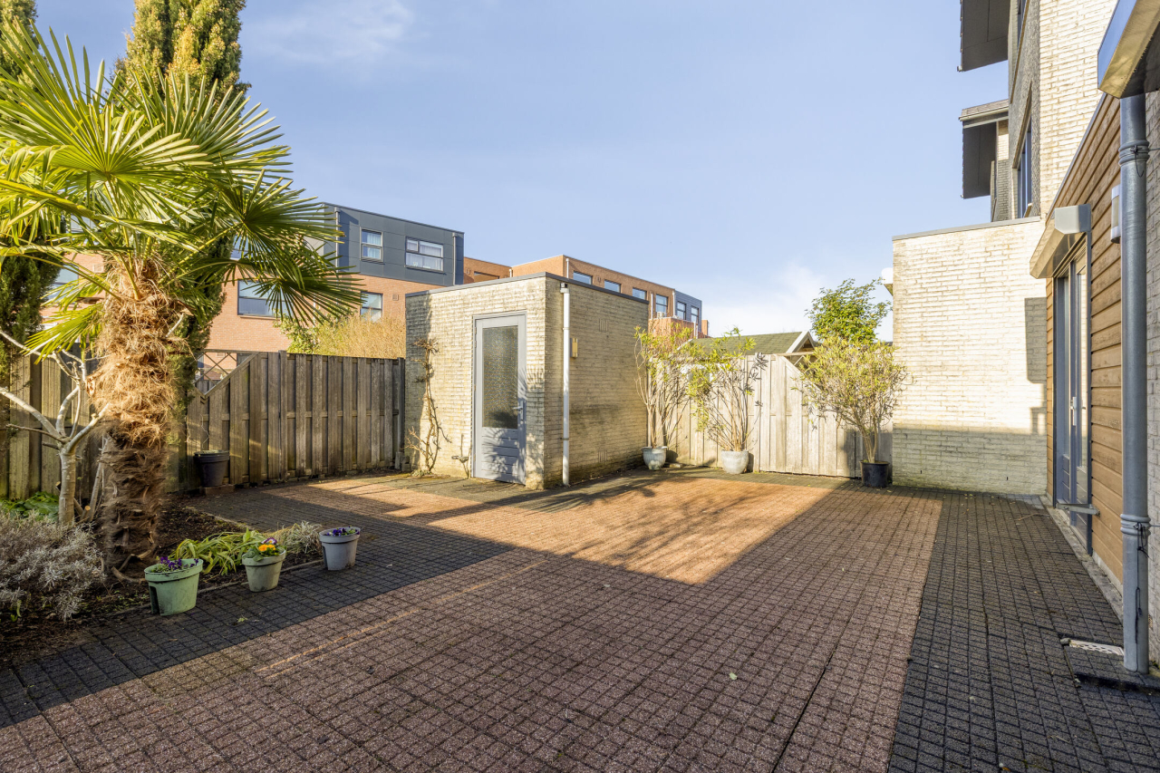 Achter de woning ligt een zonnige onderhoudsvriendelijke tuin met sierbestrating. Verder een aantal borders met beplanting en bomen (palmboom, vijgenboom en cipressen). Achterin de tuin staat een stenen berging en is een poort met achterom.