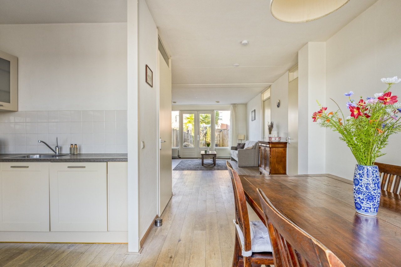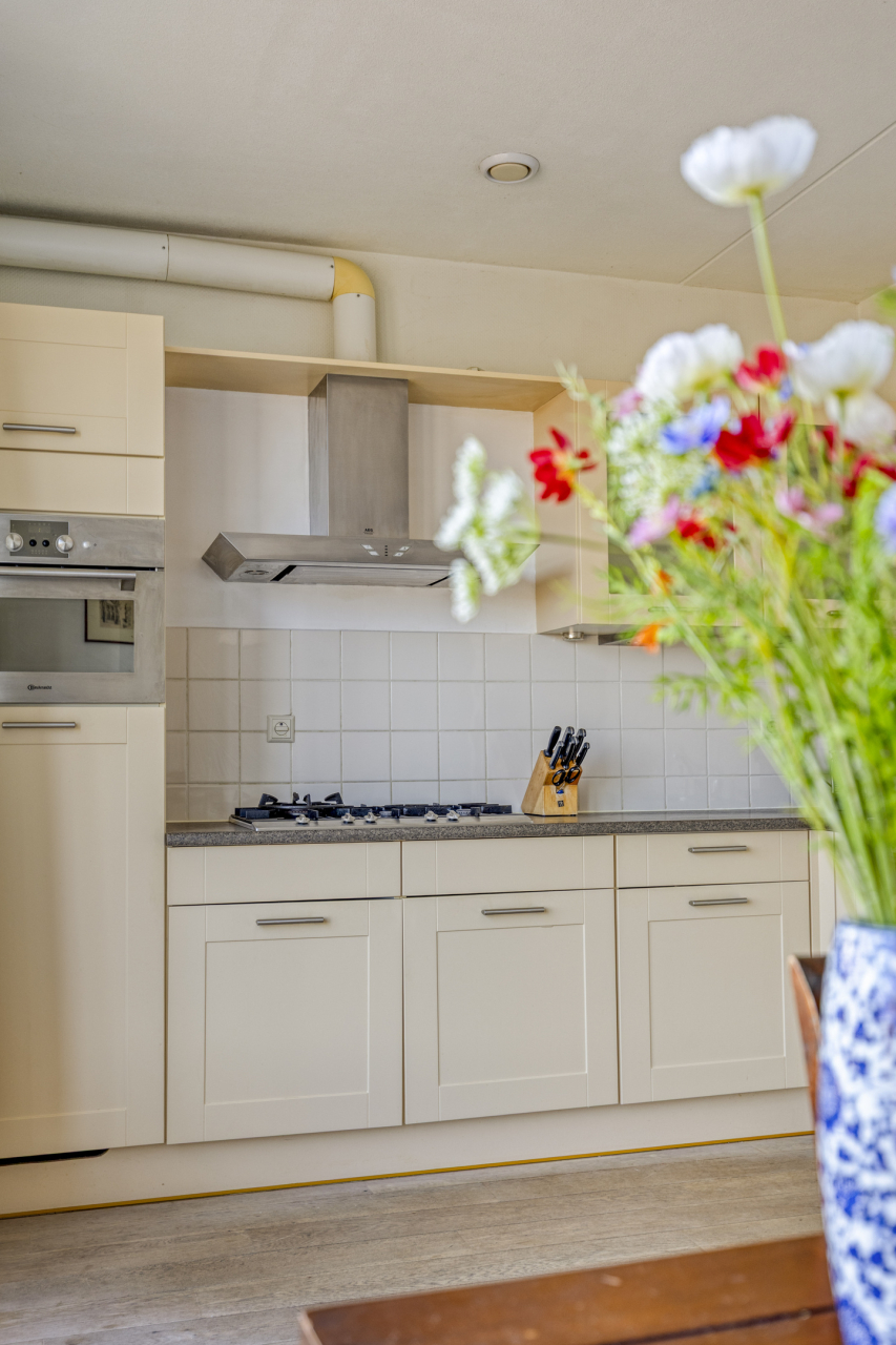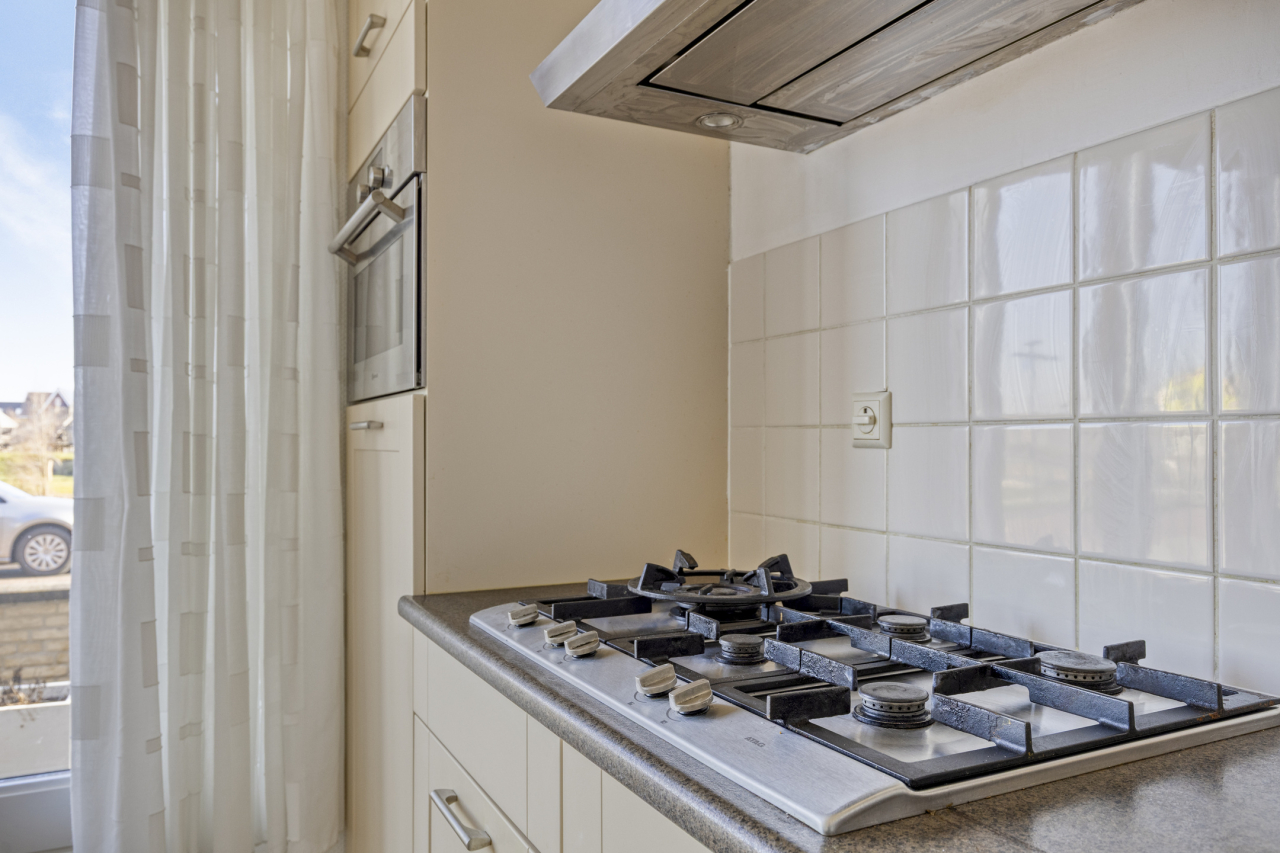 Vanuit de hal met garderobe, meterkast en toilet met fonteintje zijn de ruime woonkamer en keuken bereikbaar. De woonkamer met openslaande deuren is heerlijk licht en voorzien van een houten parketvloer, trapkast en elektrisch rolluik aan de buitenzijde. Aan de voorzijde is de eethoek bij de open keuken met aan de buitenzijde zonwering (markies).