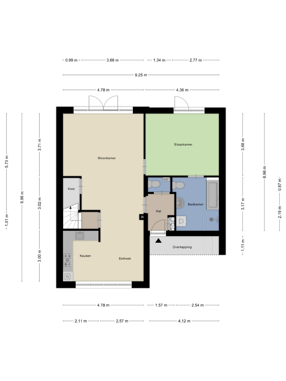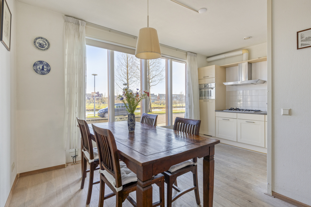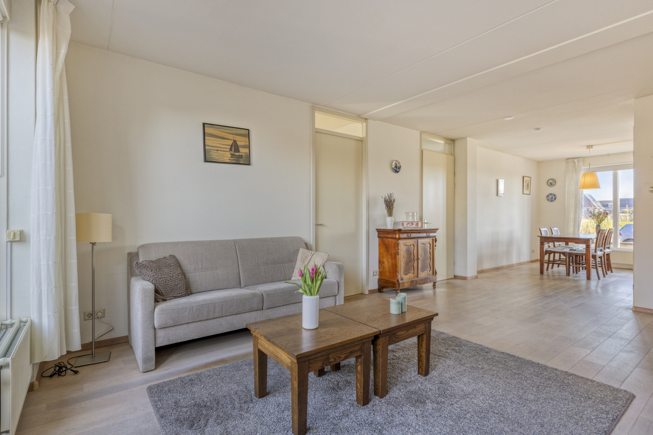 Vanuit de hal met garderobe, meterkast en toilet met fonteintje zijn de ruime woonkamer en keuken bereikbaar. De woonkamer met openslaande deuren is heerlijk licht en voorzien van een houten parketvloer, trapkast en elektrisch rolluik aan de buitenzijde. Aan de voorzijde is de eethoek bij de open keuken met aan de buitenzijde zonwering (markies).