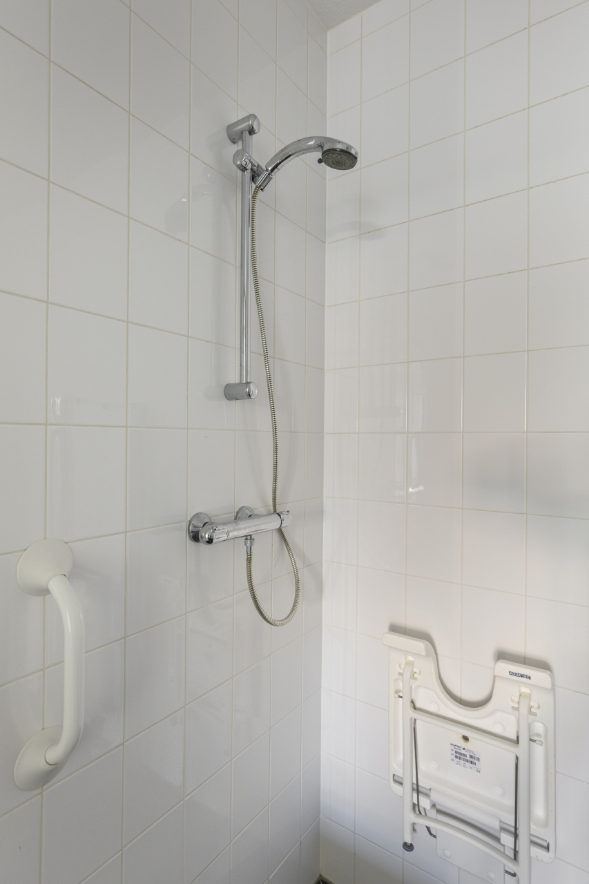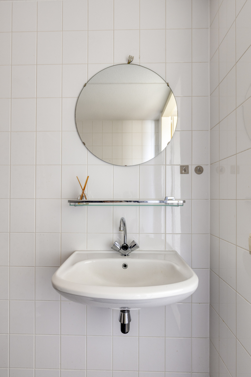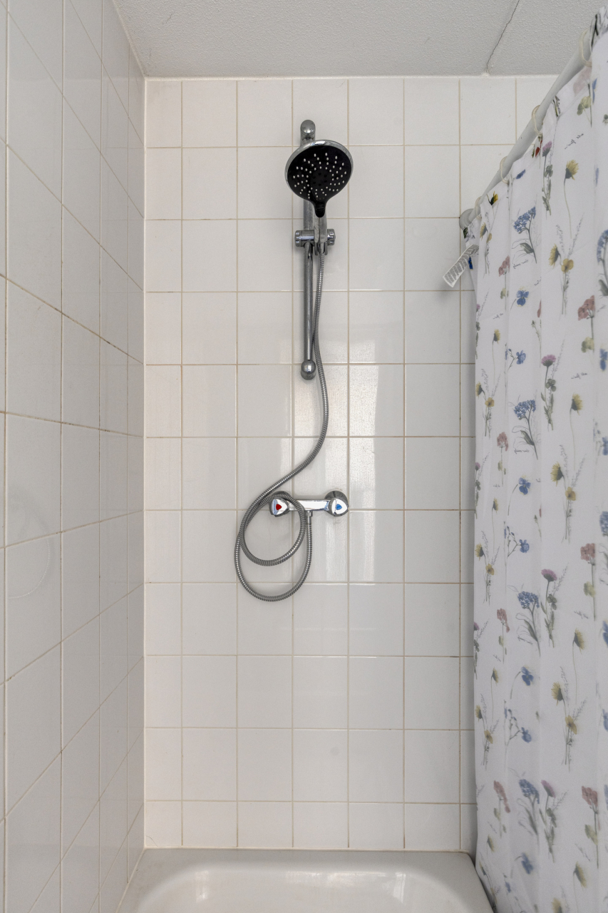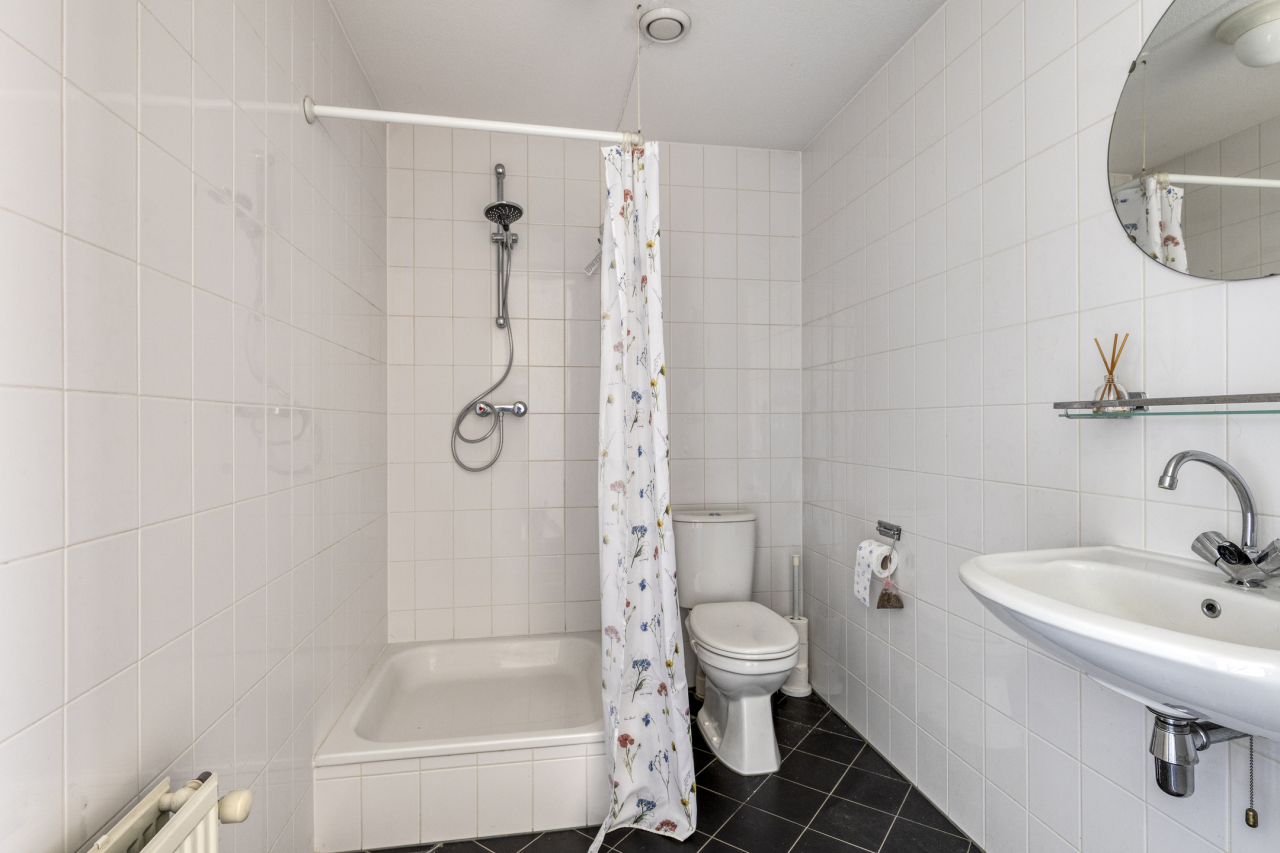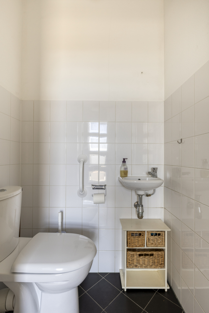 Via een portaal en trap is de 1e verdieping bereikbaar. Hier liggen aan de overloop de grote 2e slaapkamer, 2e badkamer, berging met CV HR ketel (2022) en warmte terugwin installatie. De praktische, volledig betegelde badkamer in dezelfde wit/grijs tinten als in de badkamer beneden, is ingericht met een douche, wastafel en 3e toilet.