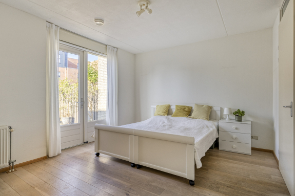 Vanuit de woonkamer is de royale ouderslaapkamer te bereiken met tevens een houten parketvloer. Aan de achterzijde is een groot raam en tuindeur met raam waardoor de kamer extra licht is. De deur en raam zijn samen voorzien van een elektrisch rolluik. Aansluitend aan de slaapkamer is de volledig betegelde 1e badkamer met een ligbad, wastafel, 2e toilet en inloopdouche met beweegbare glaswand. Tevens bevindt zich hier in de badkamer de aansluiting voor een wasmachine.