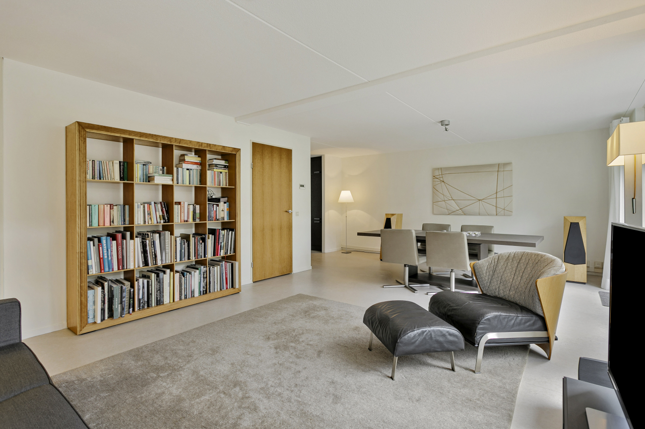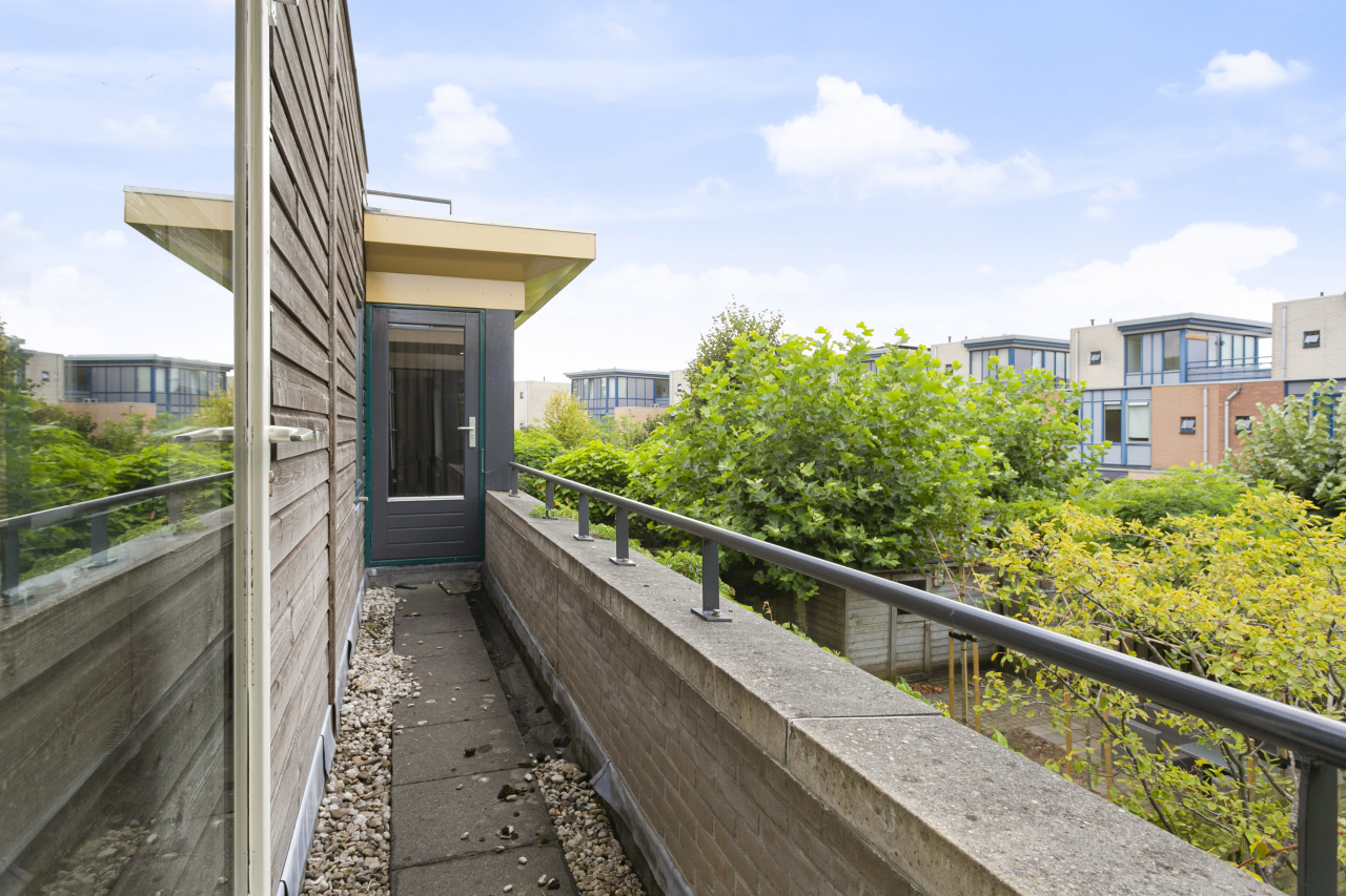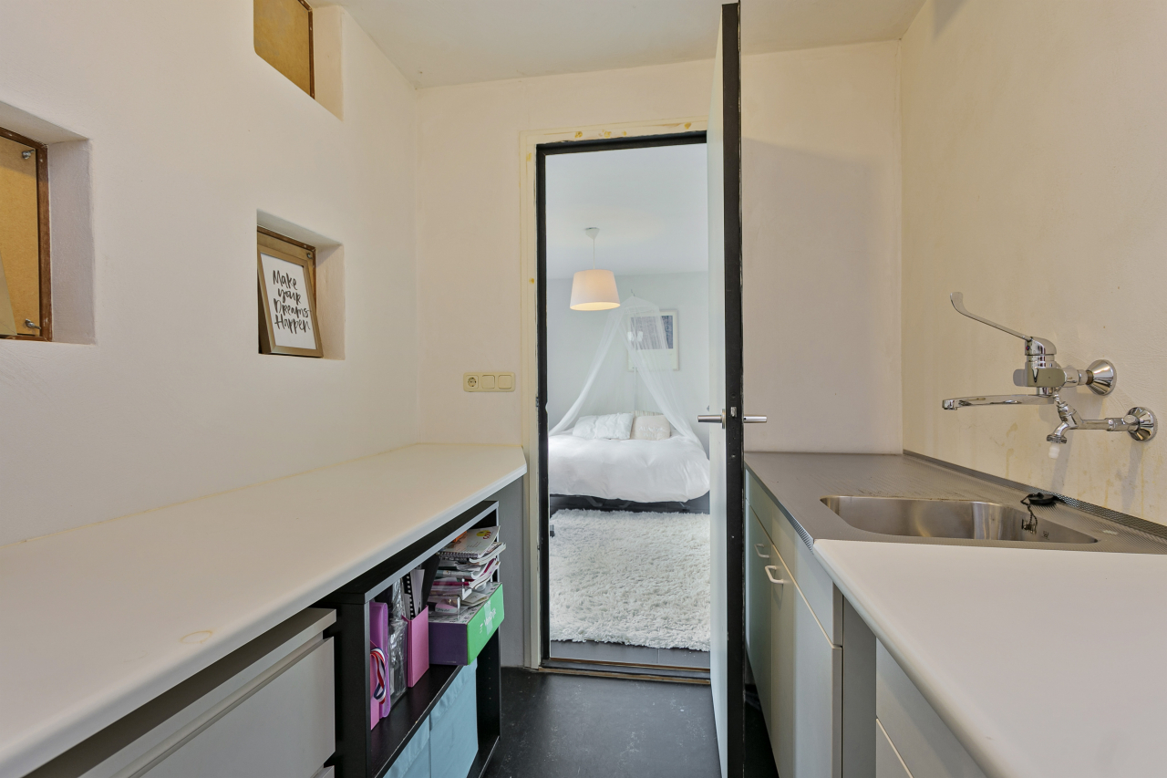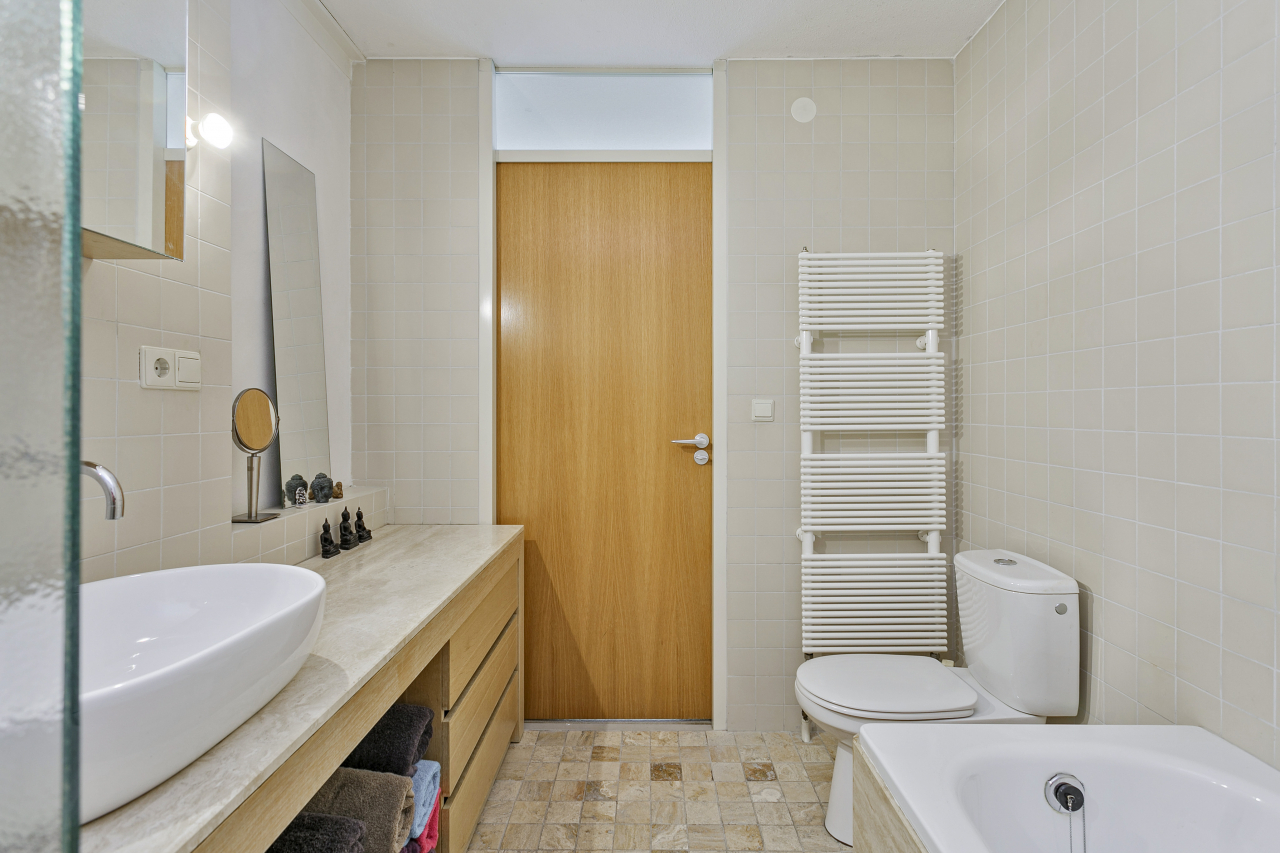 Aan de achterzijde ligt ook een royale slaapkamer tevens met grote ramen en met een inloopkast met wasbak (eerder Doka geweest). Er is een deur naar het balkon. Deze uitbouw of opbouw is in 2000 gerealiseerd.De complete badkamer is volledig betegeld en voorzien van een ligbad en inloopdouche met thermostaatkraan, een breed wastafelmeubel, designradiator en 2e toilet.
