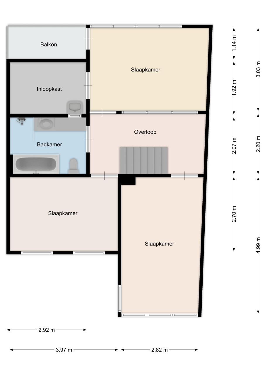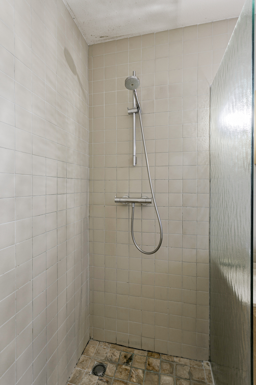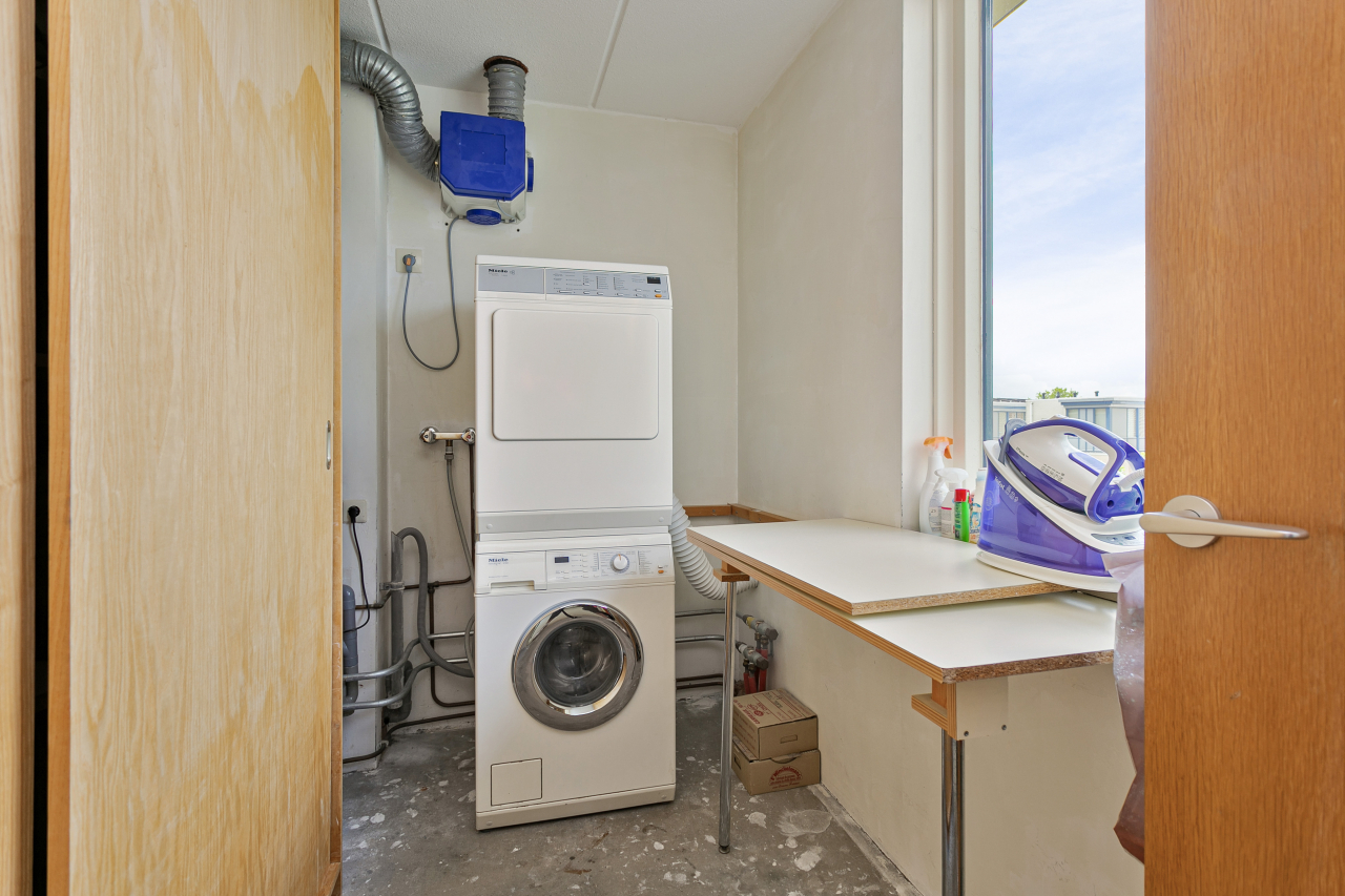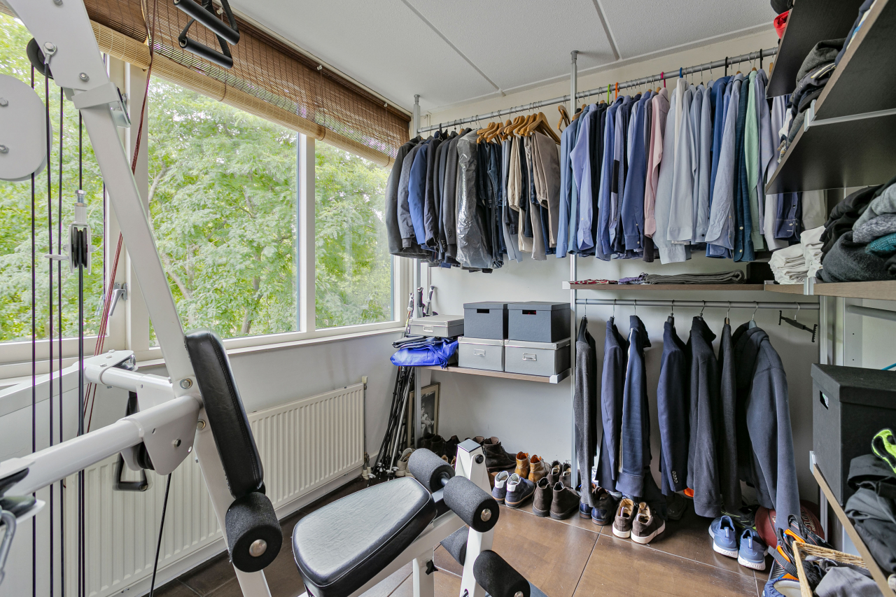 Aan de achterzijde ligt ook een royale slaapkamer tevens met grote ramen en met een inloopkast met wasbak (eerder Doka geweest). Er is een deur naar het balkon. Deze uitbouw of opbouw is in 2000 gerealiseerd.De complete badkamer is volledig betegeld en voorzien van een ligbad en inloopdouche met thermostaatkraan, een breed wastafelmeubel, designradiator en 2e toilet.