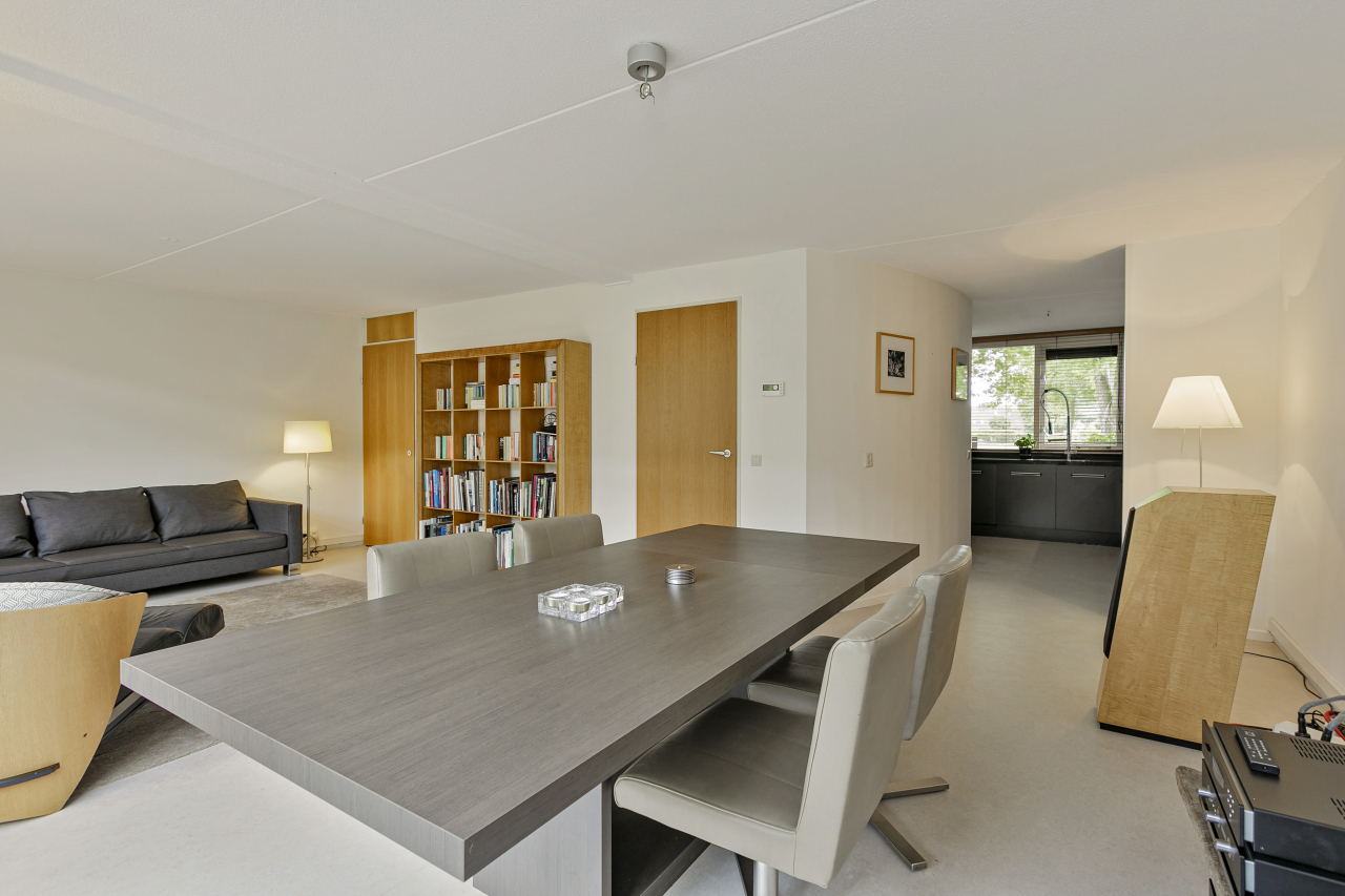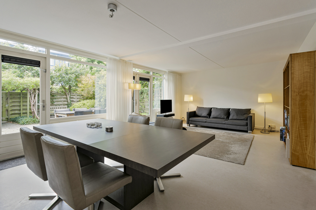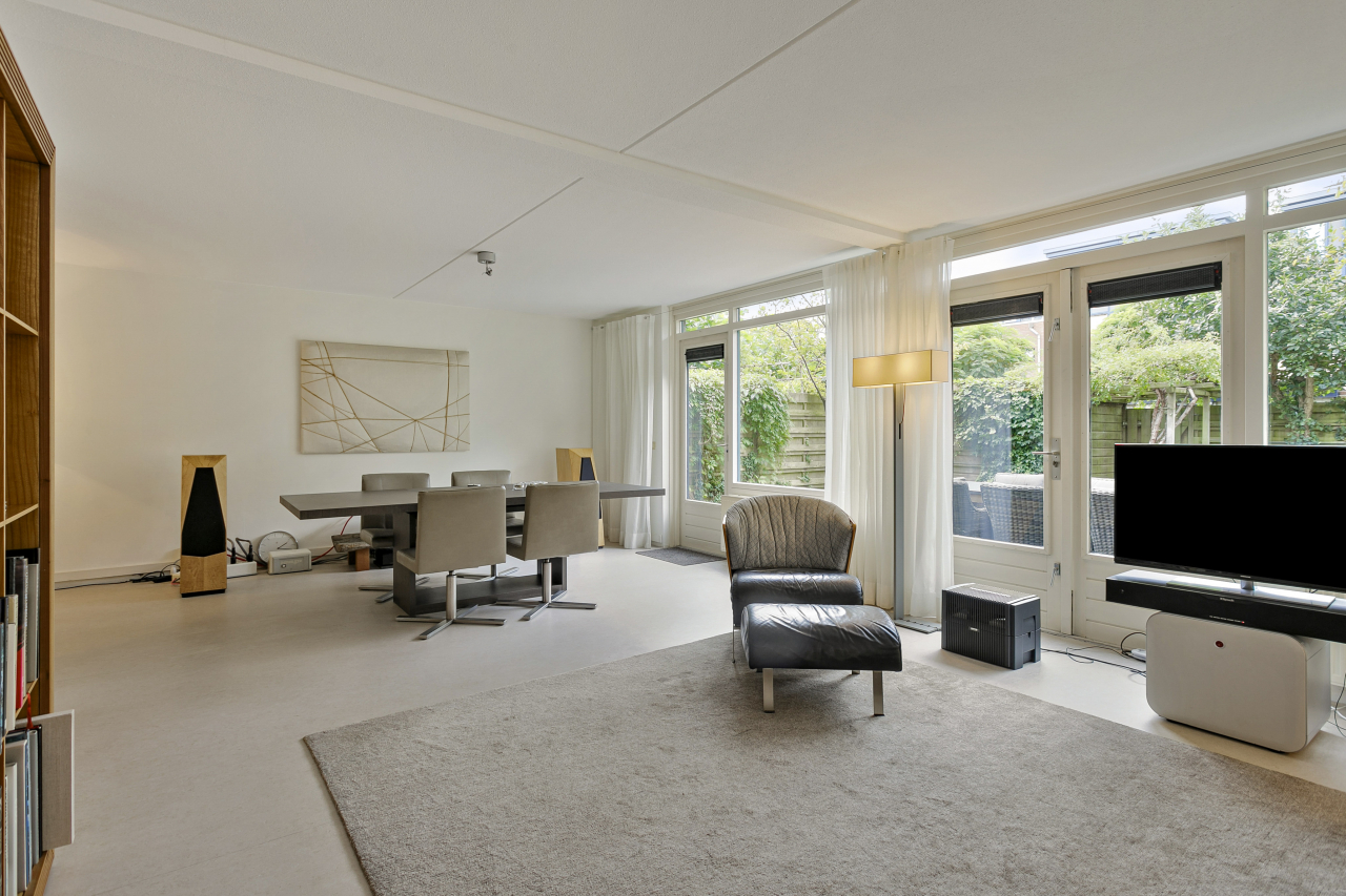 De ruime, lichte woonkamer met lichte marmoleum vloer heeft aan de achterzijde diverse ramen en openslaande deuren naar de tuin op het Westen met achterom.