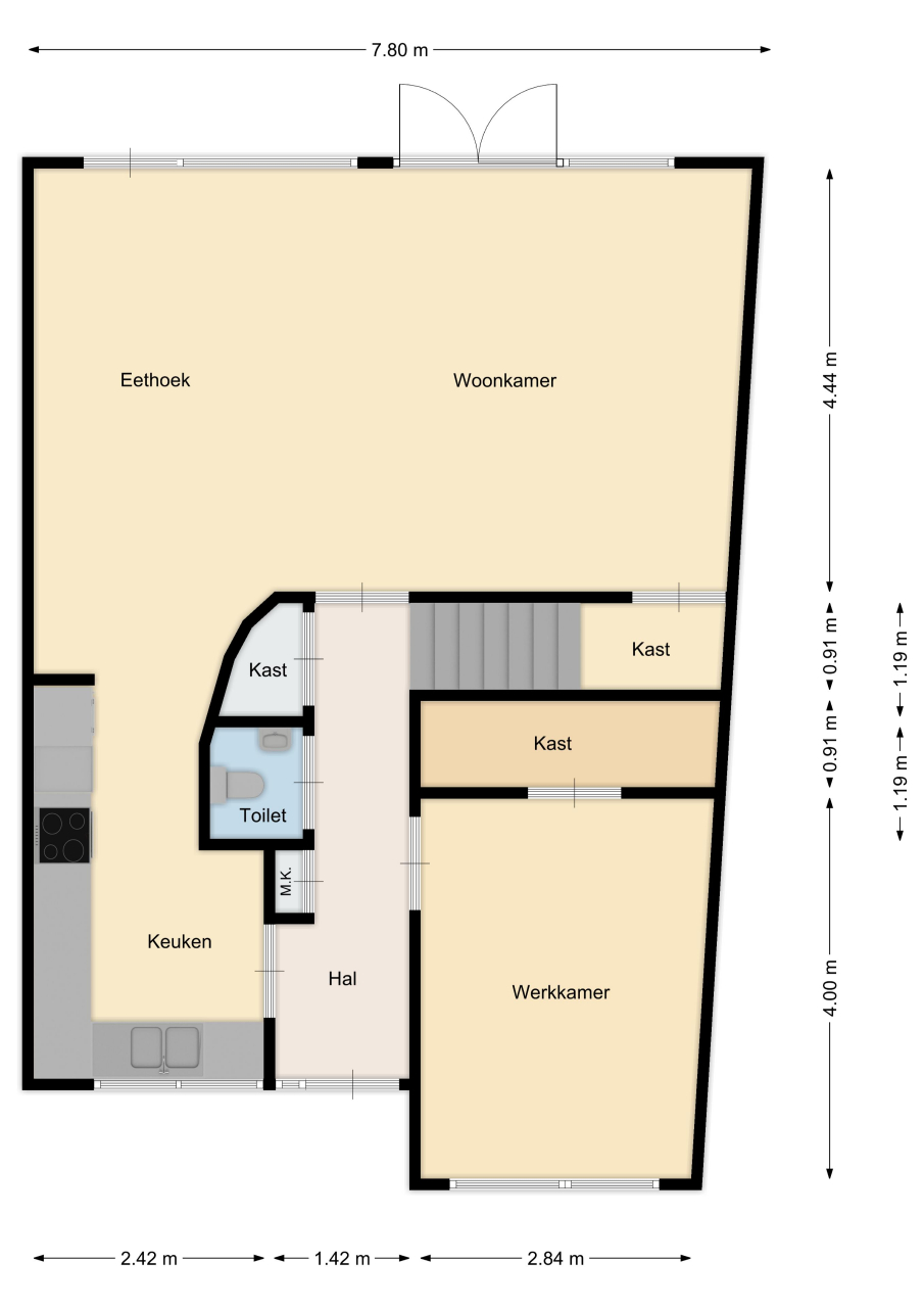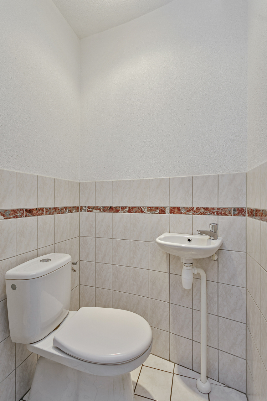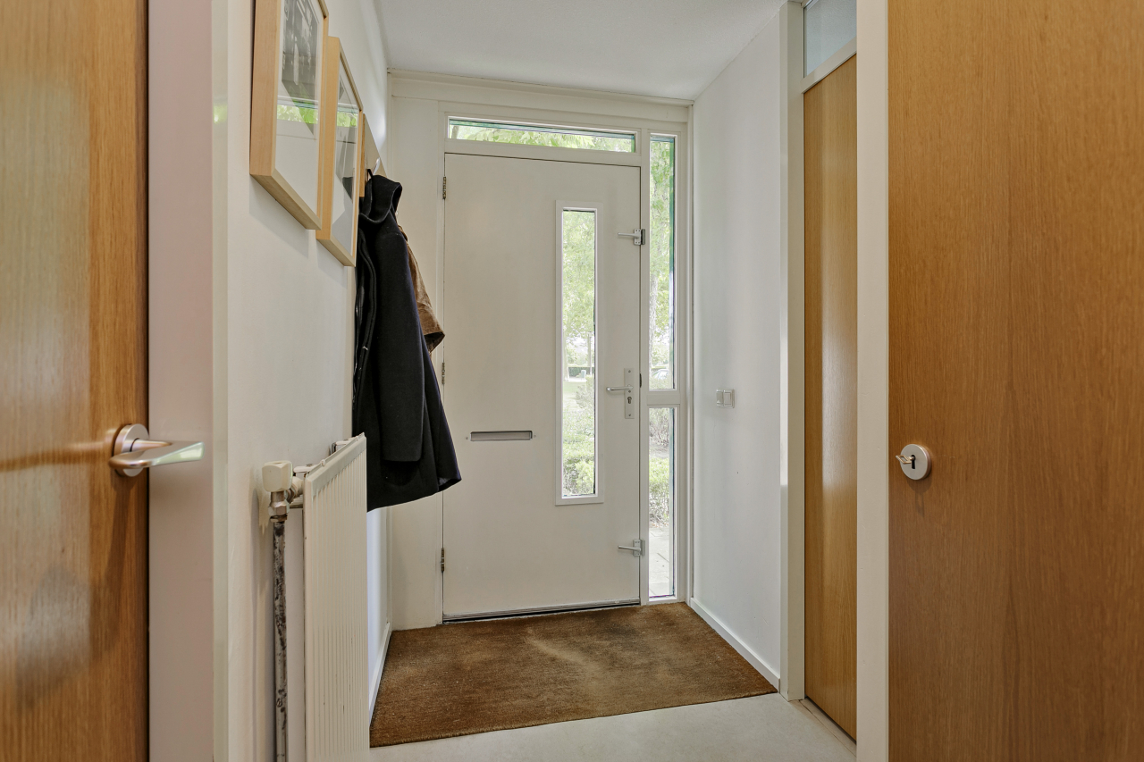 De entree van de woning is aan de voorzijde naast de kantoorruimte. Deze werk/kantoorruimte is geschikt voor diverse doeleinden. Vanuit de hal met trapopgang, garderobekast, meterkast en toilet met fonteintje zijn de kantoorruimte, woonkamer en keuken bereikbaar.