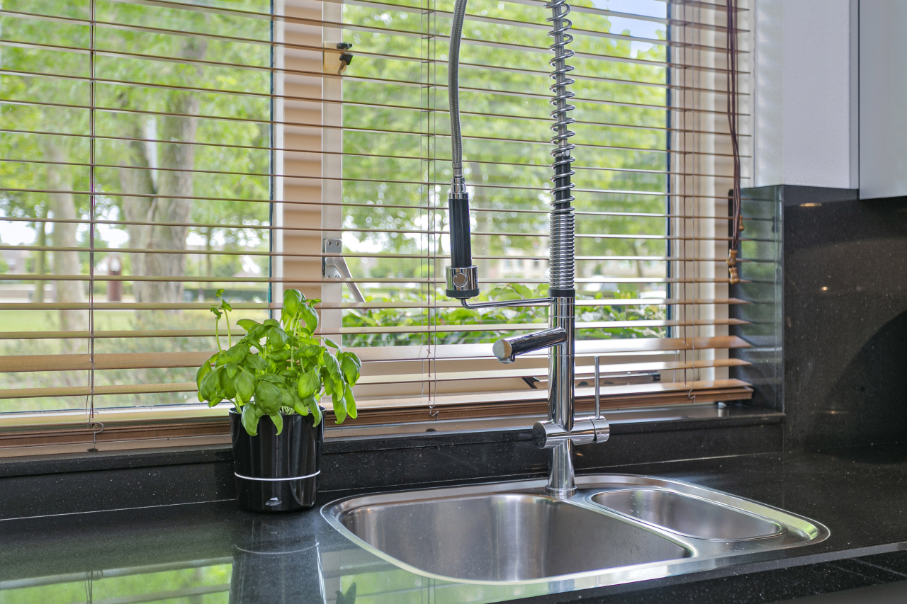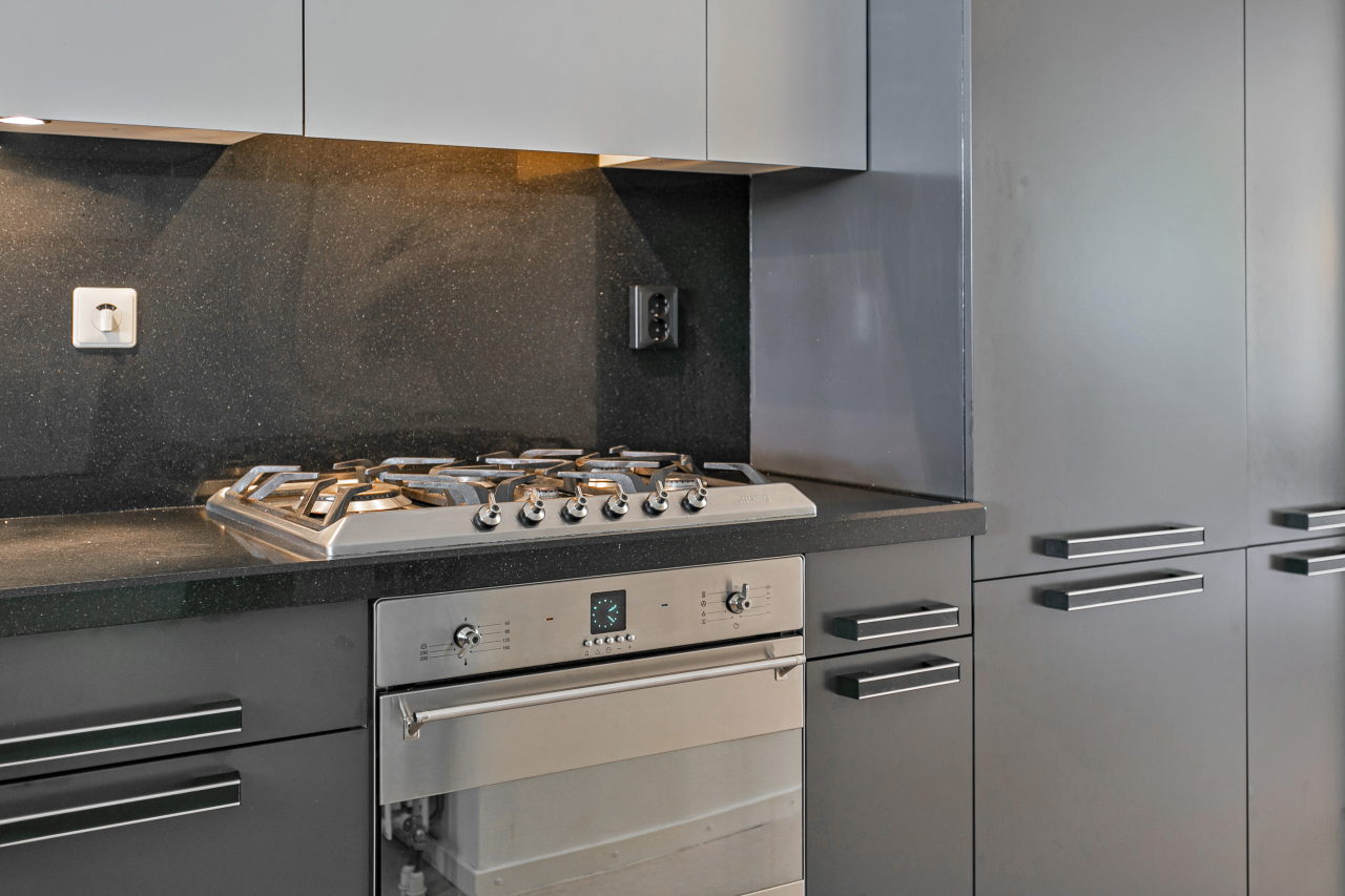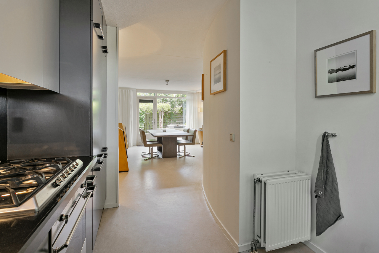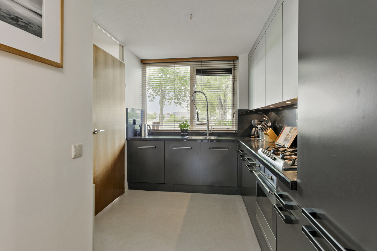 Bij de keuken bevindt zich de eethoek. De keuken in L-vorm met granito aanrechtblad is ingericht met 1,5 spoelbak met fraaie kraan en diverse inbouwapparatuur zoals: een Smeg 5-pits gastoestel met Smeg oven en Atag afzuigkap, Miele vaatwasser, Siemens koelkast en vriezer. Aan de voorzijde van de keuken is een deur naar de gang.